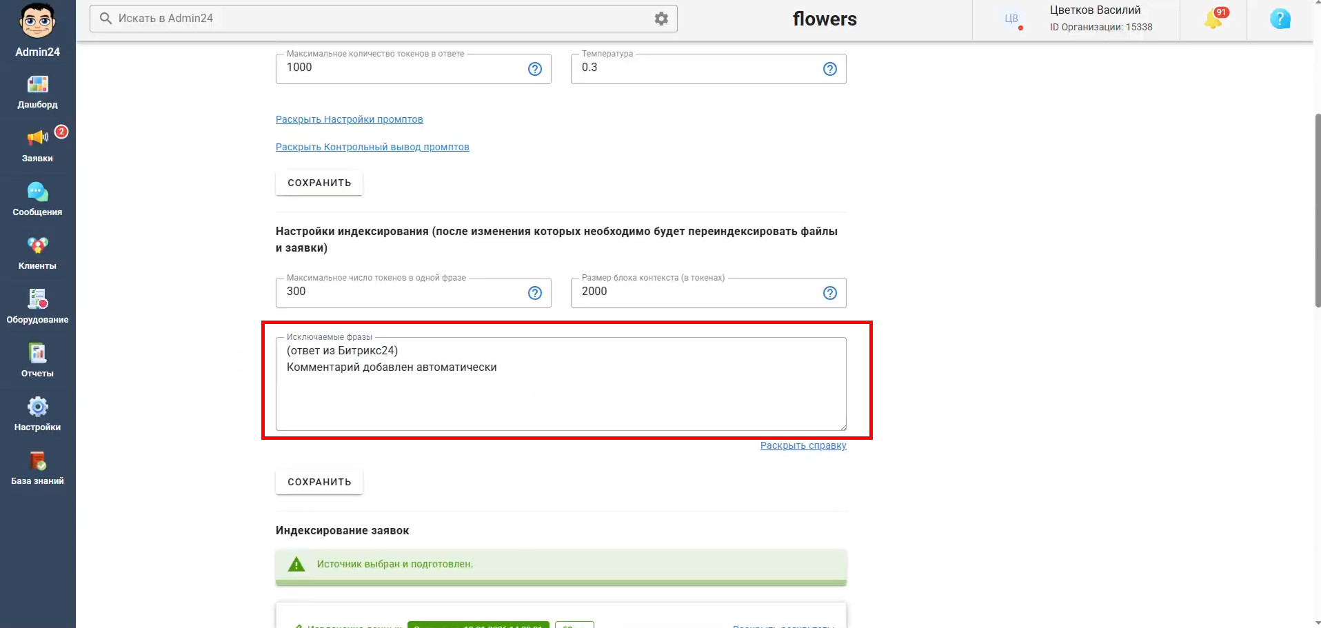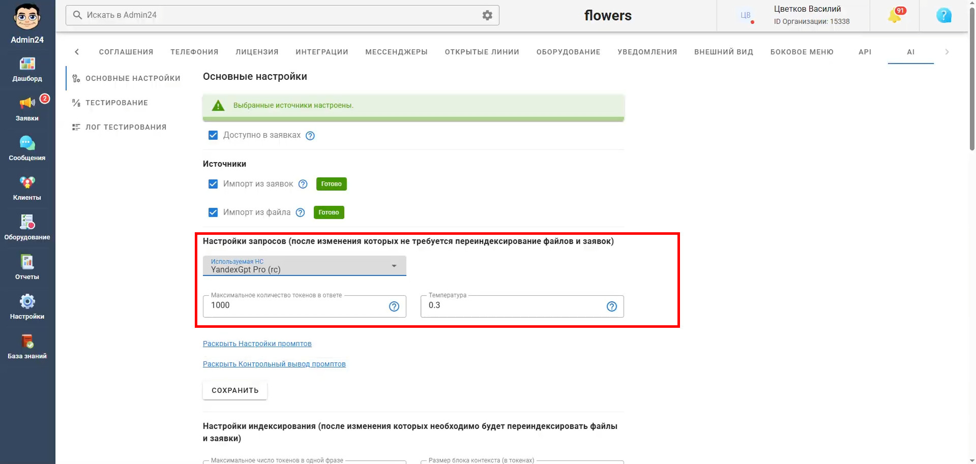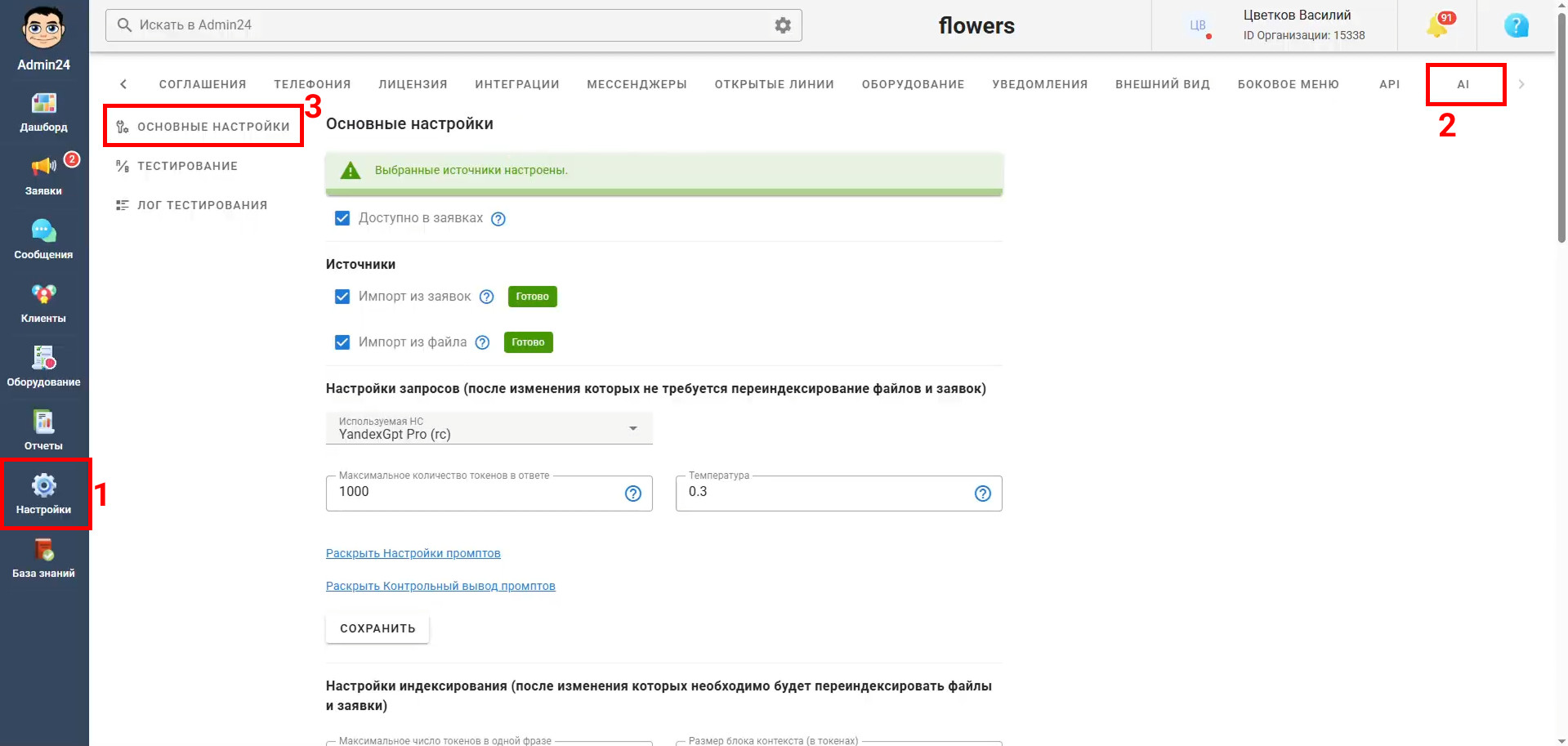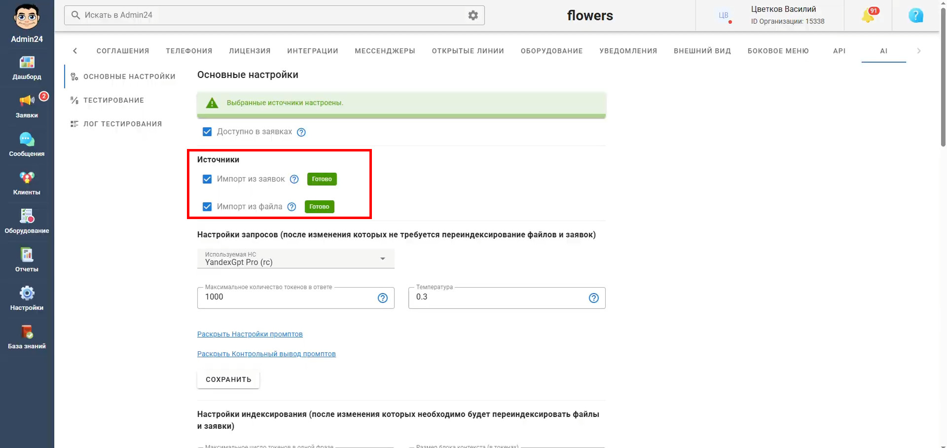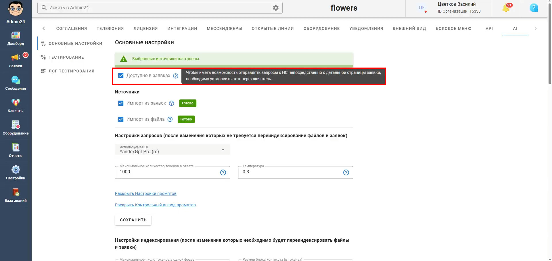 Чтобы сотрудники могли использовать искусственный интеллект для работы с клиентами в заявках, необходимо включить опцию «Доступно в заявках» в основных настройках: