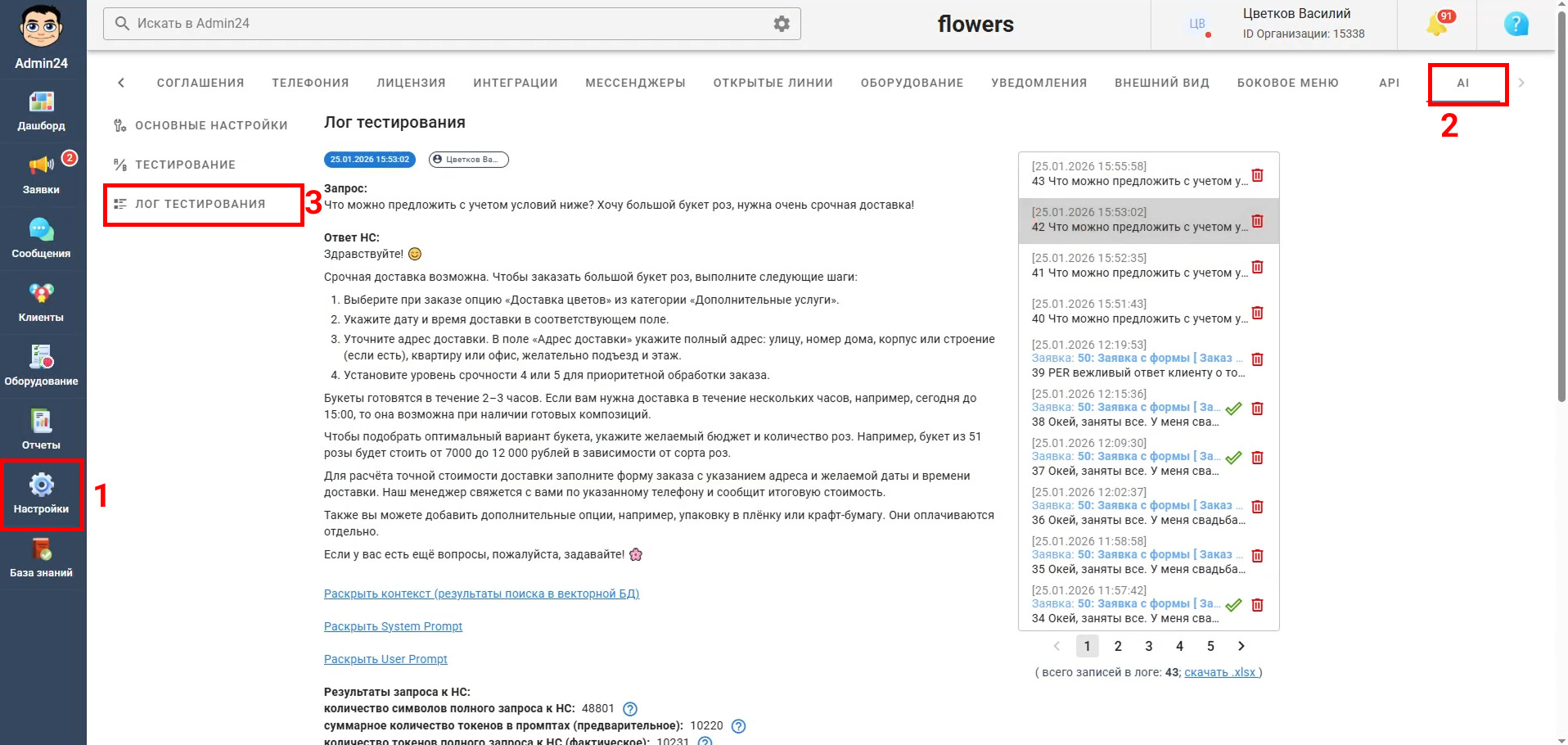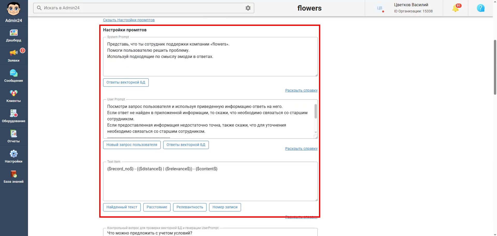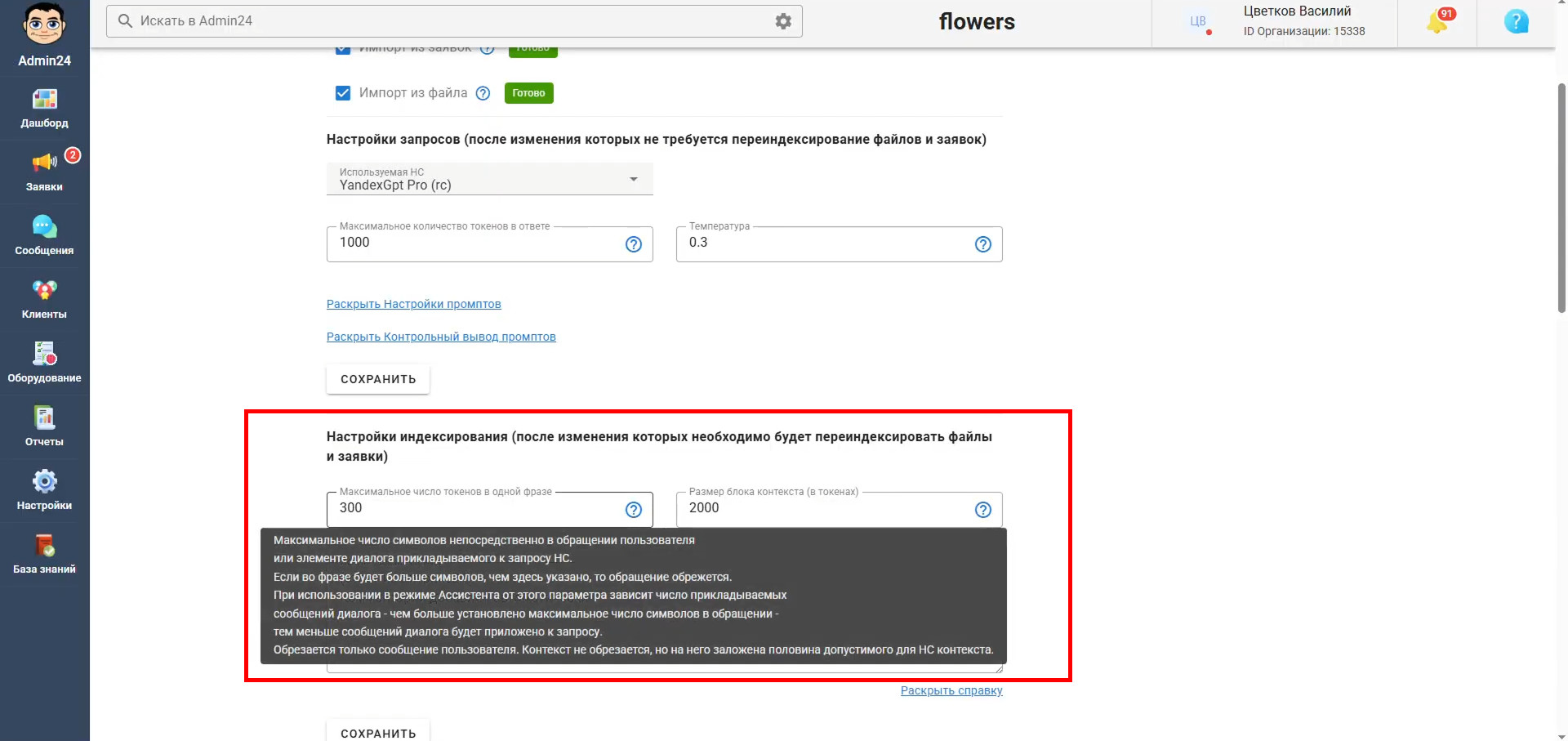 Ниже можно указать источники данных, на основании которых ИИ будет формировать ответы. Можно выбрать 2 варианта: Важно! Оба источника данных можно использовать одновременно. В основных настройках также можно выбрать используемую для работы нейросеть. Важно! Мы рекомендуем использовать Яндекс.GPT PRO. Также здесь можно выбрать параметры генерации ответа: степень развернутости и температуру (насколько креативными и случайными будут ответы модели). Дополнительно настраиваются: Также в настройках необходимо задать контрольный вопрос для проверки корректности работы ИИ. В основных настройках предусмотрено управление: Отдельный блок отвечает за индексацию заявок — она позволяет автоматически переиндексировать все заявки, добавляемые в базу знаний для ИИ-агента. Помимо заявок в Админ24 можно загрузить произвольные файлы, которые также будут служить основой для формирования ответов при помощи нейросети. Чтобы попасть в раздел тестирования работы ИИ-агента, нужно перейти в раздел «Настройки» → «AI» → «Тестирование». Для проверки работы ИИ-агента предусмотрены разные режимы тестирования: Перейдя в раздел «Настройки» → «AI» → «Лог тестирования», вы можете посмотреть историю всех взаимодействий с нейросетью: как из заявок, так и из режима тестирования. К ИИ-агенту можно обратиться непосредственно из карточки заявки. Самый простой способ взаимодействия — через выпадающее меню конкретного комментария клиента. Для этого: После этого ИИ автоматически сформулирует вариант ответа и подставит его в поле для отправки клиенту. Полученный текст можно отредактировать перед отправкой. Также работать с ИИ-агентом можно через отдельную вкладку в карточке заявки. Для этого перейдите в карточку заявки и откройте вкладку «Нейронная сеть». Здесь можно работать с ИИ-агентом двумя способами: Не обязательно пользоваться только готовыми сценариями. В качестве запроса можно указать любой произвольный текст, и нейросеть сформирует ответ с учетом настроек ИИ-агента и используемых источников данных. В рамках обновления также была проведена оптимизация работы ИИ-агента и подготовлена база для дальнейшего расширения функциональности. Следите за новостями Admin24, чтобы не пропустить следующие обновления.