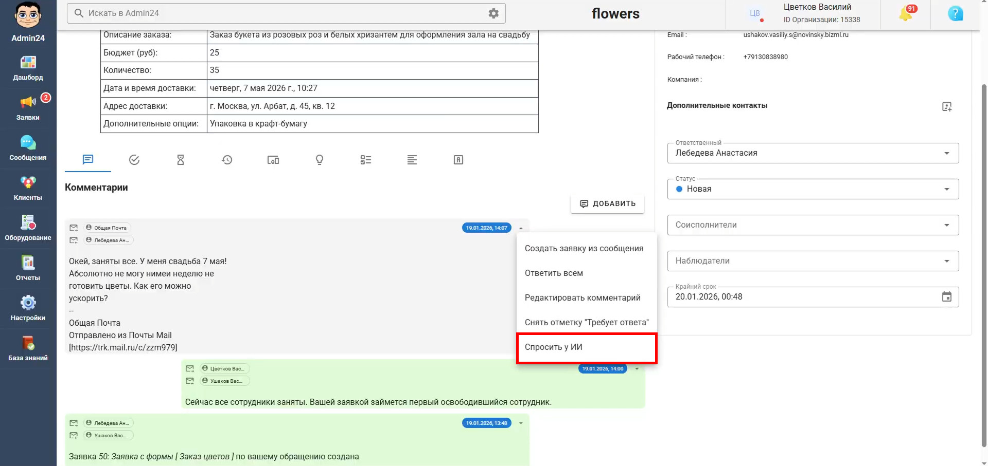 Работа с ИИ из комментария в карточке заявки