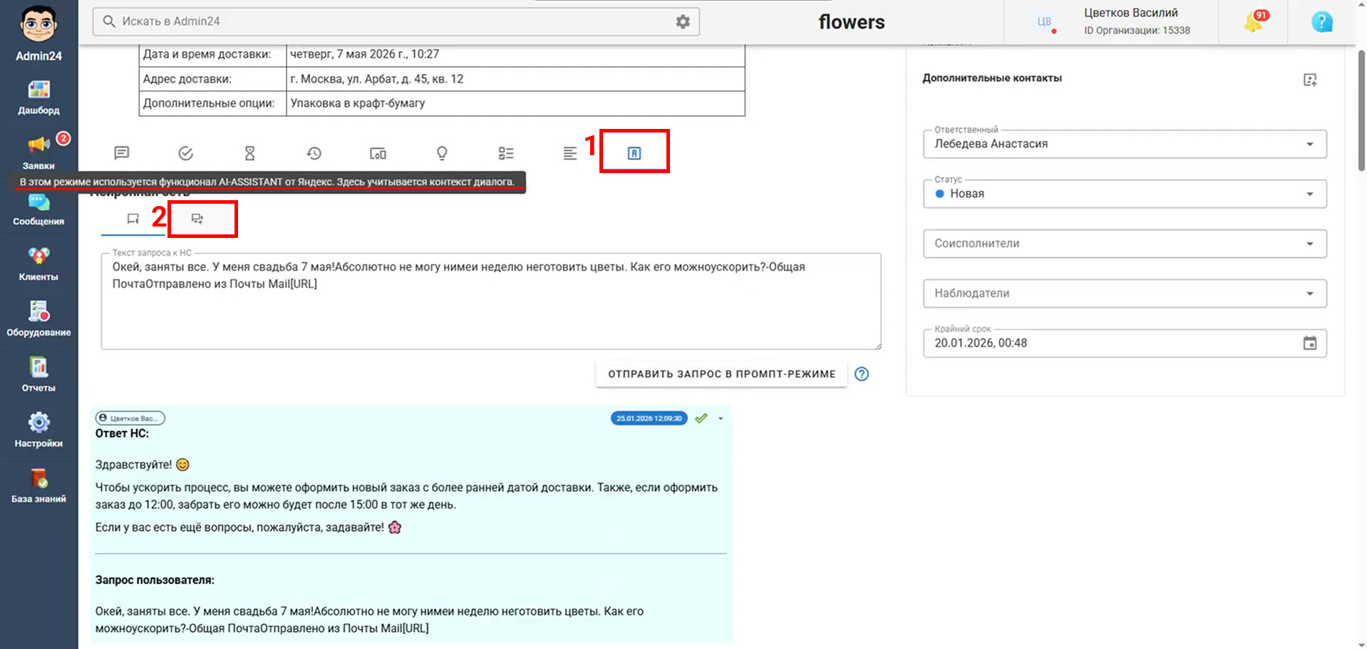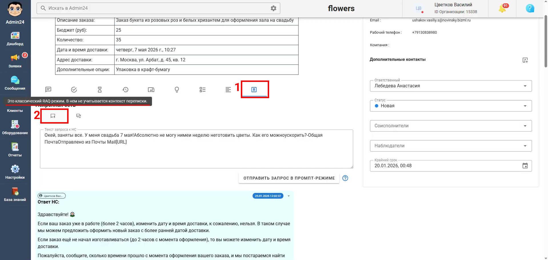 Работа с ИИ из раздела «Нейронная сеть» в карточке заявки