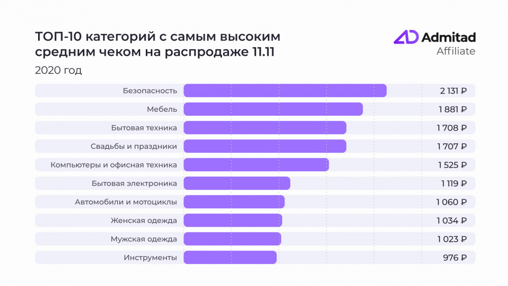11 ноября — Всемирный день шопинга и дата главной распродажи китайского маркетплейса. И с каждым годом этот день становится все популярнее. По данным Admitad Affiliate, корзина покупателей на распродаже прошлого года выросла на 30% по сравнению с 2019 годом, а средний чек увеличился на 39% и составил 1170 рублей. Согласно статистике AliExpress Россия, общая сумма, оставленная соотечественниками на сайте маркетплейса, составила 19,3 млрд рублей, из которых 4 млрд рублей россияне потратили только в первый час распродажи.