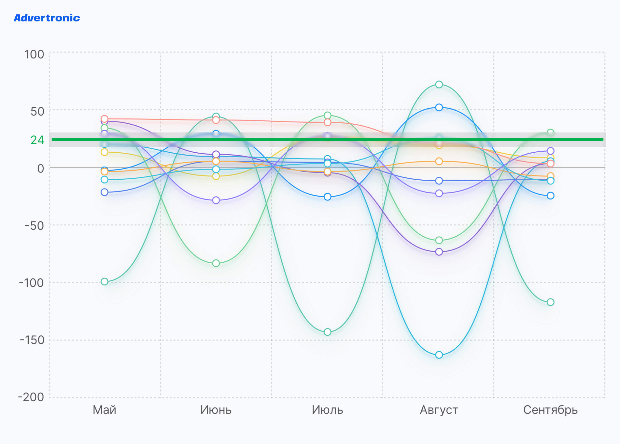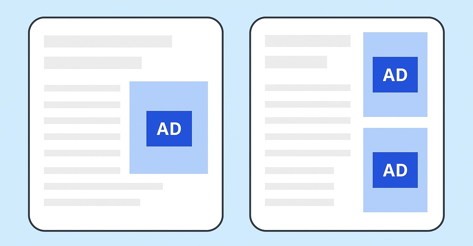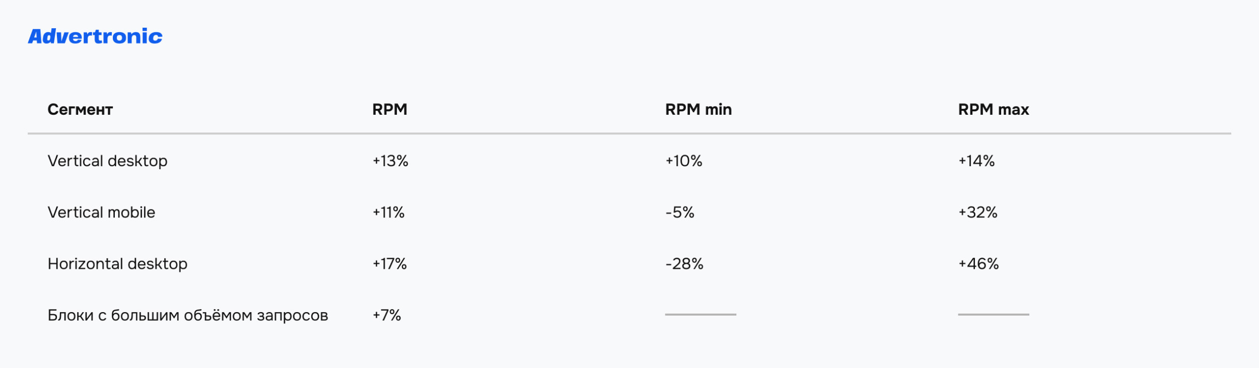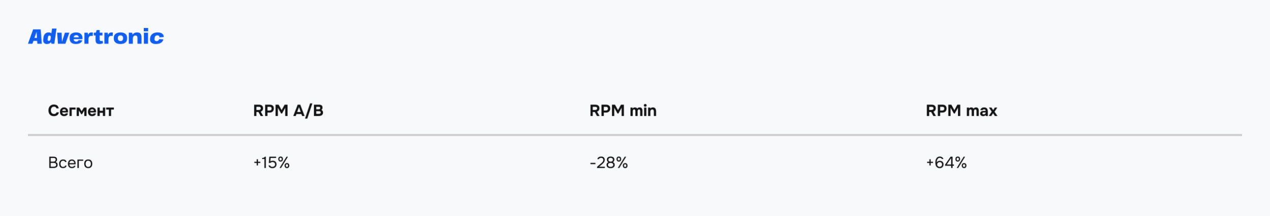 Advertronic не менял источники трафика или контент. Эксперимент строился по принципу «оставил и забыл». Сравнивали три пары форматов: Компания использовала взвешенные оценки (по объёму запросов), чтобы исключить смещение средних. Метрика успеха — RPM (доход на 1000 запросов). Она нормализует разный трафик и учитывает ключевые драйверы монетизации: Таким образом, RPM отражает реальную выручку и делает возможным корректное сравнение между разными форматами и устройствами. Тест длился с мая по сентябрь 2025 года. На каждом сайте Advertronic делил трафик поровну: половина шла на вариант с одним большим блоком, другая — на вариант с несколькими небольшими. В среднем доход по схеме с несколькими блоками оказался на 15% выше. На некоторых плейсментах динамика сильно колебалась. В среднем прирост по месяцам составлял +24%, а просадки — около −42%. Проще говоря, в один месяц результат положительный, в другой отрицительный. Это из-за динамики рынка, на которую нужно сразу реагировать и корректировать стратегию. Но в этом эксперименте специально ничего не корректировали, смотрели, а что получится, если поставить и забыть. Однако потенциал схемы с несколькими блоками выше средних +15%, но для этого нужно постоянное A/B-тестирование и перераспределение трафика в пользу лидирующего варианта. Если просто разместить и не возвращаться к настройкам, рост составит около 15%, но с заметными колебаниями по месяцам. Если же заниматься этим ежедневно, то рост дохода достигает до 64% без выраженных спадов. В период теста удалось увеличить доход до 64%. Чтобы добиться такого эффекта, рекомендуется: Пунктов много и для этого нужна команда. Поэтому предлагаем сотрудничество с Advertronic — давно и успешно монетизируем сайты. Если готовы увеличивать доход, пишите!
