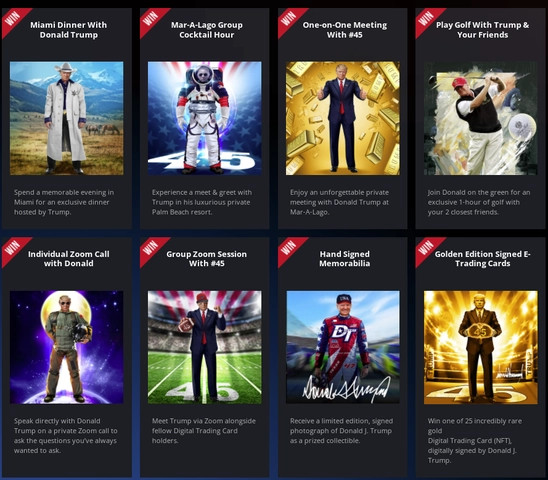 Стоимость каждой такой карточки составляет $99. При этом, приобретая хотя бы одну NFT-карточку, вы становитесь участником лотереи, в рамках которой можно выиграть ужин с Трампом, гольф на одной из гольф-трасс Трампа, личный звонок по Zoom, автограф бывшего президента и т.д. Стать счастливым обладателем одной или нескольких NFT-карточек из серии Trump Digital Trading Cards можно на сайте CollectTrumpCards.com. Источник: Aff1.ru