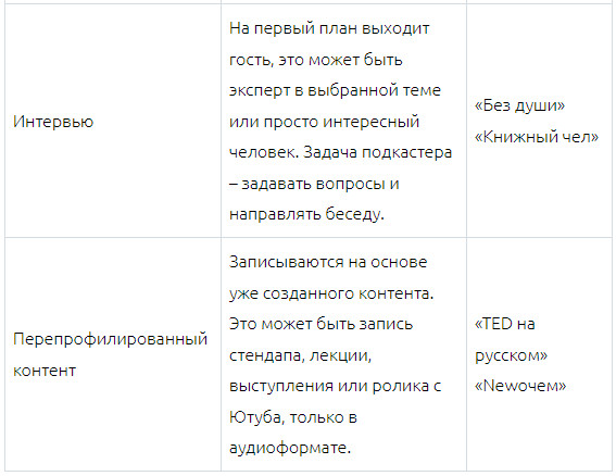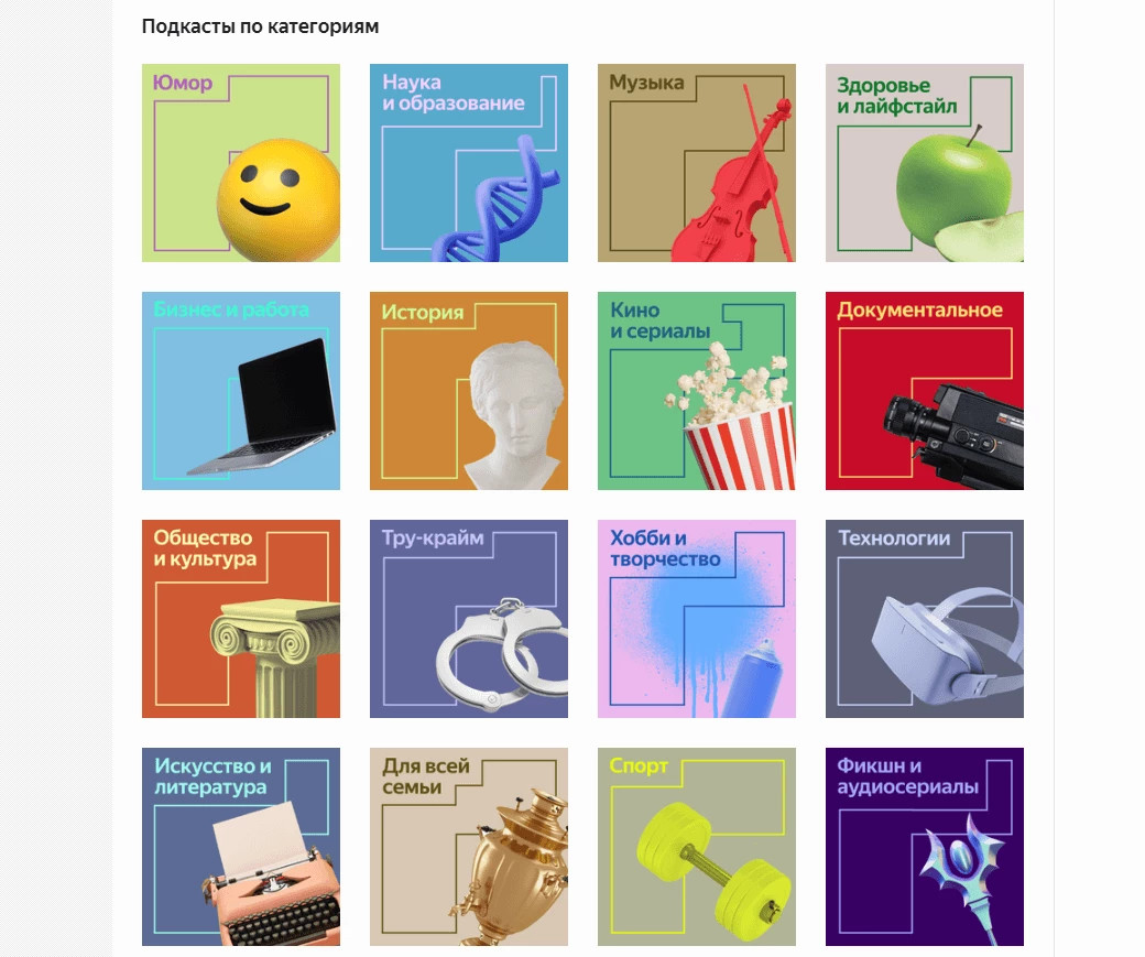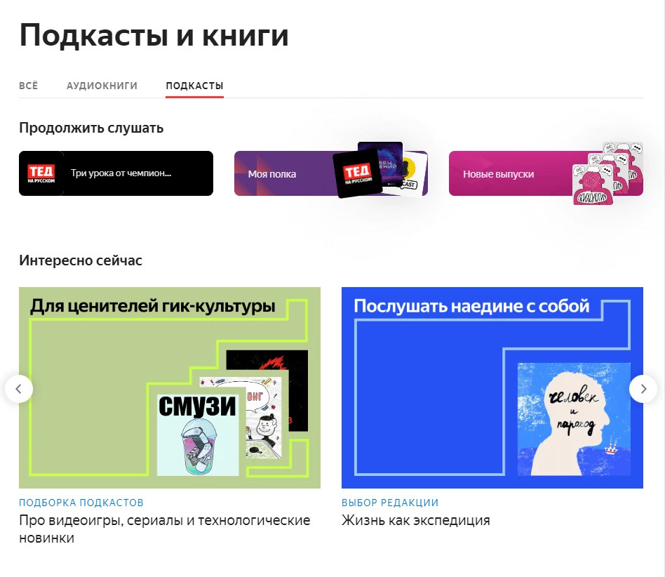 Чаще всего это разговорный контент, когда автор общается с приглашенным экспертом, или несколько ведущих обсуждают одну конкретную тему. Бывают подкасты о маркетинге, истории, кино, музыке, политике, технологиях, путешествиях. Например, вот подборка подкастов по категориям на Яндекс.Музыке: