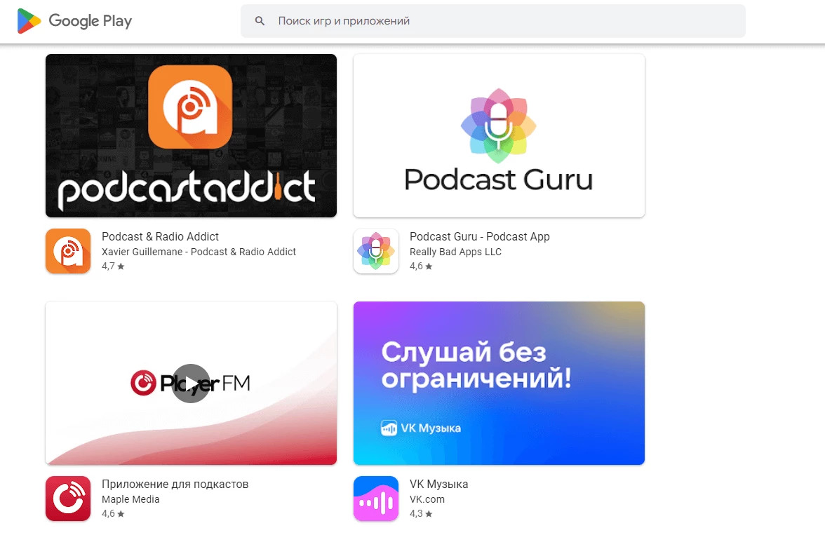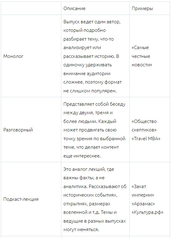 Всего выделяют 5 основных форматов, рассмотрим их в таблице вместе с примерами. При этом в каждом формате можно записать подкаст на любую тему. Например, подкасты о преступлениях в жанре True Crime можно найти и в формате интервью с экспертом, и в виде лекции. Новостные эпизоды записывают как подкастеры-одиночки, так и несколько ведущих в разговорном формате. Слушать подкасты можно на разных устройствах, от компьютера и смартфона до умной колонки и смарт-TV. Для этого существуют разные программы и сервисы, к самым популярным относятся: Среди действительно качественных видеохостингов можно выделить: У каждого ресурса есть плюсы и минусы — например, в Яндекс.Музыке можно слушать эпизоды оффлайн и подписываться на новые выпуски, а на сайтах подкастов есть комментарии и раздел популярных эпизодов. Подкасты — это полезно, интересно и эффективно. Компании, запуская свои трансляции, становятся ближе к аудитории, повышают доверие к бренду и могут заработать на рекламе. А как вы относитесь к подкастам и считаете ли их полезными? Можете поделиться своим мнением в комментариях. Читайте также: Блог, подкасты, видео YouTube — как эффективно рекламировать свой бизнес Источник: Aff1.ru