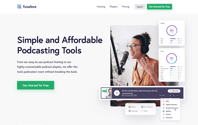 Fusebox — полезный сервис, созданный подкастерами для подкастеров. Это не совсем хостинг, а плагин для WordPress, где можно записывать подкасты и сразу выгружать на собственный сайт. Поэтому подходит авторам, у которых уже есть свой ресурс. Есть ограниченная бесплатная версия.