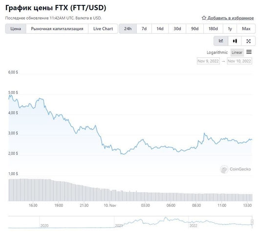 Дело в том, что во вторник, 8 ноября крупнейшая криптовалютная биржа в мире Binance заявила о намерении приобрести другую торговую площадку FTX, которая столкнулась с серьезным кризисом ликвидности. После этой новости FTT — служебный токен FTX — рухнул на 75%, а сейчас его курс и вовсе составляет всего $2,79.