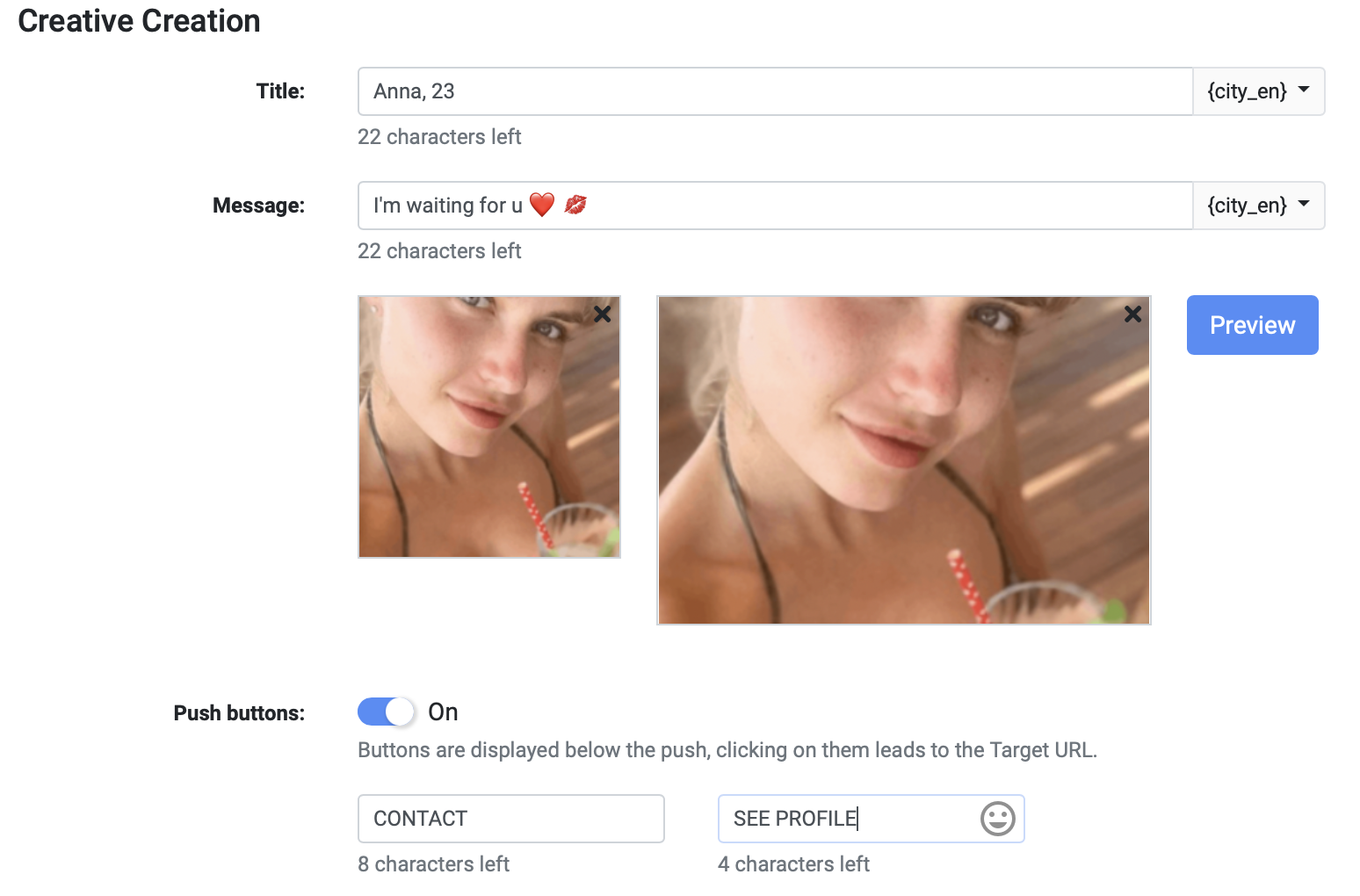 Для креативов на дейтинг в заголовке рекомендуем писать имя и возраст девушки, а в основном тексте — имитацию ее сообщения. Задача креатива — создать видимость реального уведомления из какой-либо социальной сети: для этого на иконку поставьте картинку, похожую на значок популярных социальных сетей, а в качестве основного изображения используйте фото привлекательной девушки. Обязательно тестируйте разные подходы к тексту и картинкам, чтобы определить, что лучше конвертит на конкретном ГЕО в определенном аднетворке.