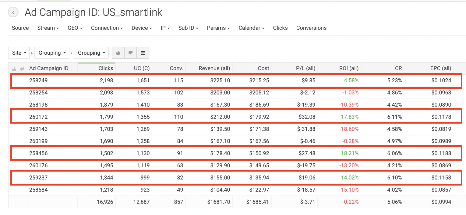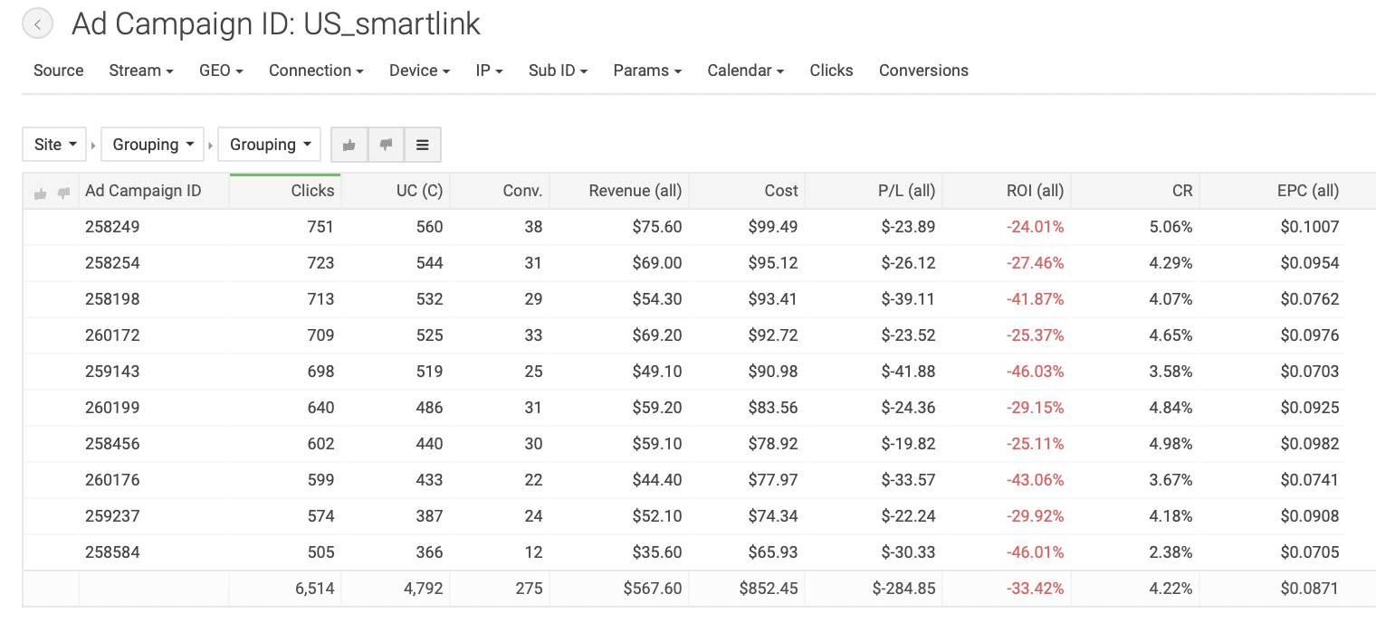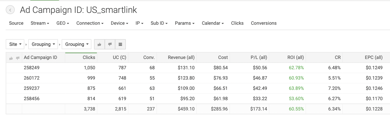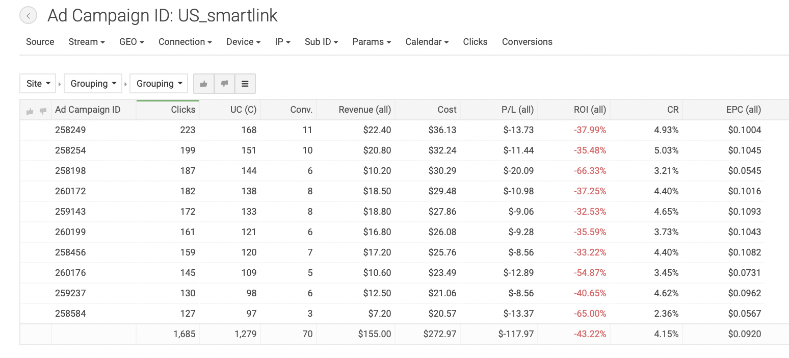 Для создания кампании в TacoLoco кликаем на «New campaign» на панели слева. Пишем название рекламной кампании, которое было бы удобно для поиска: в нашем случае «US_smartlink». Формат рекламы — пуш уведомления, CPC модель. Выбираем тип трафика — дейтинг; далее вставляем ссылку из трекера и настраиваем капы, как и в прошлых отливах. В TacoLoco можно добавить по одному креативу к каждой РК, что мы и сделали. Всего создали 10 кампаний с разными креативами, чтобы понять, какие показывают лучшие результаты; с прошлых отливов нам уже известно, креативы какого типа нужны. Далее добавили кнопки (push buttons), так же, как и в прошлом кейсе, — они необходимы для привлечения внимания пользователей. Задали названия «CONTACT» и «SEE PROFILE»: такие фразы содержат призыв к действию (call-to-action) и максимально точно описывают цель клика на пуш. Появляются эти кнопки под пуш уведомлением. Далее — настройка таргетингов и бида. Для работы мы выбрали мобильный трафик и операционную систему Android, так как, по нашему опыту, такая связка дает наиболее высокие результаты. Выбранная страна — США. Теперь укажем ставку, с которой начнем отливать кампании; для наших таргетингов система порекомендовала следующие: Минимальный CPC — $0.01. Средний CPC — $0.147. Рекомендованный CPC — $0.162. Мы решили начать с рекомендованной ставки. Далее оценим объемы трафика и ROI и при необходимости скорректируем. В продвинутых настройках предлагается выбрать язык, но мы оставили все, чтобы не ограничивать трафик. На следующем этапе нужно определить бюджет. Поставили дневной бюджет $150: посмотрим, будет ли он откручиваться, или наоборот, начнет ограничивать трафик. Общий бюджет не задавали, так как не знаем точно, сколько по времени будет откручиваться кампания и какие будут результаты. Расписание не настраивали, чтобы кампания работали 24 часа в сутки, 7 дней в неделю. Если позже увидим, что РК работает эффективнее в определенные временные интервалы, то старгетируемся по конкретным дням или часам, но для этого, по нашему опыту, необходимо собрать очень много статистики. Далее создали новую группу кампаний и назвали её «US_Smartlink», чтобы было удобнее сортировать кампании в статистике. Первый срез статистики мы сделали уже через 12 часов после запуска, увидев, что все кампании работают с отрицательными показателями. За 12 часов мы получили следующие результаты: Затраты: $272.97. Профит: $-117.97. ROI по всем кампаниям: −43,22%. Мы сделали вывод, что рекомендованная ставка оказалась слишком высока в нашем запуске, и понизили бид на всех кампаниях до $0.12. Примечание: несмотря на то, что EPC (earn-per-click, заработок с одного клика) для кампаний в среднем получился $0.0920, не забываем, что РК отливались всего 12 часов. Ситуация может измениться, поэтому не понижаем ставку резко. Также мы посмотрели срезы статистики по операционным системам, времени и IP, но не проводили по ним оптимизацию, поскольку полученные данные не были показательными. Дневной бюджет на кампаниях — меньше $150, оставляем его неизменным. Мы отливали трафик еще 1,5 дня и получили следующие результаты: Затраты: $852.45. Профит: $-284.85. ROI по всем кампаниям: −33,42%. Нам удалось повысить ROI, но кампании все еще приносят убытки. Ясно, что, продолжая отливать по текущей ставке, мы не сможем получить положительные результаты. Средний EPC теперь составляет $0.0871. На данный момент мы получили 6514 кликов, такого количества 