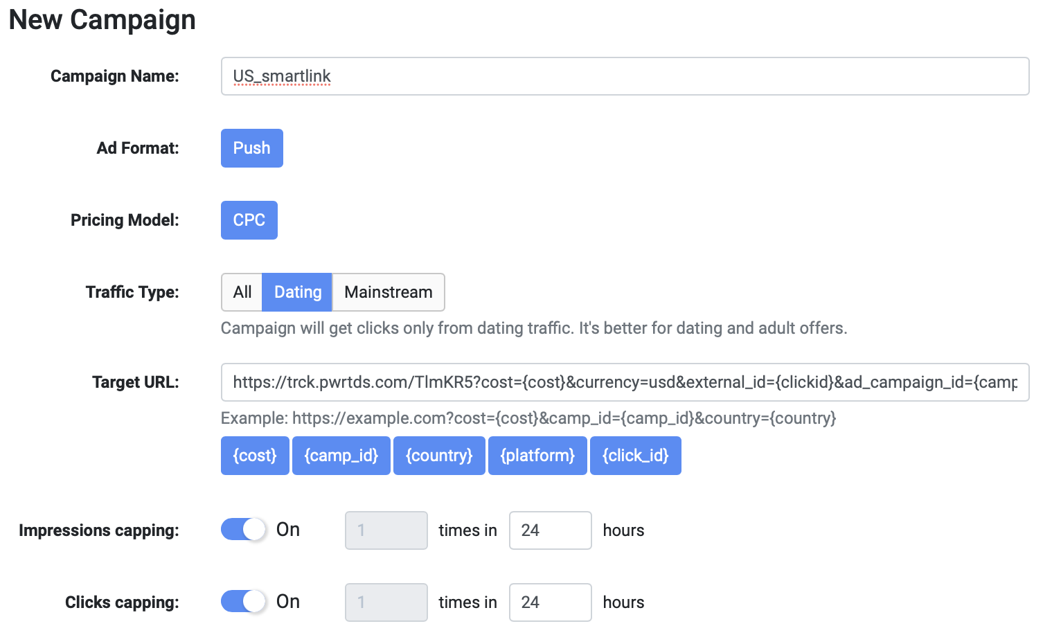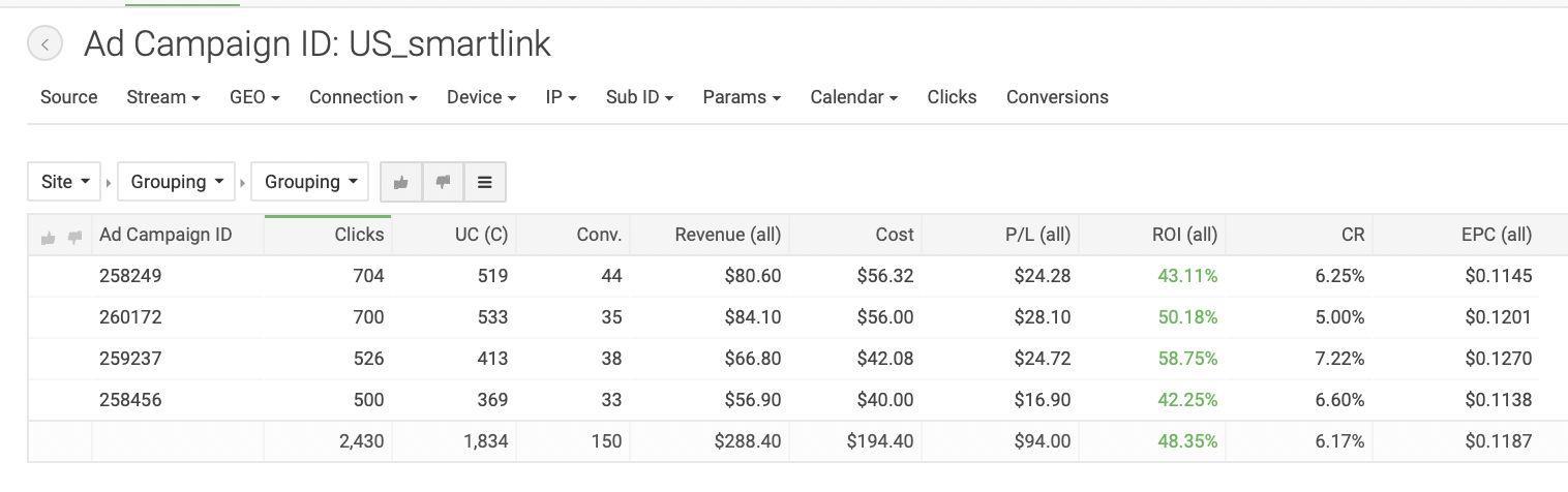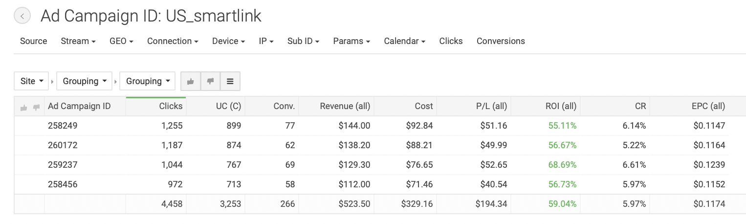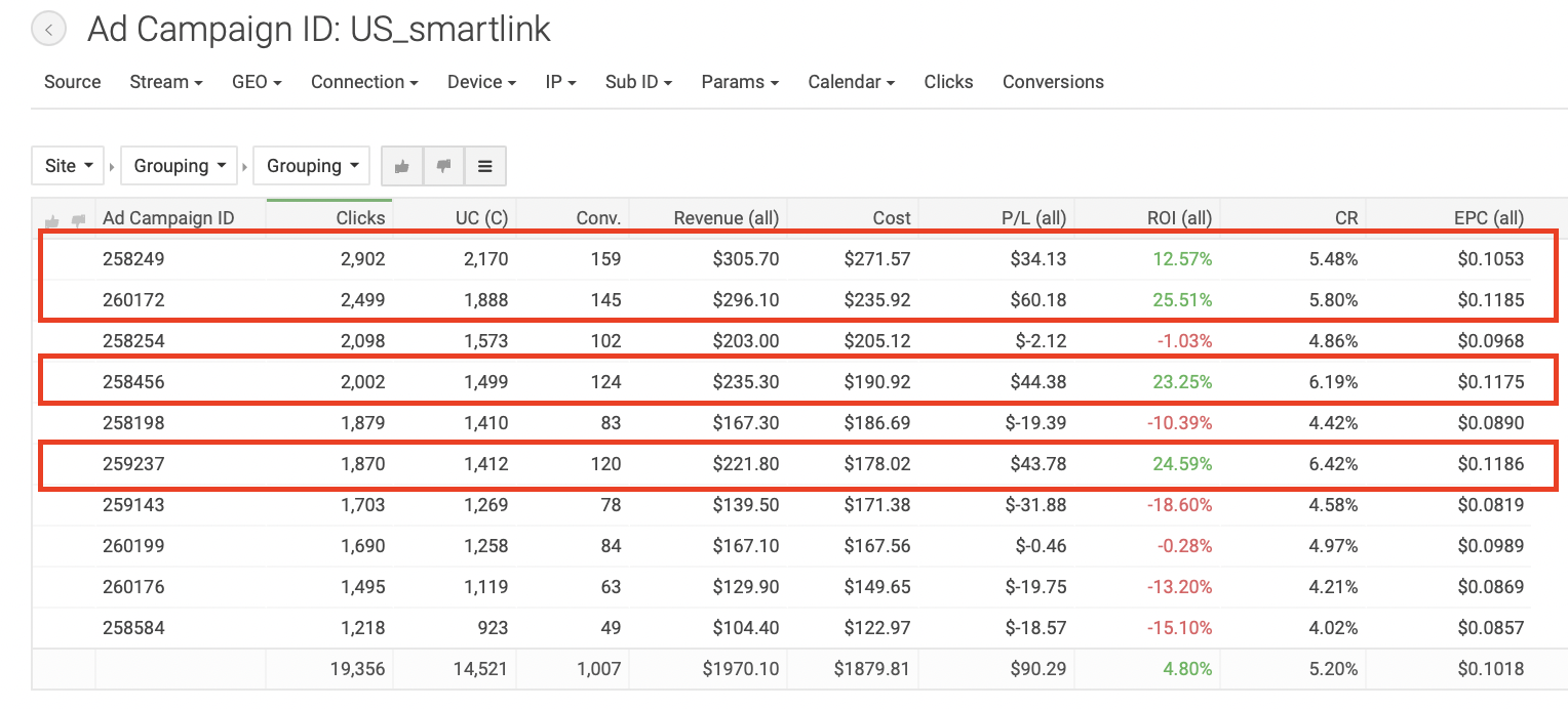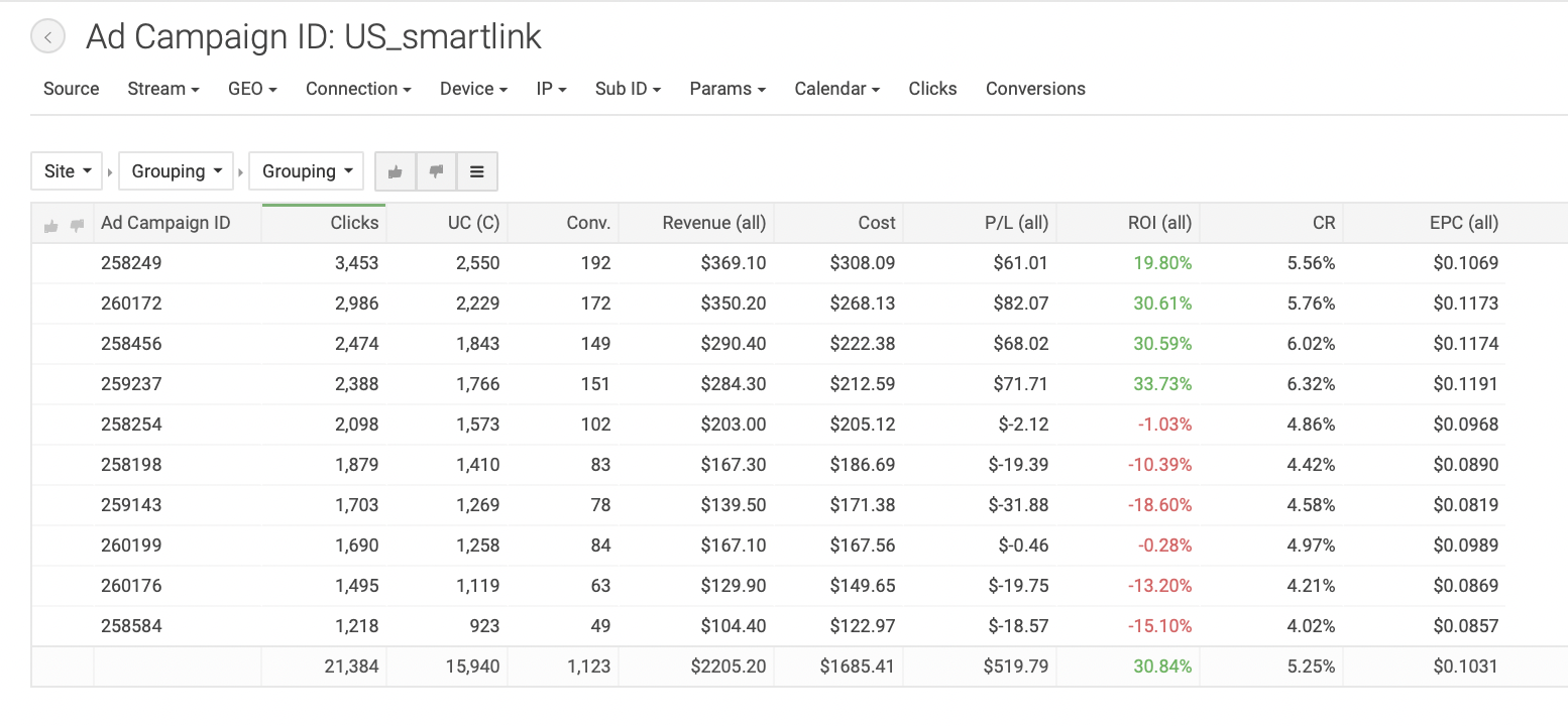 Для создания кампании в TacoLoco кликаем на «New campaign» на панели слева. Пишем название рекламной кампании, которое было бы удобно для поиска: в нашем случае «US_smartlink». Формат рекламы — пуш уведомления, CPC модель. Выбираем тип трафика — дейтинг; далее вставляем ссылку из трекера и настраиваем капы, как и в прошлых отливах. В TacoLoco можно добавить по одному креативу к каждой РК, что мы и сделали. Всего создали 10 кампаний с разными креативами, чтобы понять, какие показывают лучшие результаты; с прошлых отливов нам уже известно, креативы какого типа нужны. Далее добавили кнопки (push buttons), так же, как и в прошлом кейсе, — они необходимы для привлечения внимания пользователей. Задали названия «CONTACT» и «SEE PROFILE»: такие фразы содержат призыв к действию (call-to-action) и максимально точно описывают цель клика на пуш. Появляются эти кнопки под пуш уведомлением. Далее — настройка таргетингов и бида. Для работы мы выбрали мобильный трафик и операционную систему Android, так как, по нашему опыту, такая связка дает наиболее высокие результаты. Выбранная страна — США. Теперь укажем ставку, с которой начнем отливать кампании; для наших таргетингов система порекомендовала следующие: Минимальный CPC — $0.01. Средний CPC — $0.147. Рекомендованный CPC — $0.162. Мы решили начать с рекомендованной ставки. Далее оценим объемы трафика и ROI и при необходимости скорректируем. В продвинутых настройках предлагается выбрать язык, но мы оставили все, чтобы не ограничивать трафик. На следующем этапе нужно определить бюджет. Поставили дневной бюджет $150: посмотрим, будет ли он откручиваться, или наоборот, начнет ограничивать трафик. Общий бюджет не задавали, так как не знаем точно, сколько по времени будет откручиваться кампания и какие будут результаты. Расписание не настраивали, чтобы кампания работали 24 часа в сутки, 7 дней в неделю. Если позже увидим, что РК работает эффективнее в определенные временные интервалы, то старгетируемся по конкретным дням или часам, но для этого, по нашему опыту, необходимо собрать очень много статистики. Далее создали новую группу кампаний и назвали её «US_Smartlink», чтобы было удобнее сортировать кампании в статистике. Первый срез статистики мы сделали уже через 12 часов после запуска, увидев, что все кампании работают с отрицательными показателями. За 12 часов мы получили следующие результаты: Затраты: $272.97. Профит: $-117.97. ROI по всем кампаниям: −43,22%. Мы сделали вывод, что рекомендованная ставка оказалась слишком высока в нашем запуске, и понизили бид на всех кампаниях до $0.12. Примечание: несмотря на то, что EPC (earn-per-click, заработок с одного клика) для кампаний в среднем получился $0.0920, не забываем, что РК отливались всего 12 часов. Ситуация может измениться, поэтому не понижаем ставку резко. Также мы посмотрели срезы статистики по операционным системам, времени и IP, но не проводили по ним оптимизацию, поскольку полученные данные не были показательными. Дневной бюджет на кампаниях — меньше $150, оставляем его неизменным. Мы отливали трафик еще 1,5 дня и получили следующие результаты: Затраты: $852.45. Профит: $-284.85. ROI по всем кампаниям: −33,42%. Нам удалось повысить ROI, но кампании все еще приносят убытки. Ясно, что, продолжая отливать по текущей ставке, мы не сможем получить положительные результаты. Средний EPC теперь составляет $0.0871. На данный момент мы получили 6514 кликов, такого количества 