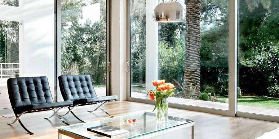 - ПВХ. Пластиковые портальные раздвижные системы остекления используются в основном в жилых проектах. В конструкциях, как правило, устанавливается до 4-х створок подряд. ПВХ-профили обычно значительно шире любых металлических. Поверхность пластика можно оставлять в классическом белом цвете, либо ламинировать декоративными плёнкам с эффектами покраски, оттенков и структуры дерева или металла.