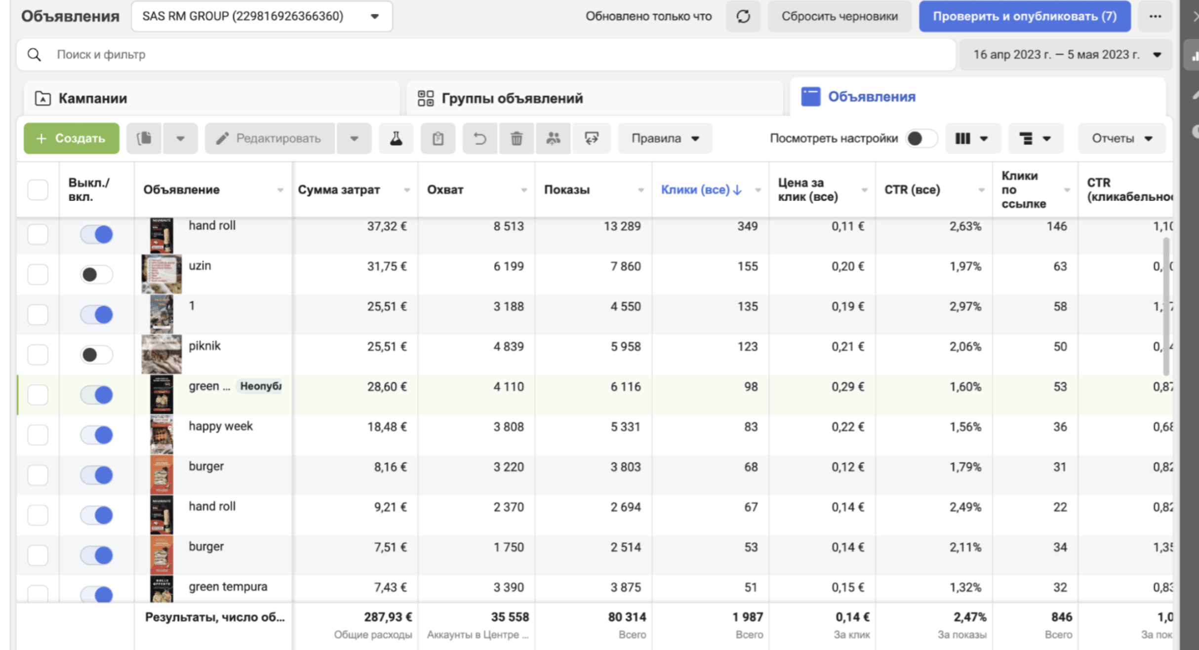 Последующие РК были запущены с целью конверсии на сайт для оптимизации и поиска лидов, которые потенциально совершат заказ на сайте. Запускали рекламу и на Instagram*, и на FB*. По статистике из рекламного кабинета было видно, что очень много людей переходят на сайт именно с FB*, так как в Европе FB* очень популярен. Кстати, многие сейчас считают, что лента не работает и нужно запускать рекламу только в сторис или в Reels. У нас было наоборот, если сравнивать именно по местам размещения, то В связи с тем, что роллы можно заказать не только на сайте клиента, но и еще у 3-х различных агрегаторов + очень много заказов стало на самовывоз, то отследить точное кол-во заказов, которые пришли именно с рекламы давольно тяжело, поэтому мы постарались сравнить выручки. Высчитали среднюю выручку за предыдущих 3 месяца и выручку, которая у нас была за месяц открутки рекламы. По нашим показателям получилось, что выручка выросла в 4 раза. Реклама начала хорошо раскручиваться, повысилась узнаваемость ресторана и кол-во заказов увеличилось, как на нашем сайте, так и на сайте других агрегаторов.