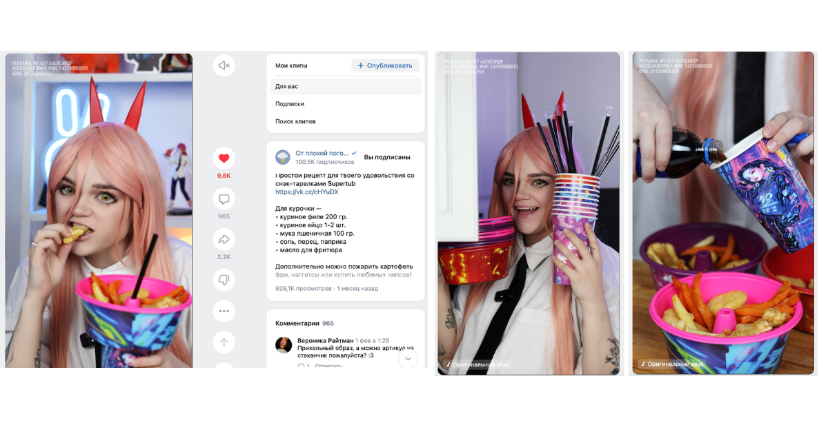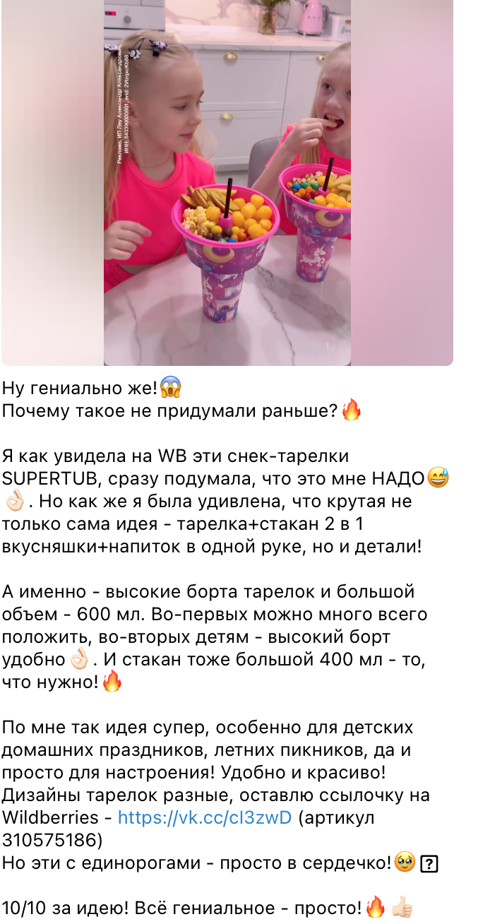 Из 20 подобранных инфлюенсеров мы остановились на двух аккаунтах под наш бюджет: — Блогер и по совместительству мама двух дочек Татьяна Бородина, которая ведёт телеграм-канал https://t.me/borodina_blog — Food-блогер Юлия Сурикова и ее блог во «ВКонтакте» https://vk.com/weatherwasawesome Главными критериями для нас были: — активность и вовлеченность аудитории — соотношение цены и количества просмотров — органичность рекламы нашего продукта на странице блогера — соответствие подписчиков ЦА клиента При работе с блогерами нужно понимать: первые рекламные интеграции могут не быть 100%-м попаданием, и важен этап тестирования. Поэтому надо строить разные гипотезы и проверять их в действии, основываясь на вводных данных, целях кампании, а также опыте и насмотренности. Нам хотелось получить контент, который: 1. Будет повышать знание о продукте, покажет его использование 2. Нативно впишется в аккаунт блогера, вызовет доверие и желание протестировать 3. Будет близок аудитории и передаст очевидную пользу от покупки 4. Получит вирусный потенциал, чтобы добиться максимального охвата Так, для семейного лайфстайл-блогера в Телеграм https://t.me/borodina_blog мы выбрали формат видеообзора с участием детей и живыми эмоциями. А в аккаунте фуд-блогера во «ВКонтакте» https://vk.com/weatherwasawesome мы сделали акцент на аниме-тематике, и у нас получился тематический атмосферный обзор с рецептами закусок. Публикации вышли, и спустя месяц мы получили промежуточный результат: клип у фуд-блогера «ВКонтакте» попал в рекомендации и на данный момент набрал уже 928 394 просмотра: А публикация у Telegram-блогера собрала 2 687 переходов. Пик был зафиксирован в первые 2-3 дня после выхода публикации. Таким образом, общие результаты по проекту составили: Помимо этого, мы получили положительный отклик от аудитории блогеров. Мы помогли нашему клиенту в запуске его продукции на WB и первом касании с аудиторией. Даже при небольшом бюджете получили результат в 960 000 и более просмотров и выработали рабочую стратегию сотрудничества бренда с блогерами в будущем. А также еще раз убедились, что в рамках одной РК важно тестировать разных блогеров в разных соцсетях — это помогает быстрее найти тот самый путь продвижения, который принесет результат. Помните, что работать с инфлюенсерами продуктивно можно даже в новых реалиях, а если нужна помощь — приходите в коммуникационное агентство «ЕстьИдея»:)