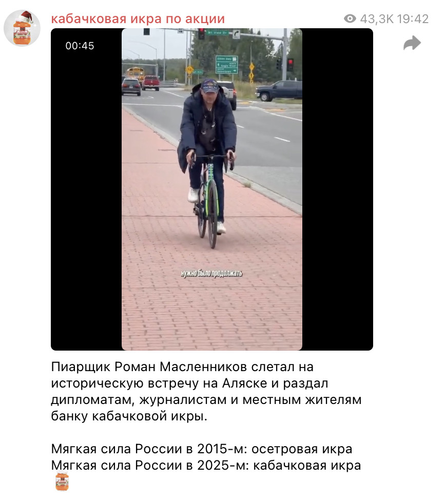 — Везу вашу икру на встречу Путина и Трампа. Не как сувенир — как символ. Пауза.