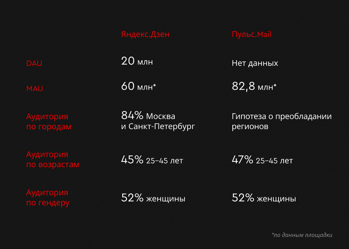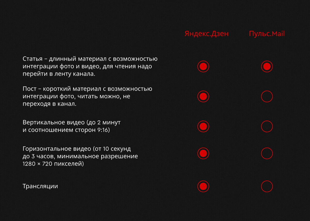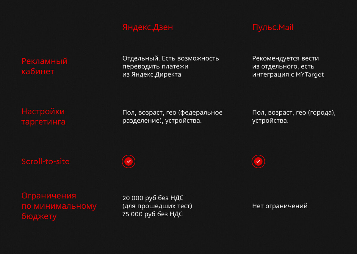Дзен сформулировал 2 принципа подборки: У Пульса рекомендательная система предлагает пользователям информацию с учётом их интересов с помощью искусственного интеллекта: анализируются клики, переходы, источники, в том числе и социальные сети. До февральских событий этого года аудитория Яндекс.Дзен насчитывала 20 млн пользователей ежедневно и около 60 млн уникальных пользователей в месяц (данные площадки). За февраль-март по разным оценкам прибавилось не менее 2 млн. Это связано с притоком рекламодателей и блогеров, которые перетягивают свои аудитории на новые площадки с возможностью монетизации. Пульс таким приростом похвастаться не может, но аудитория там есть, и она активно пользуется площадкой. Несмотря на то, что показатели далеки и не сравнимы с классическими соцсетями, это огромная аудитория, которую можно конвертировать в том числе и в продажи. Хотя некий скепсис, витающий вокруг этих площадок, есть, он ничем не обоснован, в то время как наши кейсы показывают, что работать с ними можно и даже нужно. До февраля 2022 года тематики, которые были наиболее интересны аудитории Дзена: Аналогичная ситуация и в Пульсе. Однако нужно быть готовыми, что с притоком новой аудитории интересы могут измениться, тем более, что обе площадки активно привлекают новыми подборками. Дзен на порядок опережает Пульс с точки зрения разнообразия форматов контента. Но учитывая с какой частотой в последнее время выходят релизы, ко времени завершения прочтения этого материла ситуация может поменяться. Разница в показателях зависит в большей степени от качества контента, чем от формата. Самым распространенным все еще остается статья, одинаково доступная в Дзене и в Пульсе. Недавно в Дзене подключили посты и галереи. Площадка еще будет наращивать интерес к ним, в том числе и рекламную мощь — новые форматы будут пытаться заменить запрещенные соцсети по подаче контента. Претендентом на лидерство могут стать горизонтальные видео, которые перетекают в том числе из YouTube, тогда как вертикальные (ролики) пока не используются брендами. Если контент в первую очередь должен быть информативным, так как мы показываем товар или услугу, даем фактологию, то вот подача может быть разной: серьезной, юмористической, от лица пользователя или выдуманного персонажа. Тут зависит не от площадки, а от позиционирования бренда и степени его креативности, раскрепощенности. Реклама на обоих платформах по своей механике представляет собой некий гибрид контекста и таргетинга, так как обладает небольшим набором таргетов (пол, возраст, гео, устройства) и при этом ориентируется на интересы аудитории, выявленные по ее активности в сети. Дополнительных настроек, к которым привыкли в классических кабинетах соцсетей, здесь нет. Сразу отметим, что Пульс получает +100 очков за отсутствие минимального бюджета, чем грешит Дзен сегодня. Отчасти это связано с начинающим ростом популярности в кругах маркетологов. Вспомним продукт Яндекса двухлетней давности — он тоже не был звездой, а сейчас имеет стабильные рост и популярность. Несмотря на отсутствие минимального бюджета у Пульса, запускаться все же рекомендуется с бюджетом от 50 000 руб и не менее чем на 3 месяца. Целевые показатели зависят от задач кампании и выстроенной воронки. Однозначно и Дзен, и Пульс — охватные инструменты, которые луч