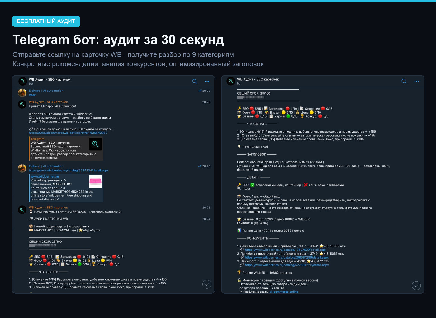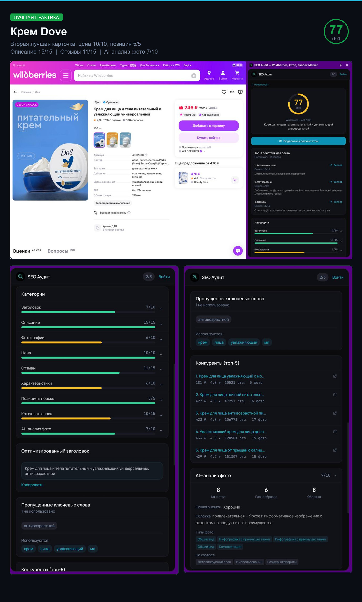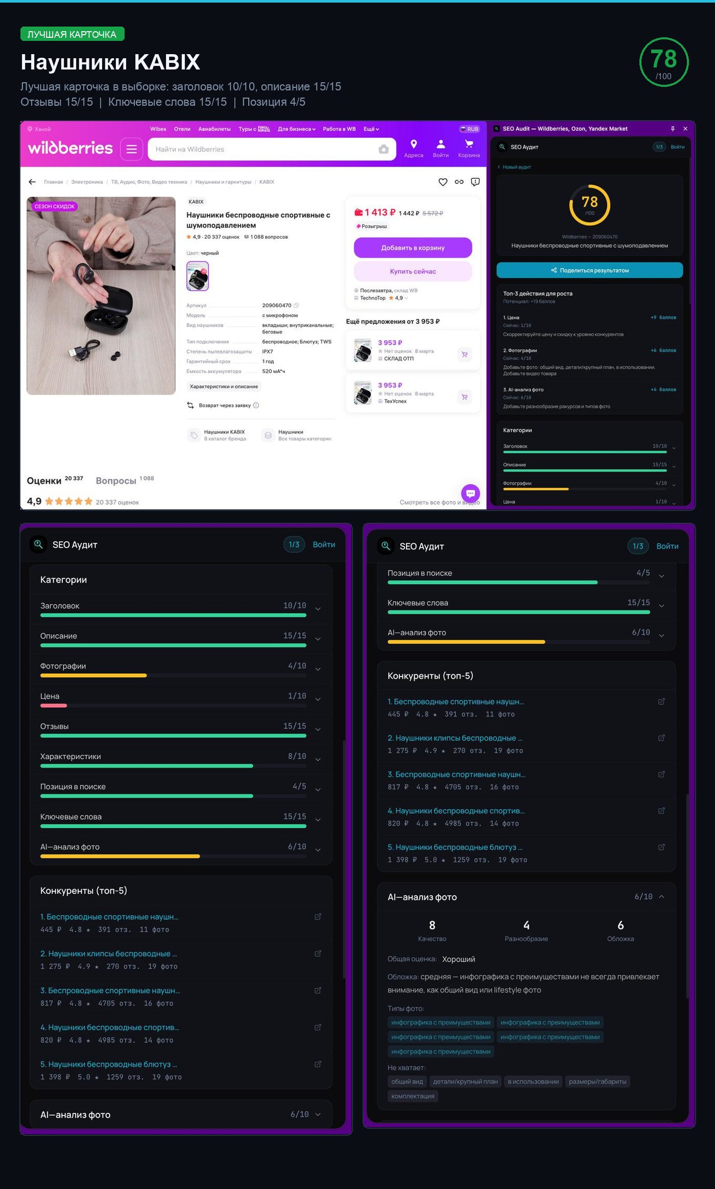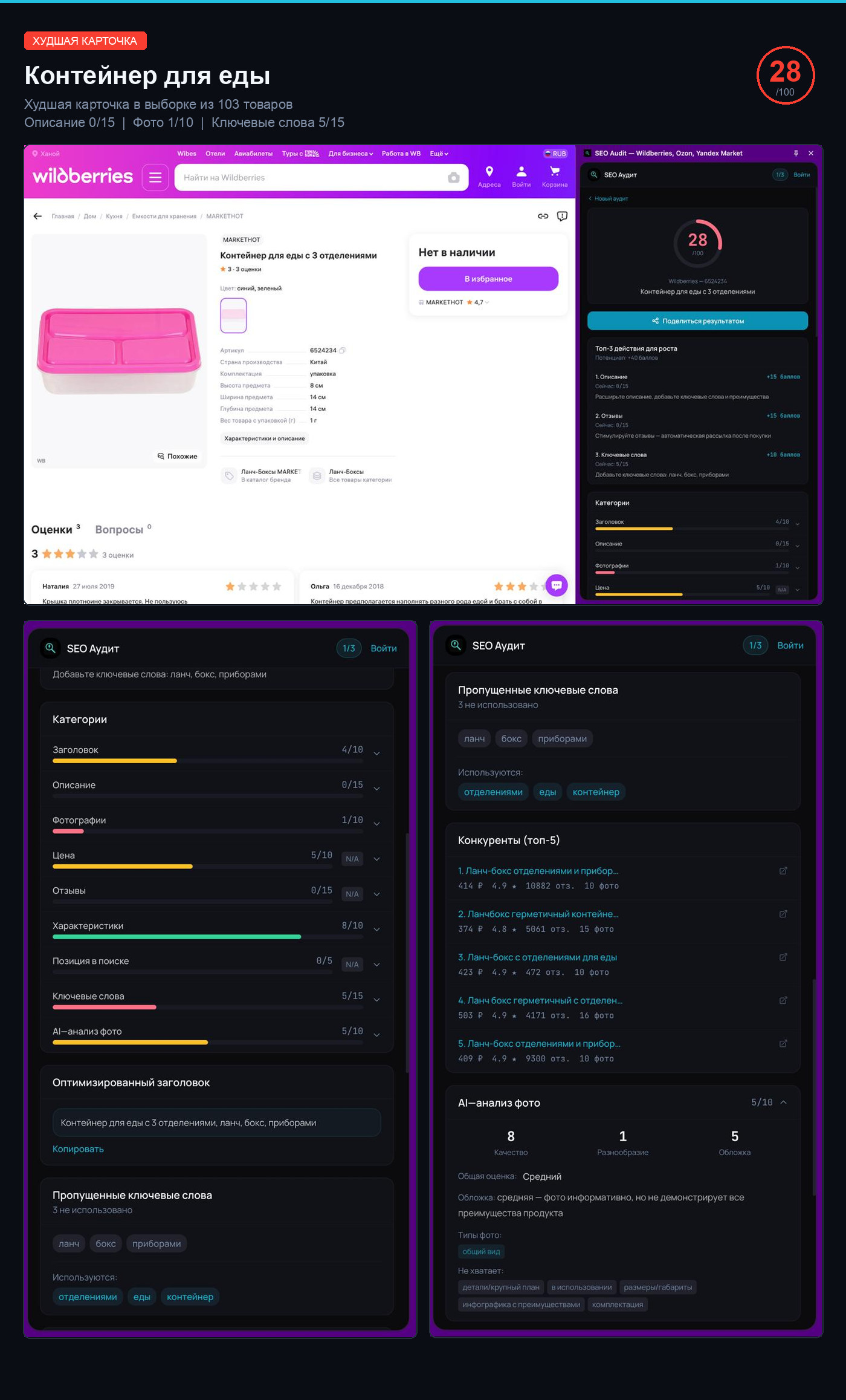 Каждая карточка прошла автоматический аудит по 9 параметрам: заголовок, описание, фотографии, цена, отзывы, характеристики, конкуренция, SEO-ключевые слова, визуальный AI-анализ. Максимум — 100 баллов.