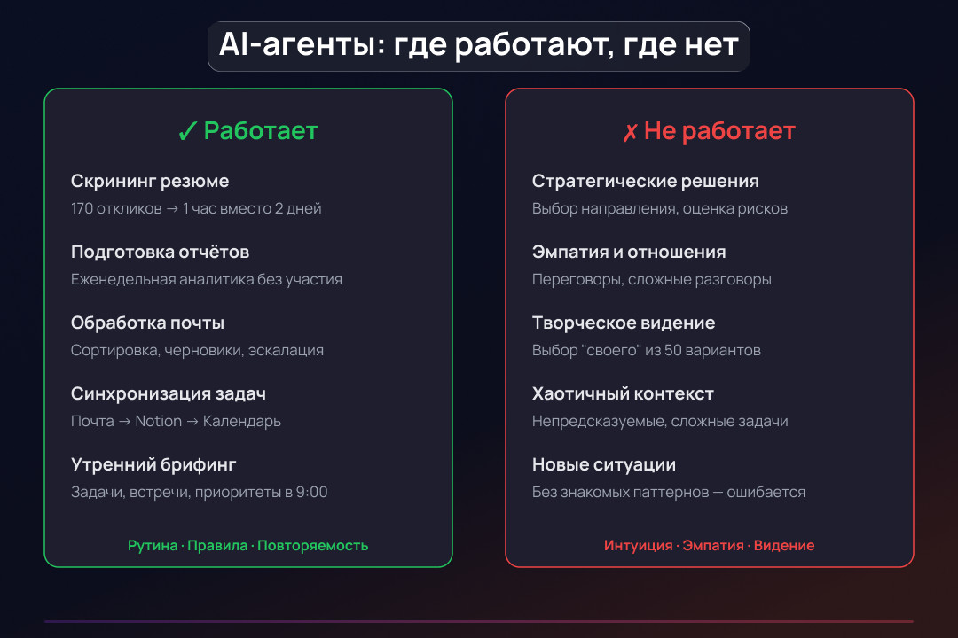 AI-агент — это программа, которая действует автономно в рамках заданных правил. Она может использовать инструменты (браузер, почту, базы данных), принимать промежуточные решения и выполнять последовательности шагов без участия человека на каждом из них. Один из участников клуба проводил найм на позицию в свою компанию. Стандартная ситуация: открываешь вакансию, через несколько дней у тебя 170 откликов, и ты понимаешь, что это несколько рабочих дней просто на первичный скрининг. Он описал профиль идеального кандидата в виде чётких критериев — опыт, стек, тип задач, ожидаемый стиль работы. Затем с помощью Claude Code написал скрипт, который разбирал резюме, прогонял каждое через модель по этим критериям и выдавал структурированную оценку с пояснением. Через час у него был отсортированный список с комментариями по каждому кандидату. Первые 20 человек были готовы к звонку. На всё ушло около часа — включая время на написание самого скрипта. Важная деталь: он не доверил AI финальное решение. Агент сделал черновую сортировку — человек принял решение о найме. Это правильная модель разделения труда. Другой участник клуба построил то, что он сам называет «операционной системой своего бизнеса». Через платформу OpenClaw он соединил несколько агентов в единую экосистему. Один агент следит за календарём и автоматически готовит брифы перед встречами — собирает контекст по участникам, прошлые договорённости, актуальные задачи. Другой обрабатывает входящую почту: сортирует, составляет черновики ответов на типовые запросы, эскалирует нестандартные. Третий еженедельно анализирует аналитику Instagram и готовит отчёт с выводами. Четвёртый синхронизирует задачи между разными системами. Это не один инструмент — это связанная система, где агенты передают контекст друг другу. На её настройку ушло несколько недель итераций. Зато теперь она работает без его участия в рутинной части. Ещё один участник пошёл другим путём — не строил сложную экосистему, а решил одну конкретную проблему. Каждый день он тратил время на то, чтобы разобраться, что вообще нужно делать: сообщения в разных чатах, задачи в разных местах, встречи в календаре. Он настроил Telegram-бота, который каждое утро в 9:00 присылает ему структурированный брифинг дня. Бот забирает задачи из Notion, события из Google Calendar, важные сообщения из нескольких рабочих чатов — и собирает это в один читаемый список с приоритетами. Кажется несложно. Но это убрало ежедневный «утренний хаос» — примерно 20–30 минут разбора, которые раньше съедали начало рабочего дня. Стратегические решения. AI хорошо анализирует данные, но не берёт ответственность за выбор. «Выходить на рынок сейчас или подождать» — это решение, которое требует понимания контекста, интуиции, принятия неопределённости. Эмпатия и человеческие отношения. Переговоры с ключевым партнёром, сложный разговор с сотрудником, работа с недовольным клиентом — это задачи, где важен живой контакт. AI может помочь подготовиться, но провести сам разговор — нет. Творческое видение. AI генерирует варианты. Но выбрать, что из них соответствует духу бренда, куда мы хотим двигаться — это требует видения. Агент может сделать 50 вариантов, но не знает, какой «ваш». Длинный нестандартный контекст. Агенты хорошо работают в рамках чётко описанных процессов. Когда задача сложная и контек