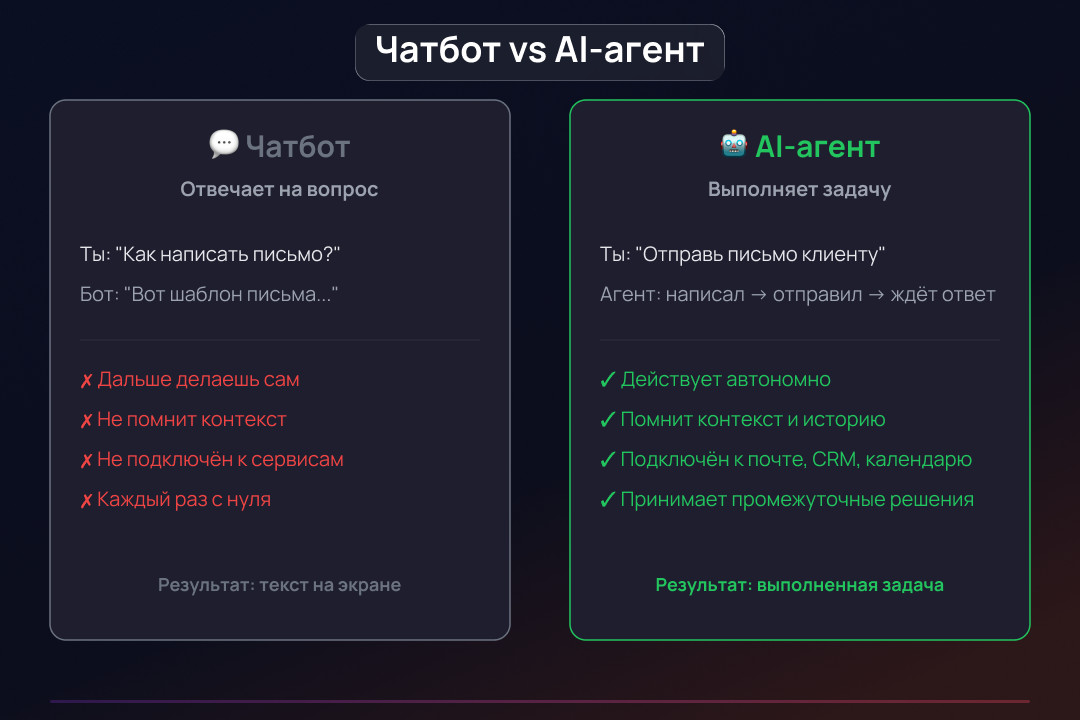 Разница кажется небольшой, но на практике это пропасть. Чатбот скажет вам, как написать письмо. Агент напишет письмо, отправит его, дождётся ответа, внесёт встречу в календарь и уведомит вас только если нужно ваше решение.