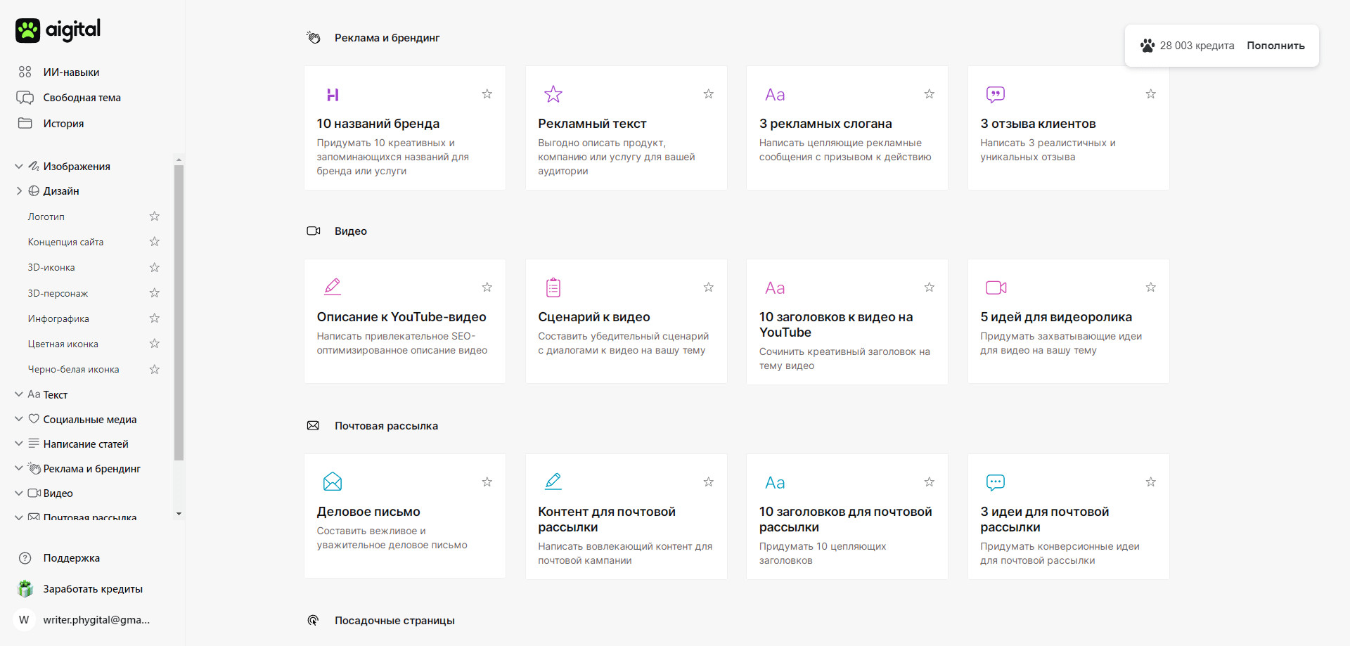 Всем этим мы снимаем с пользователя необходимость самому продумывать подробный запрос. Тем не менее внутри интерфейса есть небольшая подсказка, которая просит пользователя чуть яснее описать свою идею для нейронки. Это поле «Что учесть». Как выяснилось, даже часть нашей команды не понимали, что нужно писать в этом поле, и часто его пропускали, добавляя всю нужную информацию в основной запрос. Наш продакт сказал, что, можно делать и так, но лучше вывести этот вопрос в отдельное поле, чтобы пользователю было проще сформулировать идею, отдельно уточнить какие-то детали. Так интерфейс направляет пользователя чуть больше раскрыть свою мысль, например, дописать цвета или времена года для иллюстрации. Чтобы с интерфейсом было проще и приятнее взаимодействовать, мы провели ребрендинг. Наш сервис взрослеет, им стали интересоваться не только фрилансеры, но и команды, и корпорации. Кто-то из них приходит как пользователь Aigital, кто-то покупает White Label для своей организации. Для последних мы разрабатываем кастомные навыки и меняем оформление интерфейса под фирменный стиль организации. В этом месяце мы решили изменить внутренний облик сервиса, переосмыслили его и сделали более лаконичным и профессиональным. Мы отказались от темного интерфейса и выбрали светлый дизайн, как более легкий и удобный для повседневной работы. Помимо этого, мы решили обновить и маскота. Но пока думаем, стоит ли заменять нашего кота Мисти, к которому мы и наши пользователи уже привыкли, на его новый 3D-облик. Так же как и первого Мисти, новую версию кота мы создали в Aigital, но уже в новом навыке «3D-персонаж». Сейчас наши пользователи видят обе версии — на посадке посетителей встречает пушистый Мисти, а в личном кабинете обитает 3D-шный Мисти 2.0. Решили, что проще будет узнать мнение пользователей и читателей. Помогите нам выбрать, какого кота оставить, проголосуйте за понравившийся вариант в нашем телеграм-канале. С появлением множества графических навыков мы увидели, что некоторым пользователям становится сложнее понять, какой именно результат они получат от генерации. Если в текстовых навыках все довольно просто — пользователь по названию понимает, что получит деловое письмо или пост в Telegram, то в графических навыках не так. Важно сначала взглянуть, что подразумевается под 3D-иконкой, как выглядят рекламный креатив и реализм, и почему у нас целых 3 фотостока — отдельно для людей, объектов и окружения. Теперь вместо списка навыков на дэшборде располагаются карточки с тремя примерами под каждый навык. От внешних изменений перейдем к изменениям под капотом. Мы продолжаем совершенствовать текущие навыки и создавать новые. Одно из больших обновлений, которое мы готовим — создание чата с ролями. Мы хотим дать пользователям отдельный чат, в котором будет список предустановленных виртуальных ассистентов, каждый из которых специализируется в определенной области, например в маркетинге, медицине, IT и так далее. Эти роли смогут помочь пользователю ответить на узкоспециальный вопрос или решить задачу так, как это сделал бы профессионал в данной области. Например, если у вас есть маркетинговый вопрос, вы можете пообщаться с ассистентом-маркетологом и получить от него ответы или рекомендации по вашему запросу. Мы только планируем внедрение этой функции и хотели бы услышать ва
