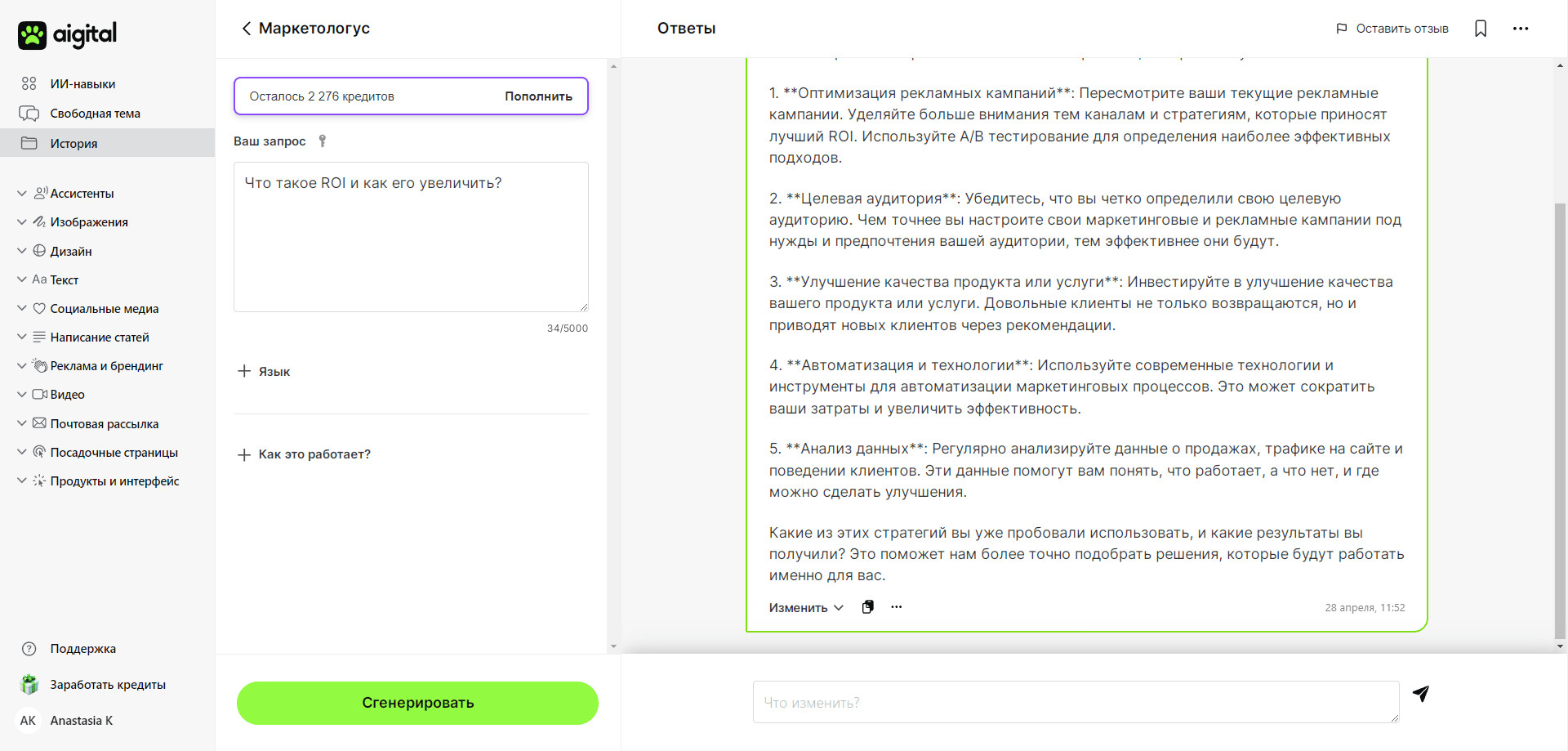 Подробно описанная роль позволяет сужать выборку данных для более релевантного и точного ответа на поставленный вопрос. Помимо этого, ИИ-ассистент сам задает вопросы, помогающие лучше понять и решить маркетинговую задачу.