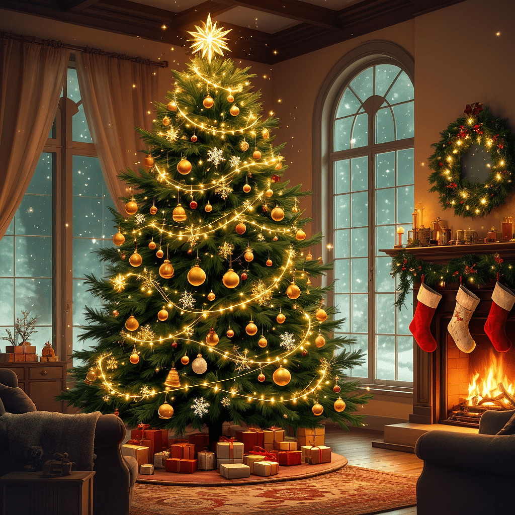 A beautifully decorated Christmas tree stands proudly in a cozy living room, adorned with twinkling white lights, shimmering gold ornaments, and a sparkling star atop. The background features a warm fireplace with stockings hung, while soft snowflakes fall gently outside the frosted windows, creating a magical winter wonderland. The overall style is a rich, inviting illustration with a festive color palette of deep greens, golds, and reds, evoking feelings of joy, warmth, and the spirit of the holiday season, enticing viewers to envision the perfect tree for their own home.