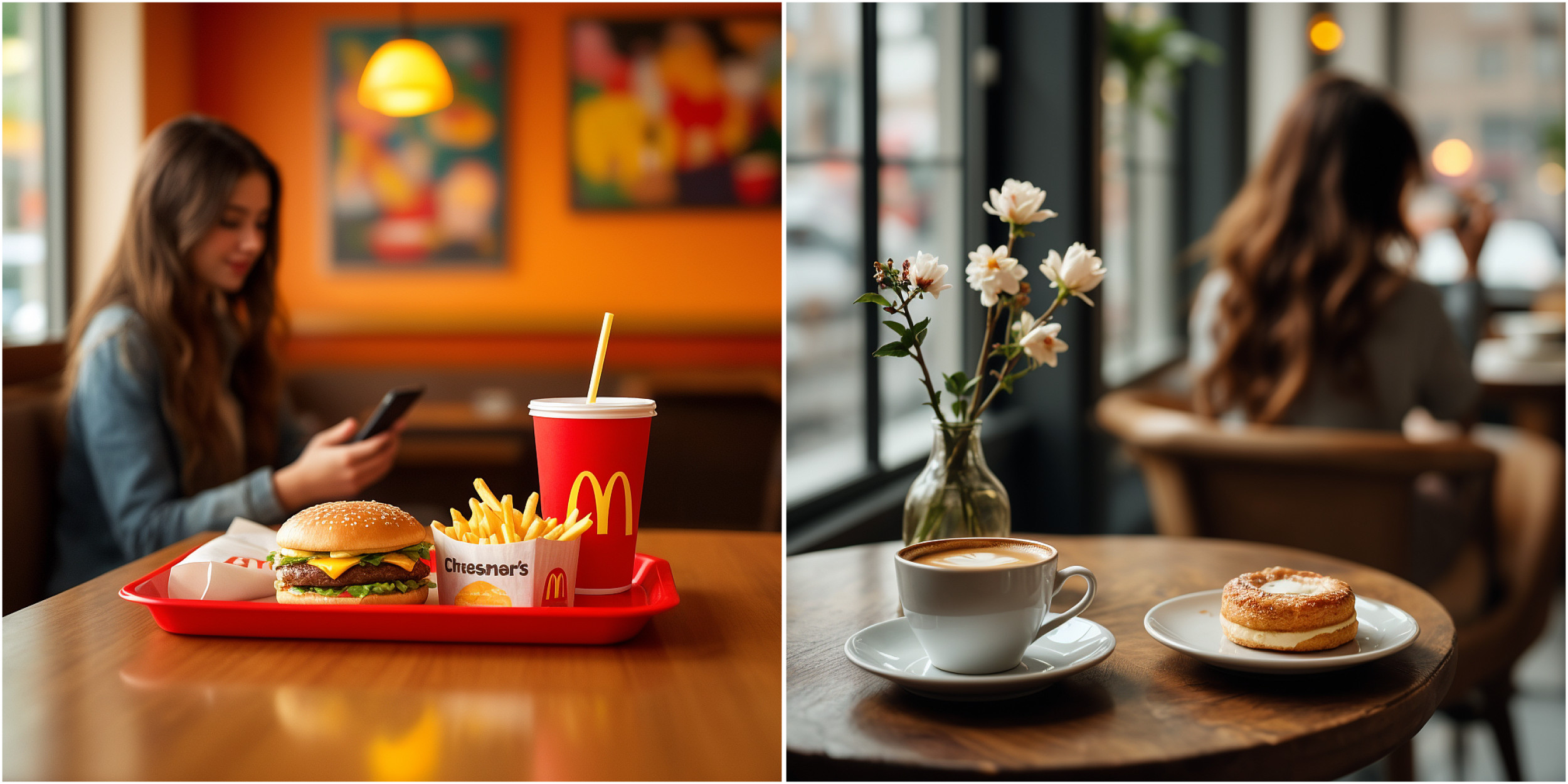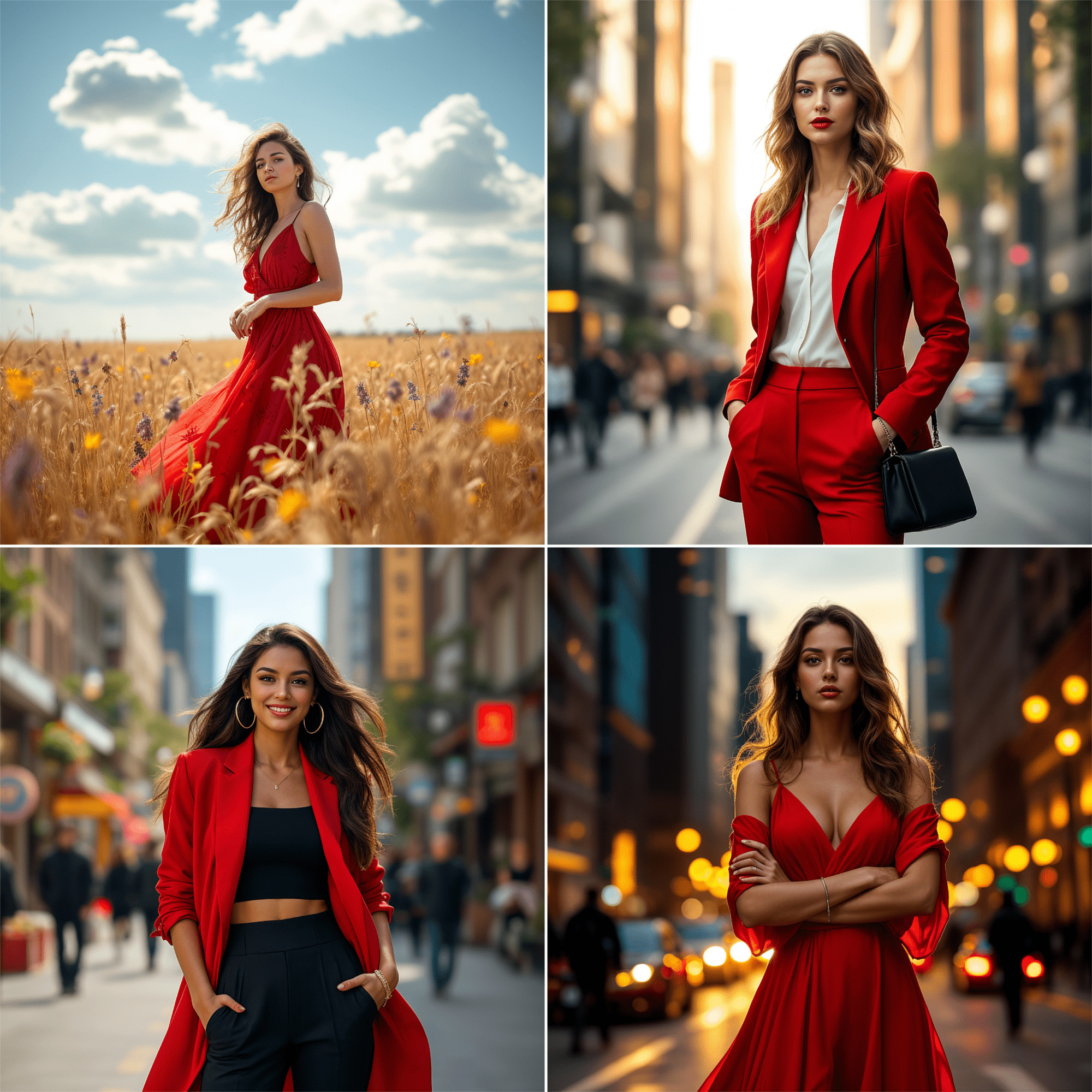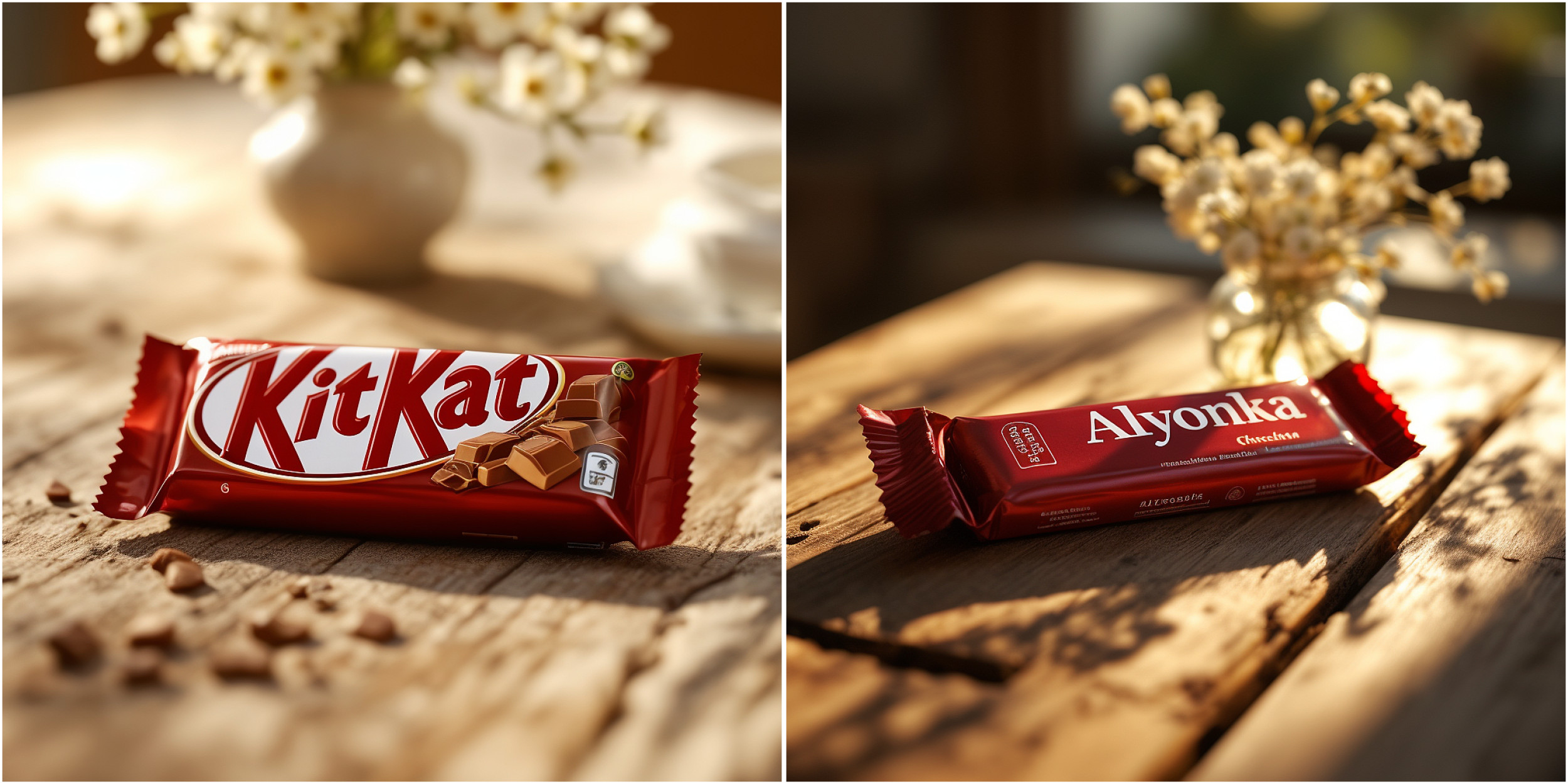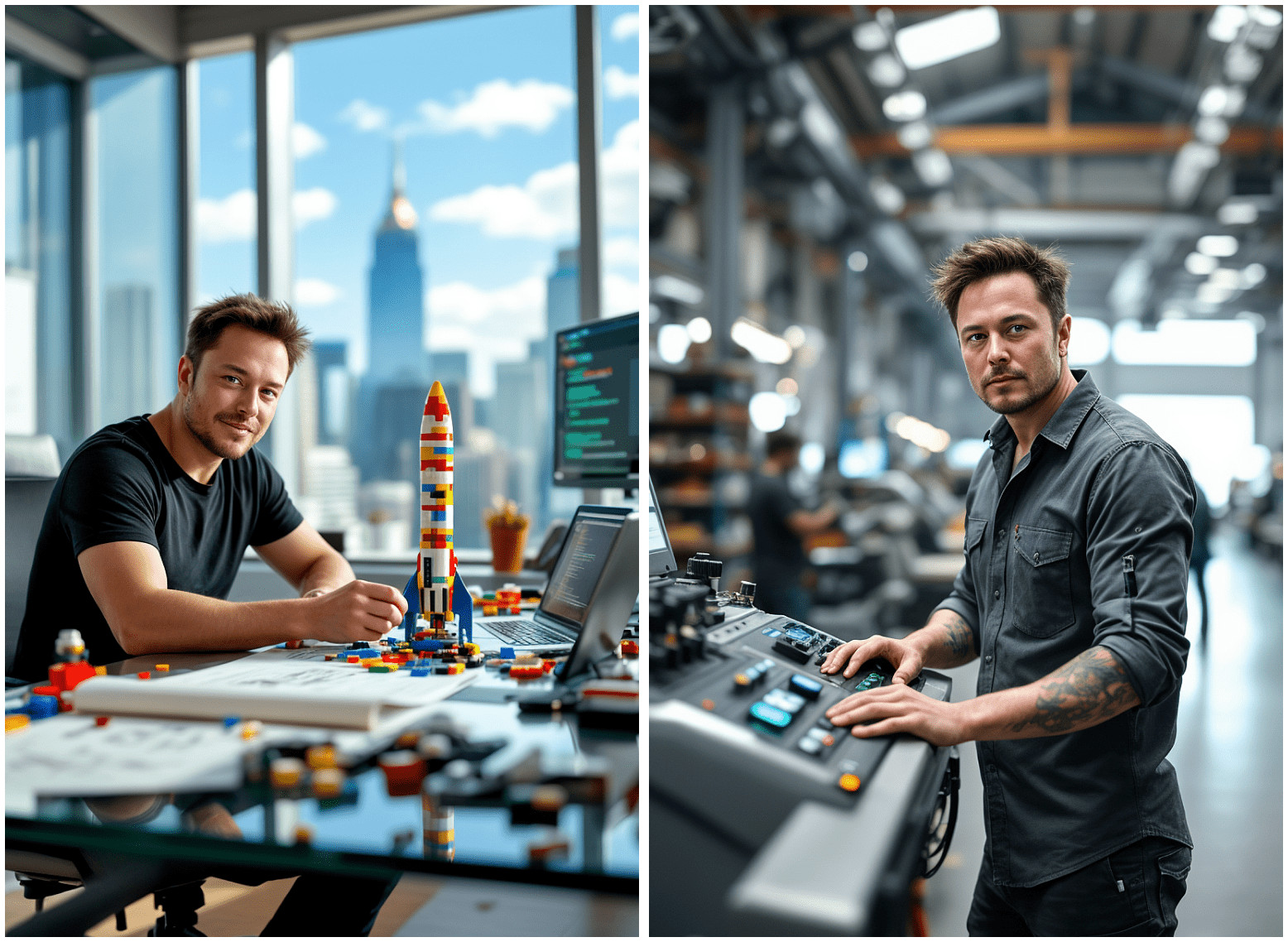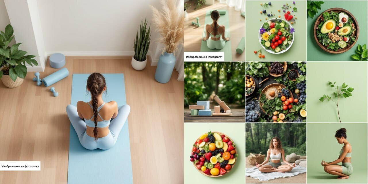 Для примера делюсь иллюстрациями из российской действительности — ИИ хорошо знаком с McDonald’s и KitKat, но ему совсем неведомы «Вкусно — и точка» и «Алёнка». Поэтому всегда максимально детально описывайте то, что хотите увидеть на фото, или используйте связку инструментов. О том, как это сделать, читайте далее. 2. ИИ не читает мысли. Без детального описания невозможно получить генерацию, точь-в-точь соответствующую вашим ожиданиям. Сравните: на первом коллаже результаты по запросу «Женщина в красном наряде», а на втором — по подробному промпту с описанием наряда, прически и фона. И в первом, и во втором случае это разные девушки, но сеттинг и наряды на первом коллаже очень вариативны. О том, почему девушки на втором коллаже разные, читайте в третьем пункте. 3. Без дообучения ИИ не может сгенерировать одного и того же человека в разных позах и сценариях. Внешность человека или персонажа будет меняться, сохраняя только ключевые черты, указанные в запросе (например, пол, цвет волос, цвет кожи и наряд). Но у нас есть лайфхак. На первом коллаже ненастоящий Илон Маск строит ракету из Lego и стоит у станка на заводе, на втором — почти как настоящий :) 4. ИИ не знаком со всеми селебрити, блогерами или выдающимися личностями из прошлого. Нейросеть может сгенерировать персонажа, очень похожего на популярную личность, лицо которой часто тиражируется в международных СМИ, например Дональда Трампа. В случае с менее известными селебрити ИИ сгенерирует человека с похожими чертами лица, а иногда и совершенную противоположность. 5. ИИ все еще не пишет по-русски. Но уже неплохо справляется с английским. Рекомендуем создавать рекламные баннеры в 2 этапа — сначала генерировать креатив, а потом добавлять текст на изображение в фотошопе или используя бесплатные редакторы, например: С помощью этих же инструментов вы можете добавить свой логотип на фото ресепшена или вывеску кофейни. При работе с фотостоком не нужно вспоминать о настройках камеры, выдержке, диафрагме или описывать свет, нейронка подберет их самостоятельно под ваш сценарий. Но вот что следует подсказать ИИ, так это внешность, позу человека, окружение, если оно имеет значение. Если говорите о людях, добавьте такие фразы как: Если описываете объекты, подумайте, какой фон и план вам важно получить: Давайте разберем, для решения каких задач вы можете использовать ИИ-фотосток. Как сгенерировать изображения под свой фирменный стиль и ленту в соцсетях Вы продаете правильное питание, один из основных каналов коммуникации — Instagram. Цветовая палитра вашего бренда и профиля — преимущественно зеленая, а понравившееся вам на стоке изображение — в голубых тонах. Замените пару упоминаний цвета в промпте и получите изображение, которое идеально встанет в сетку вашего профиля в Instagram*. Для этого зайдите в «Анализ изображения», загрузите фото с фотостока и попросите ИИ описать фотографию в деталях, но заменить голубые тона в цветовой палитре на зеленые. Полученный промпт добавьте в приложение «Фотосток» и выберите нужные пропорции. Как повторить рекламную кампанию сильного бренда Вы увидели афишу в городе, рекламу в соцсетях или на веб-сайте и хотите использовать ее как вдохновение для своей рекламной кампании. Используйте связку приложений «Анализ изображения» и «Фотосток». Так вы сможете повторить понравившие