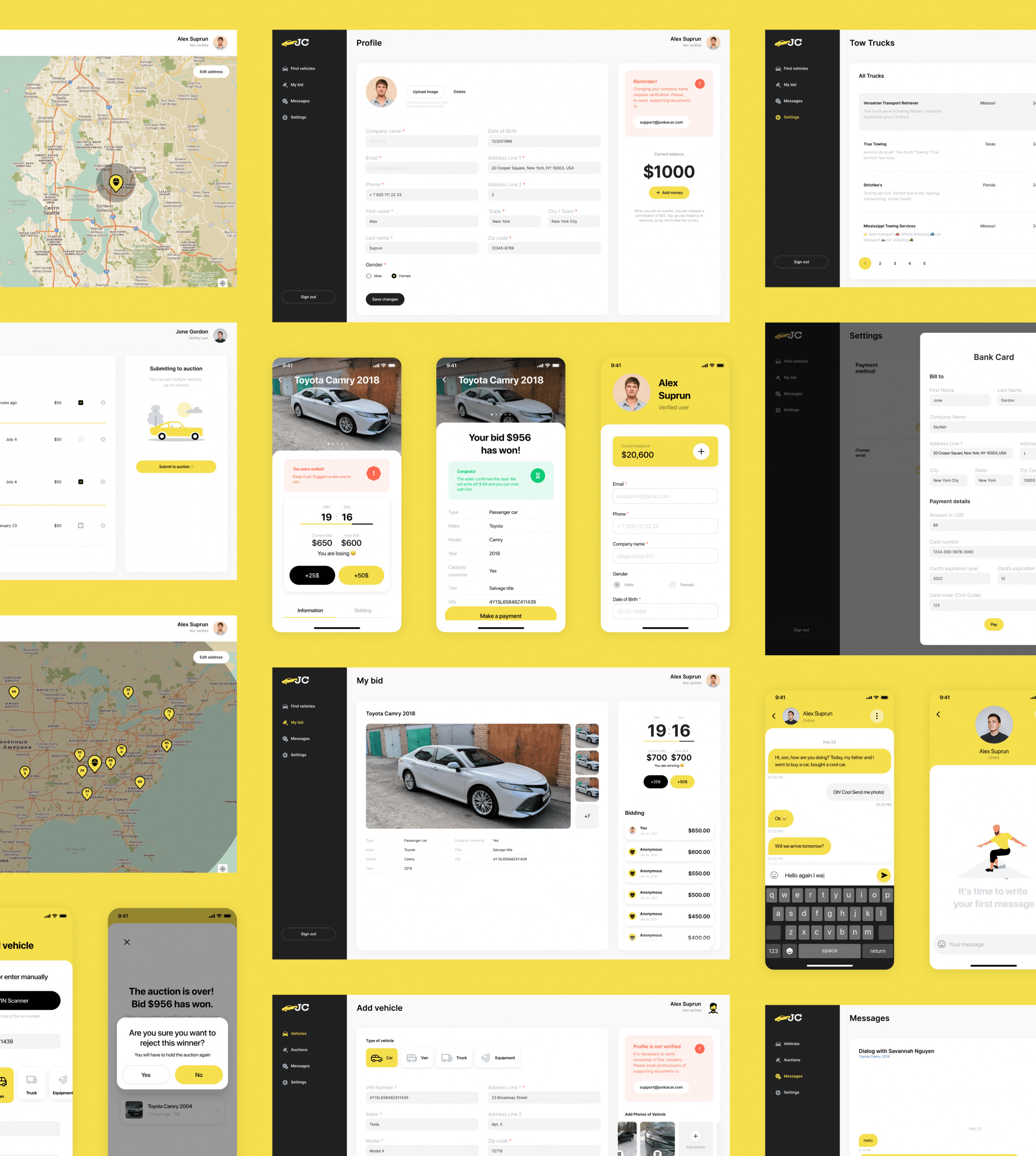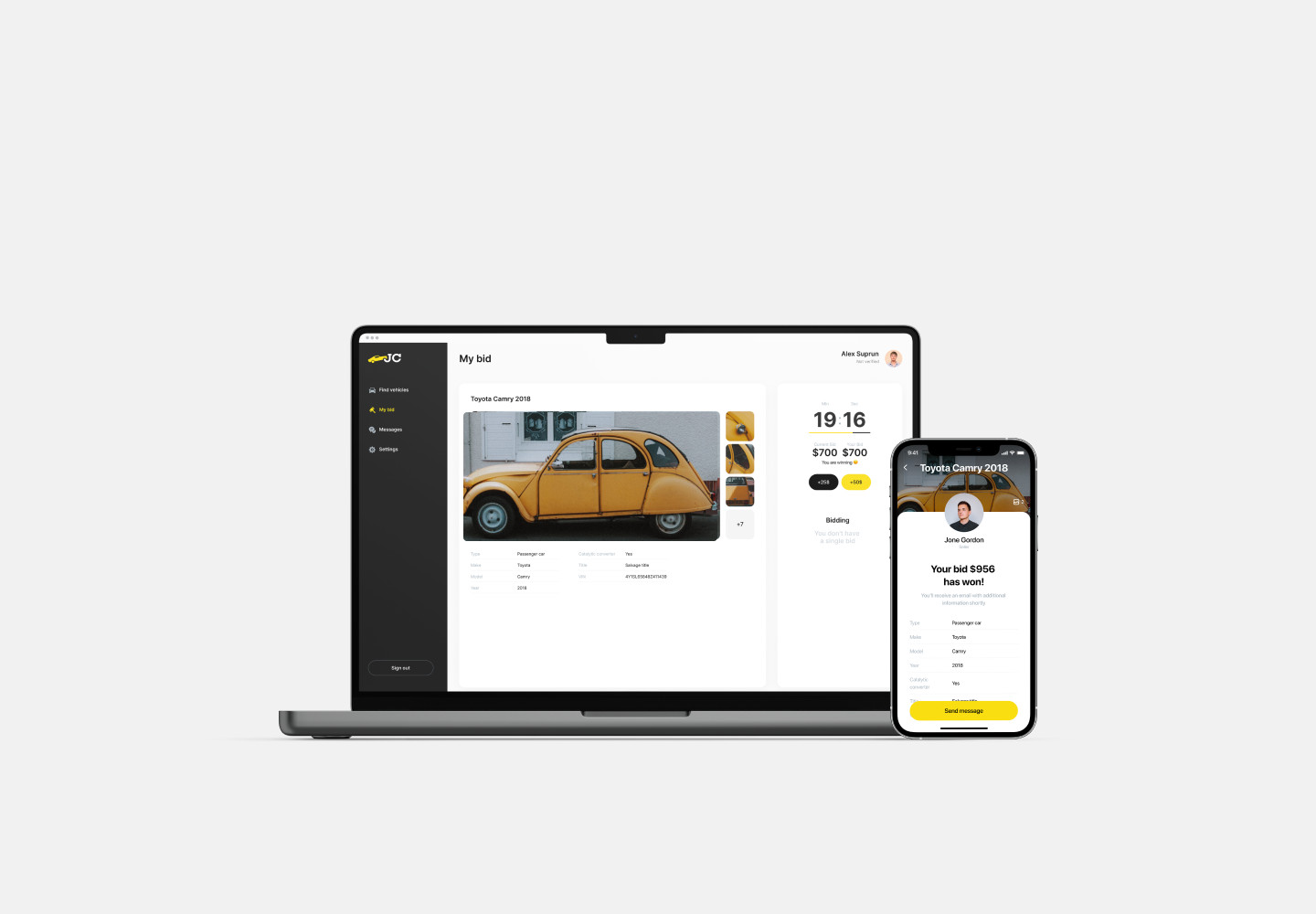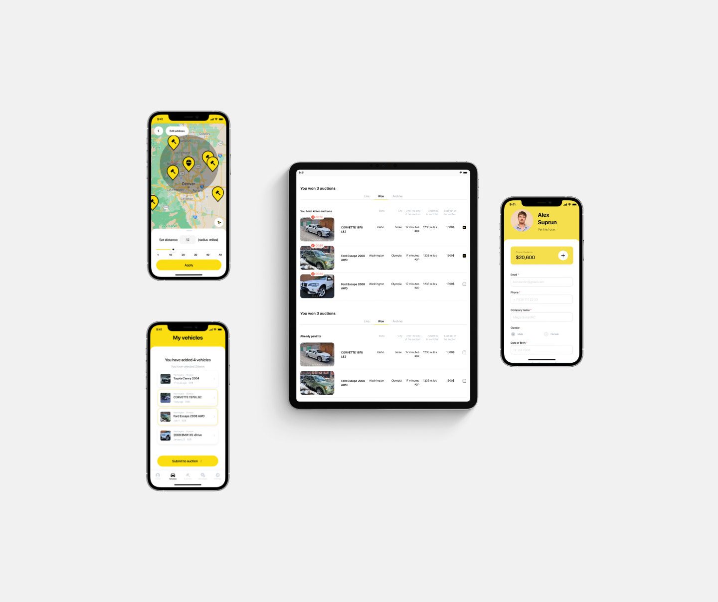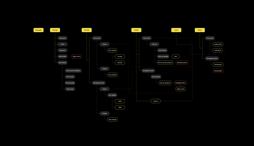 Команда описала бизнес-процессы, user flow и основные функции для будущего приложения. Спроектировали архитектуру продукта и обновили фирменный стиль. Создали минималистичную дизайн-концепцию в стиле ретро. В логотипе машина и название приложения. Для бренда выбрали спокойные цвета с ярким акцентом Pantone 2021:Ultimate Grey+Illuminating. В процессе работы над продуктом упаковали UI-кит, в котором собрали цвета, типографику, иконки, элементы управления, повторяющиеся блоки UI. Теперь любой дизайнер сможет собрать новые экраны по стандарту. А продукт останется целостным, даже если наша команда уйдет с проекта. В начале работы над продуктом мы определили базовые принципы архитектуры, написали техническое задание, определили стек технологий, создали модель данных, описали все сущности. Технологии проекта: Flutter, Firebase, Node.JS, Fastify, Knex, PostgreSQL. Архитектура продукта базируется на следующих принципах: Описали ключевые модули продукта: модули бизнес-логики, сервисные и интерфейсные. К сервисной категории модулей относятся те, которые обеспечивают ядро необходимыми данными, но не взаимодействуют с пользователем. Сервисные модули: К интерфейсной категории относятся модули, которые осуществляют непосредственную работу доступного извне API, а также взаимодействие с внешними системами. Интерфейсные модули: К категории бизнес-логики относятся модули, реализующие основную логику работы приложения. Модули бизнес-логики: Разработали кроссплатформенное мобильное приложение на Flutter, протестировали весь функционал, загрузили приложение в сторы, прошли все проверки и запустили в срок. У пользователей есть две роли — владелец авто и владелец свалки. Для физических и юридических лиц реализовали разные подходы к верификации. Без нужных документов и проверки пользоваться приложением нельзя, но можно изучить его основные возможности. Покупателям приходят оповещения об аукционах в указанном радиусе от ближайших продавцов. Для аукционной механики продумали все пользовательские потребности. Сделали таймер аукционов, удобные кнопки для повышения ставок, систему оповещений и инструмент списания комиссий с карты, внутреннего баланса или Apple Pay, Google Pay с возможностью возврата денежных средств, если сделка не состоялась. После успешного завершения аукциона проводится списание комиссии, а пользователи получают контактные данные друг друга. Если по каким-то причинам сделка не состоялась, то комиссия возвращается пользователю на внутренний баланс. Создали удобный личный кабинет для продавцов и покупателей, в котором хранится вся история. Изначально клиент пришел к нам с запросом сделать только мобильное приложение и запуститься в срок. Наш продакт-менеджер изучил рынок и предложил в рамках развития продукта дополнительно разработать веб-версию приложения и лендинг. Веб-версия поможет привлечь еще больше пользователей, которые привыкли к десктопам. Логика запуска лендинга простая — приводить новых пользователей из веба в мобайл с помощью qr-кодов. Так клиент сэкономит на рекламном трафике: привлечь одного пользователя в веб стоит дешевле, чем в мобайл. Для веб-версии также собрали детальный UI-кит, который помогает быстро масштабировать дизайн и ускорять frontend-разработку. Мы уже 6 лет запускаем и развиваем цифровые продукты и сервисы, придерживаясь продуктового подхо