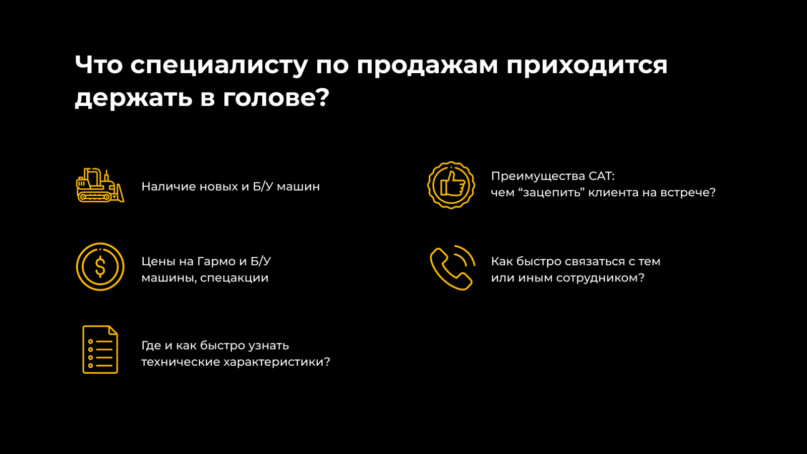 Специалист по продажам должен знать специфику своего продукта на отлично. Каждая машина в индустрии спецтехники имеет огромное количество характеристик, которые запомнить просто невозможно. У отдела продаж не было единого справочника, каталога или базы данных, где хранилась бы сразу вся информация: технические характеристики, актуальные прайсы, наличие в стоке нужных по характеристикам новых машин или техники с наработкой. В компании часто обновляются спецакции на определенные модели, а информация долго доходит до сотрудников. Специалисту приходится держать в голове все и сразу, снижается скорость и эффективность продаж.