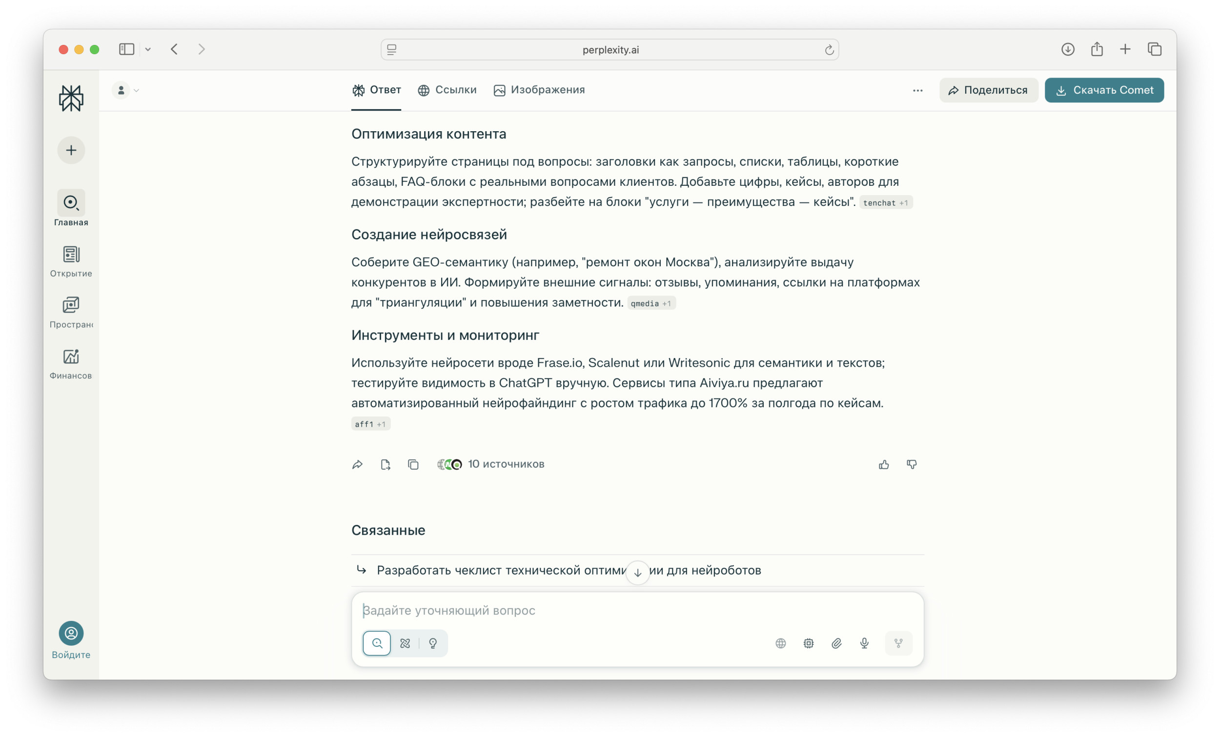 Вот пример того, что я имею в виду. Когда я спросил Perplexity, как продвинуть сайт в нейросетях, он упоминает Aiviya.ru Нейросети не просто предоставляют информацию о брендах, они рекомендуют их. И главное — они повышают доверие! По статистике трафик из нейросетей имеет конверсию на 300% выше чем трафик из обычной рекламы. Если люди используют нейросети, чтобы отвечать на вопросы и совершать покупки, вам нужно, чтобы ваш бренд появился там. Вот некоторые другие ключевые преимущества инвестирования в продвижение в нейросетях: Оптимизация LLM — это совершенно новая область, поэтому исследования все еще продолжаются. Тем не менее, я нашел сочетание лучших стратегий и проверенных методов, которые, согласно исследованиям, могут повысить узнаваемость вашего бренда в LLM. Давайте разберем их более предметно: 1. Инвестируйте в PR, чтобы связать свой бренд с правильными темами LLM интерпретируют значение, анализируя близость слов и фраз. Вот краткая разбивка этого процесса: LLM берут слова в массива данных, на которых они обучаются, и превращают их в токены — эти токены могут представлять слова, а также фрагменты слов, пробелы или знаки препинания. Они переводят эти токены в числовые представления. Затем они сопоставляют эти встраивания в семантическое «пространство». Наконец, они рассчитывают угол «косинусного сходства» между встраиваниями в это пространство, чтобы судить, насколько семантически близки или далеки они, и в конечном итоге понять их отношения. И формируют таким образом нейронные связи. Представьте внутреннюю работу LLM как своего рода карту кластеров. Темы, которые тематически связаны, такие как «собака» и «кошка», сгруппированы вместе, а те, которые не связаны, такие как «скутер» и «скейтборд», находятся дальше друг от друга. Брендам нужно создавать вот такие нейронные связи, чтобы нейросеть сопоставляла эти кластеры: запрос покупки товара бренда = бренд. 2. Включите цитаты в свой контент Недавно группа исследователей ИИ провела исследование по 10 000 реальных поисковых запросов,, чтобы выяснить, какие методы, скорее всего, повысят видимость в нейросетях. Для каждого запроса они случайным образом выбирали сайт для оптимизации, и тестировали различные типы контента (например, цитаты, технические термины и статистику) и характеристики (например, беглость, понимание, авторитетный тон). По результатам исследования, Веб-сайты, которые включали цитаты и статистику, чаще всего упоминались в выдаче нейросетей. Увеличение видимости было на 30-40% чем на сайтах без цитат и статистики. LLM на основе поиска учатся из различных онлайн-источников. Если цитата или статистика регулярно ссылаются в этом контексте, то скорее всего LLM будет возвращать их чаще в своих ответах. Поэтому, если вы хотите, чтобы контент вашего бренда отображался в нейросетях, наполните его соответствующими цитатами и собственной статистикой. Содержание цитата должно быть коротким. Я заметил, что большинство нейросетей, как правило, предоставляют только одно, или два предложения цитат или статистики. 3. Следите за автозаполнением LLM Если ваш бренд хорошо зарекомендовал себя, вы даже можете попадать в рекомендации автозаполнения (аналог поисковых подсказок) в нейросетях. Некоторые LLM имеют функцию автозаполнения, встроенную в строку поиска. Набрав подсказку типа «Это [название брен