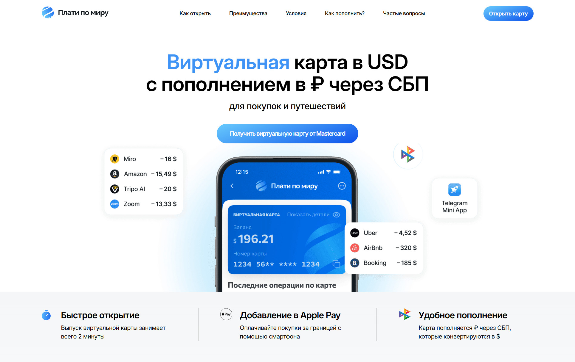 Когда в Турции не удалось оплатить даже воду российской картой, стало ясно — нужно искать выход. После десятков отказов терминалов наткнулся на Плати по миру. Решил попробовать: оформил за пару минут, пополнил через СБП, добавил в Apple Pay — и всё заработало сразу.