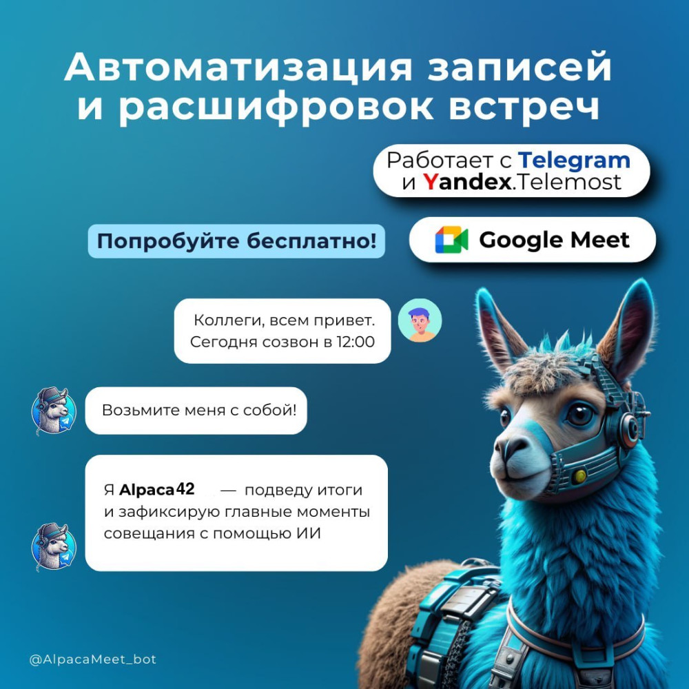 Alpaca42 фиксирует договоренности, готовит резюме встречи. Может участвовать в нескольких встречах одновременно.
