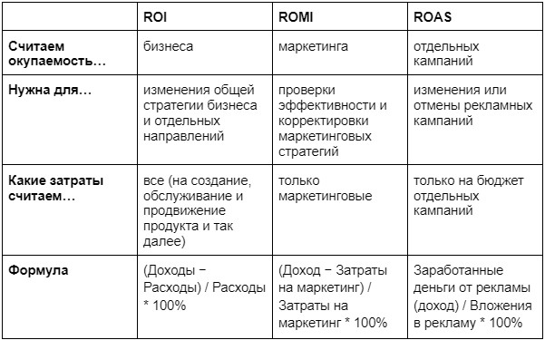 Каждый показатель подходит для разной степени обзора компании: ROI — полная оценка успешности вложений, учитывает все доходы и расходы, ROMI считается при работе с маркетингом, ROAS применяют для отдельных рекламных кампаний.