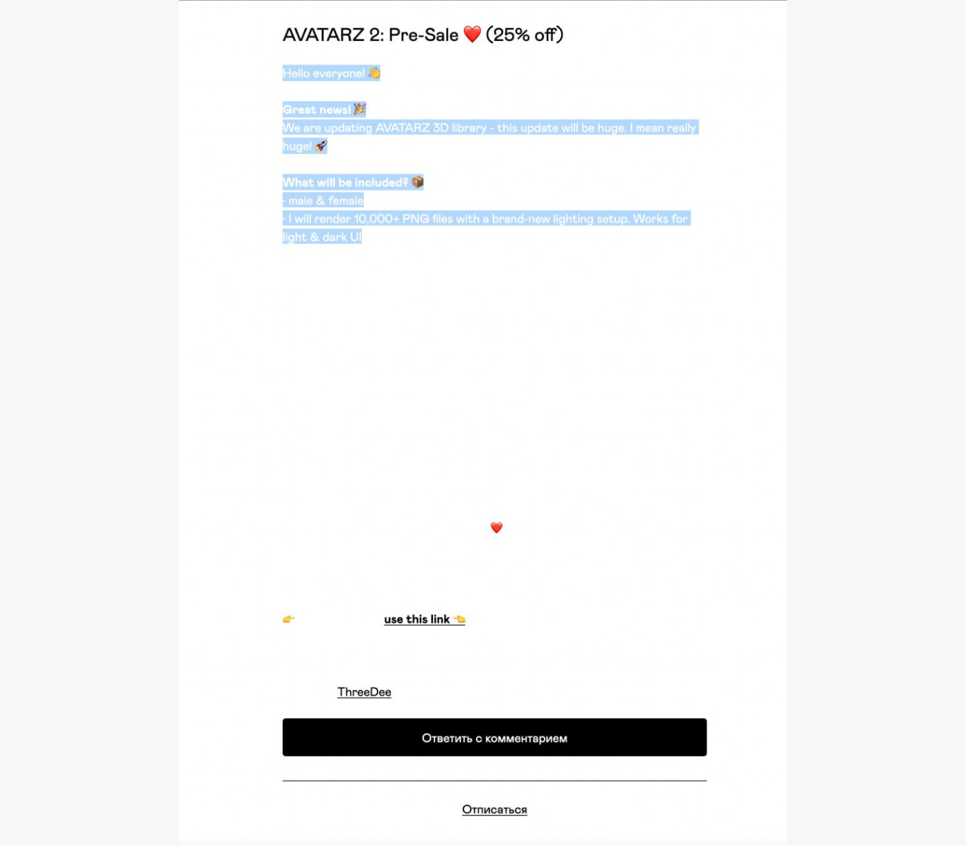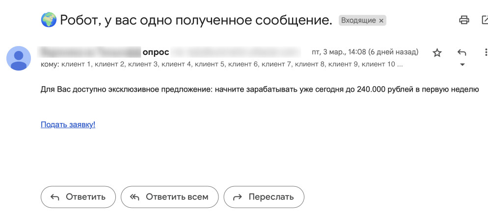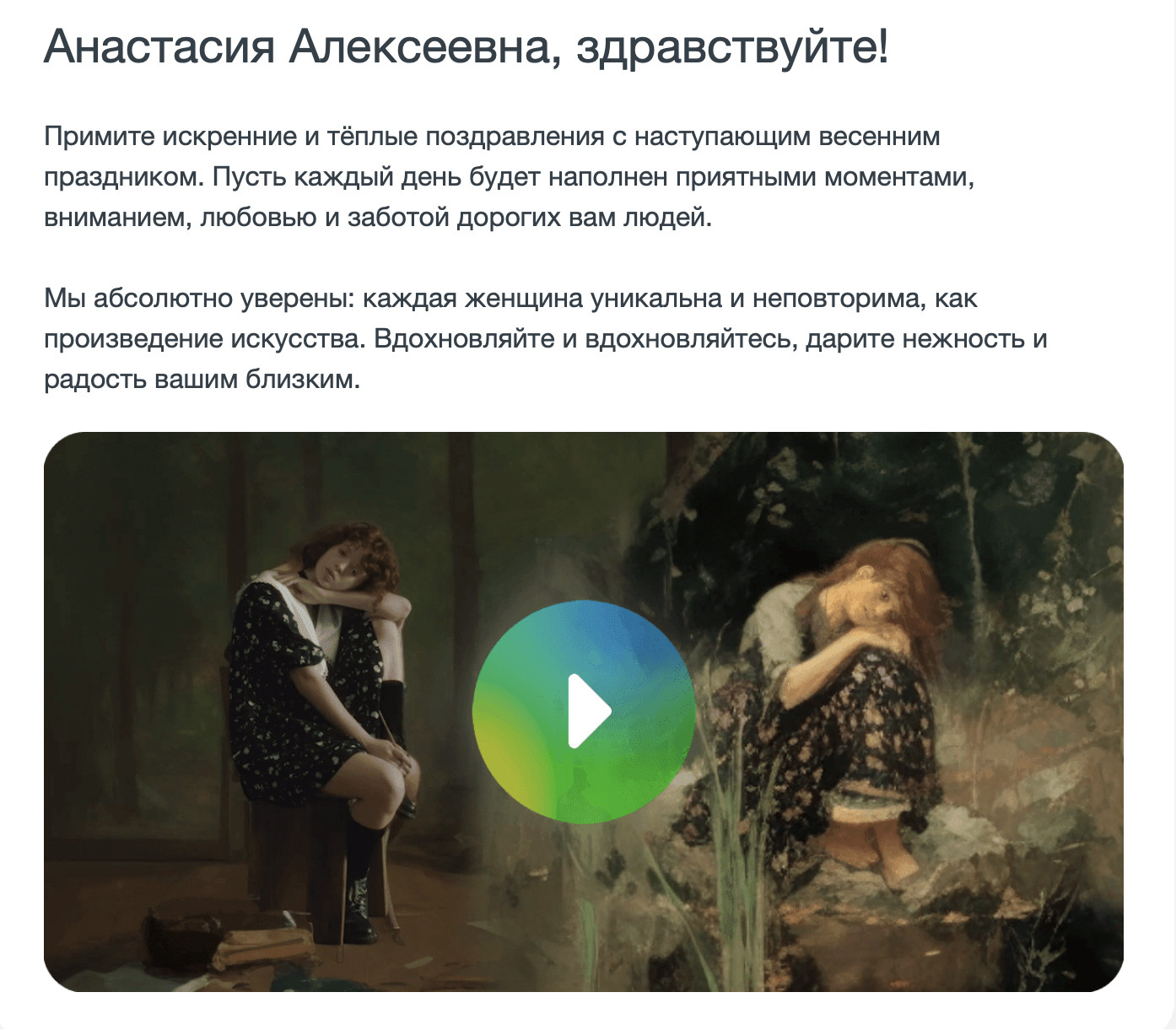 Пример такой ошибки. Достаточно развернуть список адресатов, чтобы скопировать все электронные почты из чужой базы. Автоматическая подстановка имени пользователя в письме при рассылке — приём персонализации. Работает такой способ через настройку переменных в письмах, которые добавляются туда через специальные тэги. При ошибке в настройках пользователь вместо своего имени увидит набор символов, например, {first_name}. Одним людям это покажется забавным, другие примут письмо за спам, пожалуются и отпишутся. В платформе для автоматизации маркетинга Altcraft Platfom такой проблемы не возникнет. Если в базе не окажется нужных для подстановки данных подписчика, платформа опустит переменную, и получатель письма не наткнётся на непонятное {_fname}. Более того, при правильной настройке ему можно показать общее обращение, например, «Уважаемый клиент». Для этого достаточно ввести текст, который вы хотите показывать подписчикам с неполными данными: Также в платформе доступен предпросмотр готового email с автоматически проставленными переменными. Вы даже можете выбрать подписчика, от лица которого хотите посмотреть шаблон: Если ссылка в сообщении не открывается или ведёт на страницу с ошибкой 404, бренд рискует недополучить прибыль. Вряд ли пользователь будет настойчиво разбираться и писать в техподдержку, чтобы получить правильную ссылку на акцию и скидки. В лучшем случае найдёт ваш сайт через поисковик, в худшем — не сделает ничего. Даже емейл рассылка, которая не должна ничего продавать, с неработающей ссылкой приведёт к потере лояльности. Так известный бренд прислал видеопоздравление, но вместо видео открывалась несуществующая страница. Поздравление не удалось. Даже такую рассылку спасёт Altcraft Platfom. В разделе «Пользовательские ссылки» есть возможность заменить ссылку в емэйл, который уже отправили. Ошибка исправится за пару кликов, и повторная е маил рассылка не понадобится. Если неработающую ссылку вы обнаружите быстро, пользователи ничего не заметят Частный случай неработающих ссылок — неактивные элементы дизайна. В примере на картинке есть кнопка, но при нажатии — на весь экран открывается картинка. То есть вёрстка письма для рассылки проходила неправильно: маркетолог не сделал кнопку активной. Если в теле письма есть дублирующая ссылка с таким же CTA, конверсию ещё можно спасти. Когда кнопка на изображении — единственный вариант перехода на сайт, ошибка приведёт к потере денег.