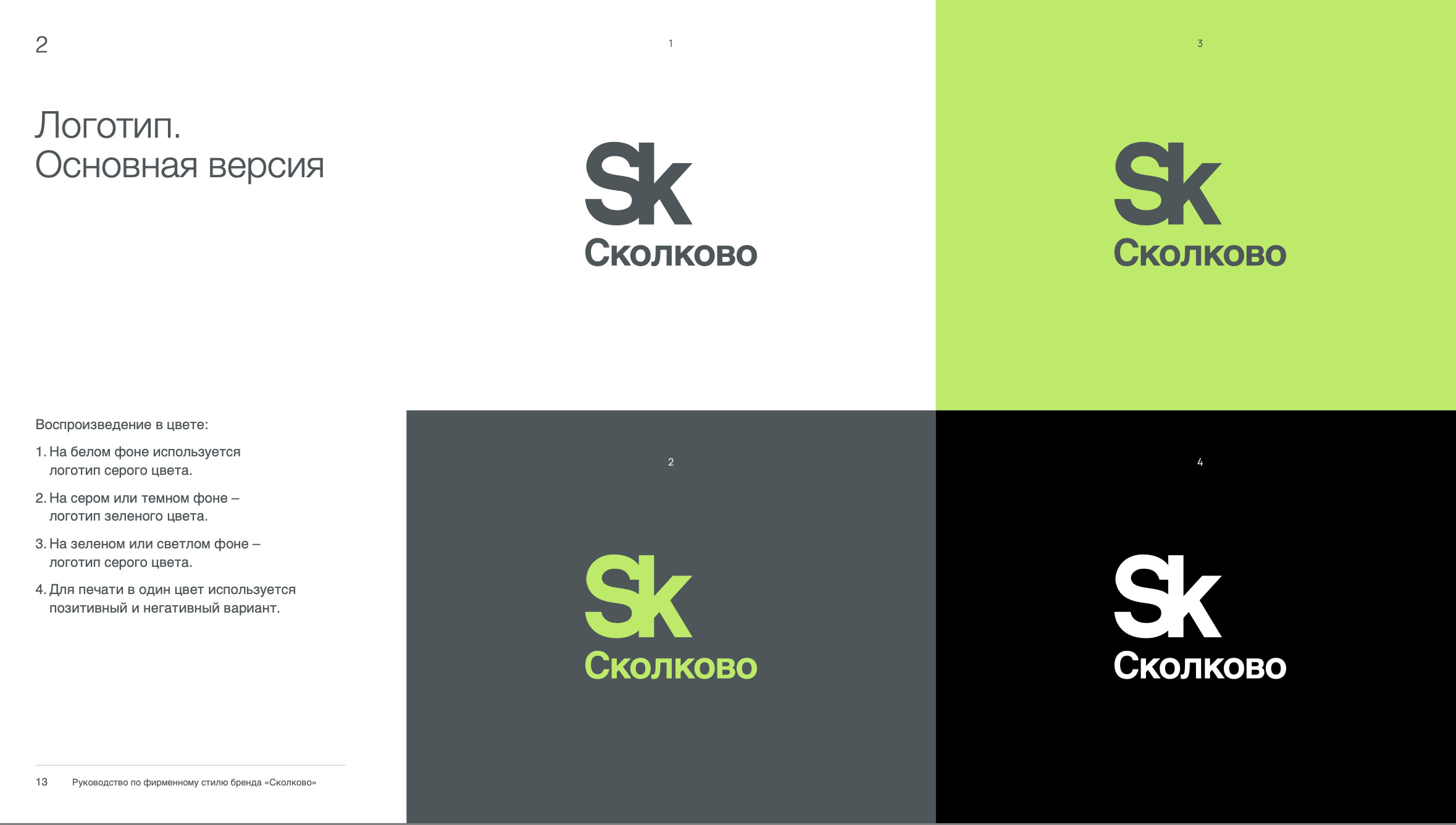 В этом разделе описывают: миссию, ценности, Tone of Voice (тональность или голос), позиционирование, характер, целевую аудиторию и историю бренда. То есть здесь раскрывается идентичность — индивидуальные особенности, которые отличают компанию от других. Описывается логотип (все версии) и другие отличительные знаки бренда, фирменные цвета, варианты написания названия. Также указывают фирменные шрифты и возможные паттерны, которые использует компания. Самый объёмный раздел брендбука (гайдлайн), который подробно объясняет, как использовать визуальные элементы бренда на разных носителях и ресурсах. Здесь обозначают допустимые варианты изменения цвета и формы графических элементов, оформления маркетинговых материалов, документов, упаковок продуктов, стендов и так далее. Чтобы точно описать фирменный стиль, брендбук регламентирует даже мелкие детали визуала: размеры, соотношения, возможный фон, расстояние логотипа до других объектов (охранное поле). Брендбук относится к прикладным инструментам. Работайте с этим документом пошагово: 1. Обозначьте проблему, которую нужно уладить, и выберите нужный раздел, где есть возможное решение. Например, нужно узнать, можно ли перевести логотип «Сколково» в чёрно-белые цвета. 2. Изучите информацию в документе и совершите нужное действие — сделайте дизайн, напишите текст (или поставьте ТЗ исполнителю). В примере бренд бук разрешает менять цвет логотипа, но только на определённые оттенки. Когда задача выполнена, полезно свериться с документом, чтобы избежать ошибок. Использование брендбука обязательно для: Документ полезен и для других сотрудников, которые общаются с клиентами. Потому что им важно вести коммуникацию, которая соответствует ценностям бренда. Создание брендбука — ответственная задача, в которой участвуют бренд-менеджеры, дизайнеры, маркетологи (в зависимости от штата компании). Или документ делает команда на аутсорсе. Разработка брендбука включает следующие этапы: 1. Провести исследование. Чтобы отстраниться от конкурентов, придётся сначала их изучить. Какая у них аудитория? Какой фирменный стиль и особенности? 2. Прописать идентичность вашего бренда: миссию, ценности, слоган, Tone of Voice, характер, позиционирование, для кого ваш бренд (портрет клиента), ваше уникальное торговое предложение (УТП). То есть сначала указываются «смыслы», а только потом визуал на их основе. Ошибочно думать, что создать лого и фирменный стиль — это уже создать бренд, но это не так, потому что нужна философия. 3. Сделать и обозначить элементы фирменного стиля: логотип, цвета, шрифты, другие элементы. Здесь к работе подключается дизайнер, который получает техническое задание (опирается на идентичность бренда). На этом этапе разработка брендбука достаточно кропотливая, потому что важно указать все детали, — определить варианты лого: цвета, охранное поле (фиксированное расстояние от других объектов), минимальные размеры. 4. Обозначить, как пишется название: формат, размеры, кавычки или нет, возможность использовать на других языках. 5. Задать цветовые схемы в разных цветовых моделях (в том числе для печати): RGB, HEX, CMYK и Pantone. 6. Выбрать или разработать шрифты: главный и сопутствующие с вариантами наклона, кегля, выравнивания и других параметров. 7. Продумать правила оформления документов, презентаций брендов. 8. Указат