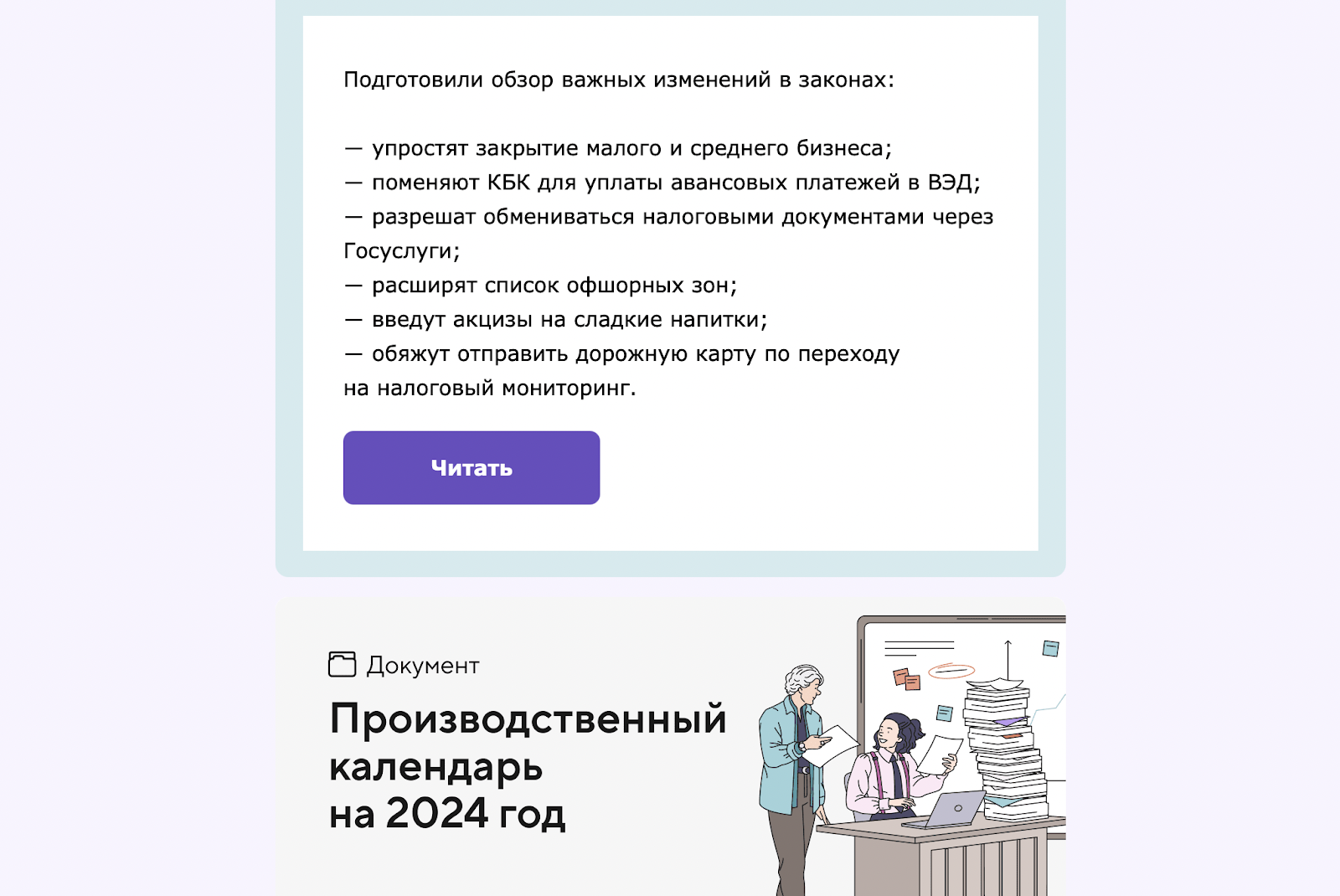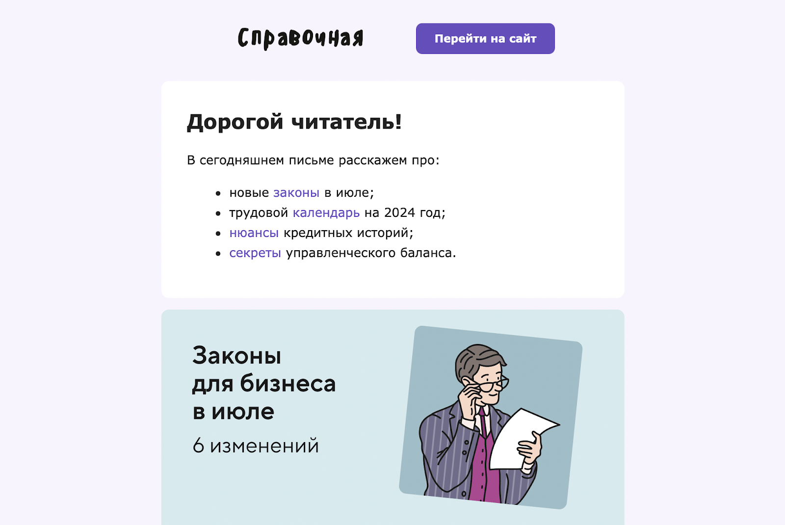 Информационная — сообщает клиенту важные новости о компании, рассказывает о новых продуктах, изменениях в работе, событиях.