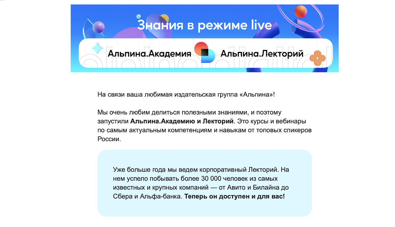 Контентная — это письма с полезными материалами, которые повышают доверие к бренду как к эксперту.