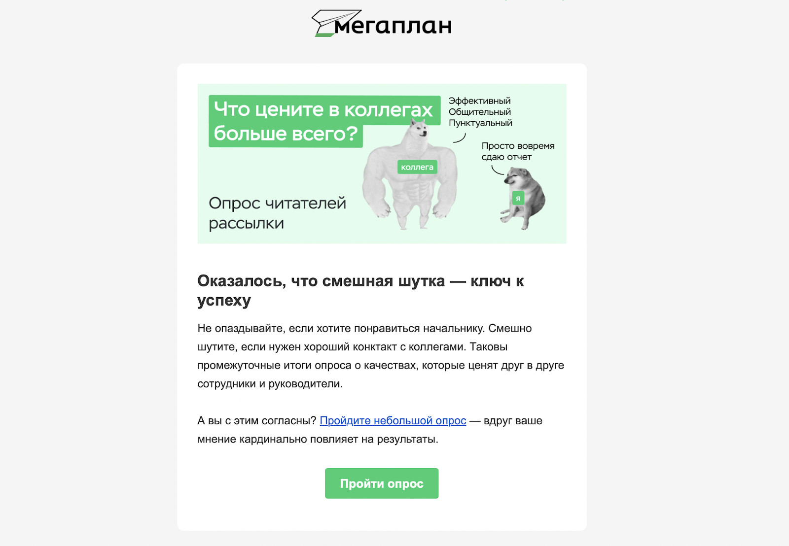 Исследовательская отправка писем применяется, когда компании нужно узнать мнение аудитории: собрать обратную связь по продукту, обслуживанию и так далее.