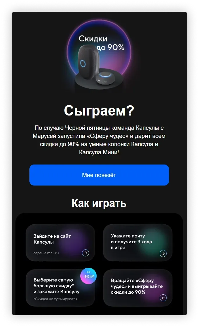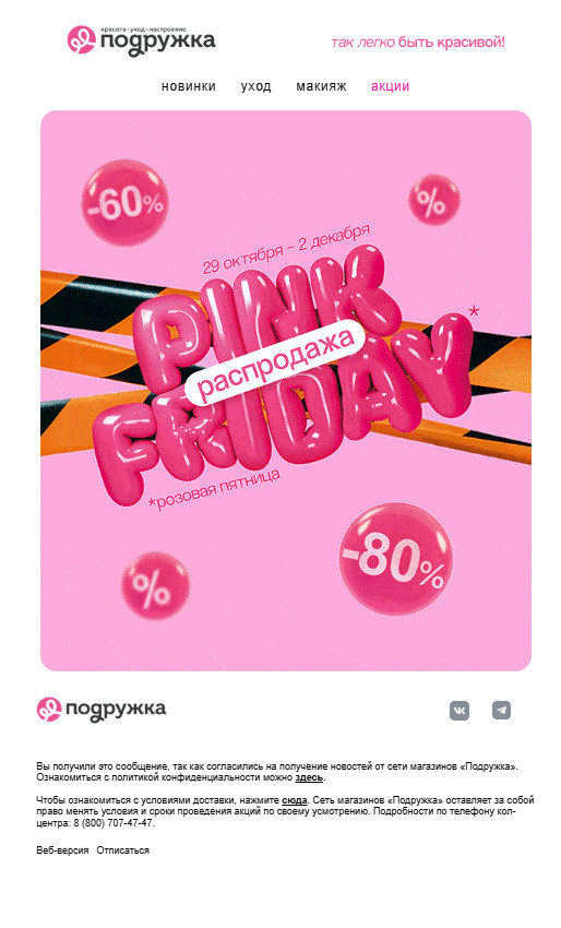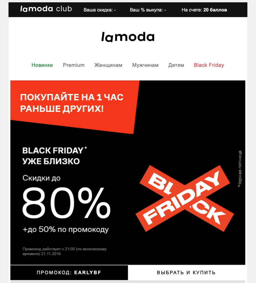 Сложно сказать, сколько длится чёрная пятница, поскольку каждый бренд устанавливает свой период скидок — от одного дня до нескольких недель. Значимость Черной Пятницы для бизнеса заключается в нескольких ключевых аспектах: Black Friday играет важную роль в бизнесе, предоставляя возможность для роста и развития. Обращайте внимание на то, как ваш бренд оповещает об акциях. Очень важно креативно подойти к оформлению всех видов сообщений, а также продумать персонализированные предложения, которые выделят вас среди конкурентов. Емейл рассылки становятся ключом к успеху в период распродаж. Оформление писем играет роль, но не менее важно правильно определить целевую аудиторию. Это позволит создать более персонализированные и целенаправленные маркетинговые сообщения, которые увеличат шансы на повышение конверсии и удовлетворенность клиентов. Например, с помощью Altcraft CDP вы можете сегментировать профили подписчиков и тем самым таргетировать ваши кампании. Подробнее о сегментации читайте в статье «4 модели сегментации клиентов для персонализации контента в 2024 году». Обратите особое внимание на оформление сообщений в Черную Пятницу. Воплощайте самые яркие, креативные и смелые задумки. Вот несколько примеров, которые точно не оставят равнодушными пользователей. Графические и анимационные элементы. Рассылка в период акции должна привлекать внимание и запоминаться, даже если обычно ваш бренд придерживается сдержанного и минималистичного стиля. Не стоит бояться включать самые разные элементы: GIF-анимацию, короткие видеоролики — это всё добавляет динамики и привлекательности. Создавайте карточки с полезными советами или интересными фактами. Эксклюзивные предложения. Ваша рассылка должна быть не только яркой, но и иметь ценность для клиента. Используйте данные о покупках пользователей, чтобы предложить им индивидуальные скидки на товары, которые они уже рассматривали или покупали. Добавьте уникальные промокоды, доступные только для подписчиков. Таким образом вы привлечете новых клиентов и сохраните уже имеющихся. Геймификация. Включите в рассылку возможность выиграть подарочный купон. Это может быть простая игра, например, «поймай скидку». Пользователи будут «искать» бонусы в вашем письме, на сайте или в приложении. Каждый, кто их найдёт, получит приз. Запустите «секретные» акции, которые будут открываться после определённых действий (например, кликов по ссылкам или ответов на вопросы). Такой подход станет интересным способом привлечь внимание вашей аудитории. Интерактивные элементы. Используйте разные формы продвижения товара. Кликабельные таймеры обратного отсчёта, «карусель», кнопки и ссылки для перехода на дополнительные ресурсы (блоги, соцсети или вебинары) и многое другое. Викторины, квизы, опросы. Создайте элементы на основе тем, связанных с вашим бизнесом или отраслью. Включите призы или бонусы для участников, чтобы стимулировать их интерес. Разработайте простые игры или головоломки, которые можно решать прямо в письме. Включите кроссворды или судоку. Любые креативные задумки, которые могут привлечь внимание клиента. Каждый из этих форматов можно адаптировать под специфику вашего бизнеса и ожидания целевой аудитории. Главное — сохранять интерактивность и увлекательность контента, чтобы ваши подписчики с нете