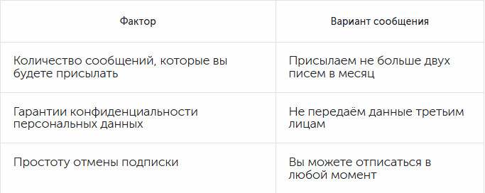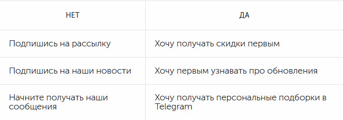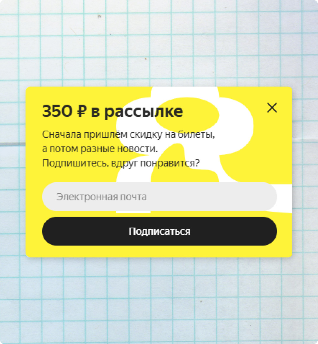 Изучите, как пользователи перемещаются по сайту и другим каналам, и разместите форму подписки там, где её точно заметят: на акционных страницах, в блоге, на этапе оформления заказа или в других точках с высоким вниманием. Используйте данные аналитики, чтобы найти лучший вариант. Настройте pop-up, который появляется через определённое время или при выходе с сайта, когда юзер уже принял решение, подходит ему информация или нет. Для подписок внутри приложений или в мессенджерах сделайте фокус на пользе: скорость получения информации, удобный формат, возможность не пропустить самые выгодные предложения или узнать об обновлениях первым. Много полей для заполнения, специфические данные и несколько шагов для авторизации с подтверждениями — такая форма подписки на рассылку скорее отпугнёт пользователя. Особенно если заполнять нужно каким-то определённым образом, на что уходит лишнее время. Например, если форма не принимает номер телефона без кода страны и его приходится вводить вручную. Сбор дополнительных данных, кроме основных, для простой подписки также не вызывают доверия у пользователей. К примеру, непонятно, зачем оставлять email-адрес, если нужна push-рассылка. Максимально упростите путь клиента и уменьшите время на подписку. Идеально, если процесс занимает несколько секунд. Запрашивайте один контакт — электронную почту или телефон. При необходимости можно дополнительно попросить имя. Для сбора базы push достаточно сделать форму в один клик, где не выставляются никакие дополнительные данные. Важно только своевременно и правильно оформить предложение: объяснить выгоду. Другой вариант — пригласить подписаться, когда клиент оставляет положительный отзыв. Это значит, что он лоялен и с большей вероятностью захочет продолжить коммуникацию с вашим брендом. Хорошо оформленная подписная страница напрямую влияет на рост базы и удержание аудитории. Она должна быть частью общей дизайн-системы, не выглядеть устаревшей и «серой». В современном потоке информации человека постоянно «атакуют» предложениями подписаться. При такой конкуренции за внимание они выбирают только то, что действительно интересно и ценно для них. Поэтому призывы вроде «подпишитесь на новости» или «оставайся с нами» никак не выделяют вас и не мотивируют оставить свой контакт. Человек просто не понимает, зачем ему ещё одна рассылка — и тогда база клиентов не растёт. Важно заранее продумать, какую выгоду получит клиент от подписки — и донести это за считанные секунды, ведь решение принимается быстро. Объясните, для кого предназначена рассылка, чем она полезна и какую проблему помогает решить. Покажите конкретную ценность: бонусы (скидки, чек-листы, баллы, бесплатные материалы), быстрый доступ к информации, персональные предложения и полезный контент. Примеры: Также чтобы собирать подписчиков эффективнее, важно учитывать интересы аудитории и делить её на группы пользователей. Это позволяет создавать более релевантный контент, настраивать персонализированные рассылки и предлагать персональные предложения прямо в форме подписки. На странице рассылки можно указать параметры рассылки, чтобы подписчик сам выбрал, что ему интересно. А с помощью таргетированной рекламы легко привлекать именно целевую аудиторию. Призыв к подписке должен быть заметным и уместным. Пр