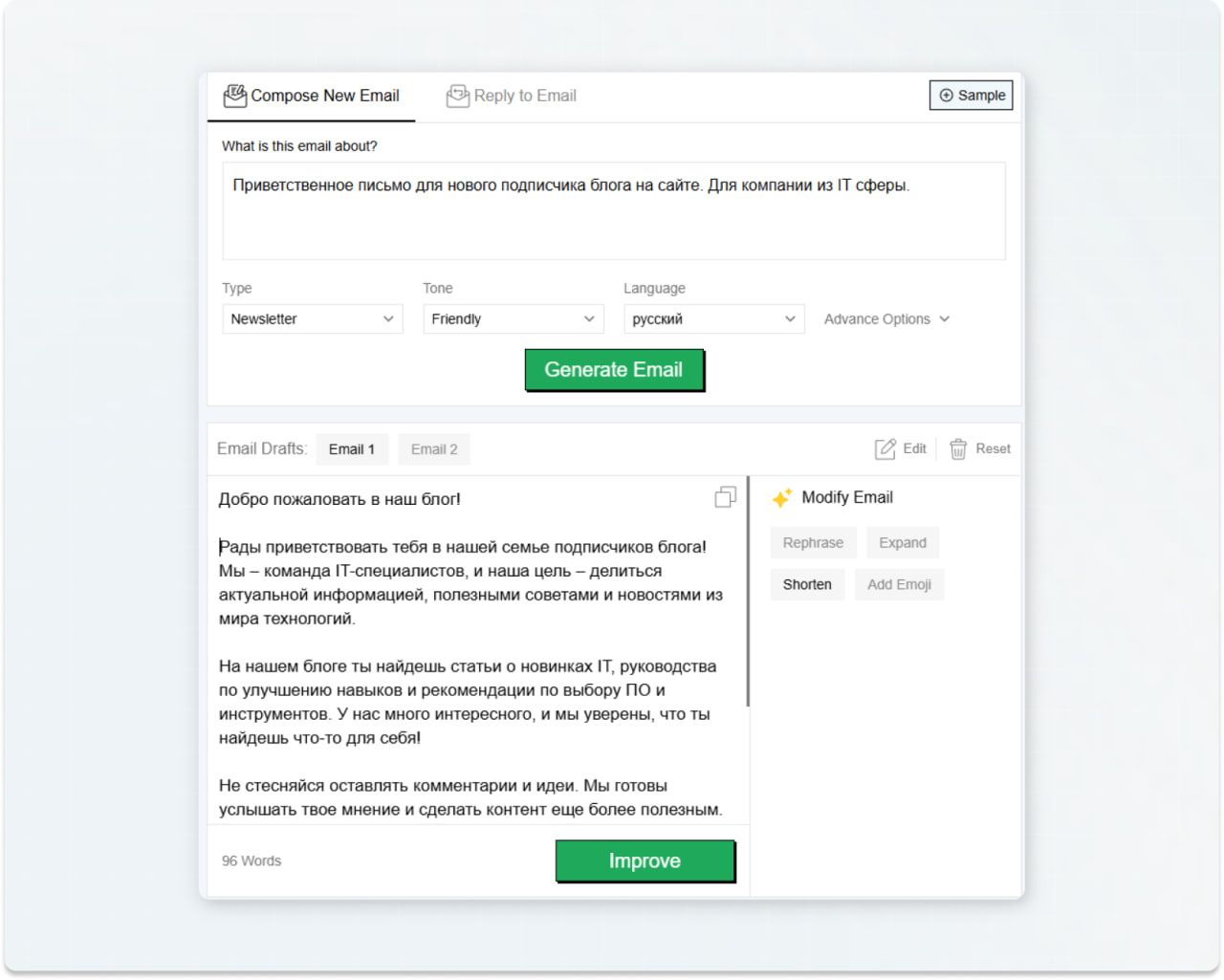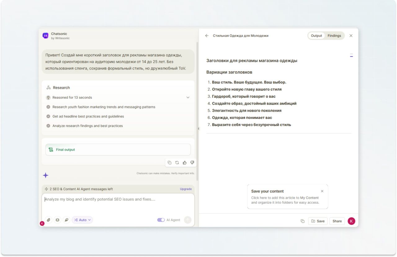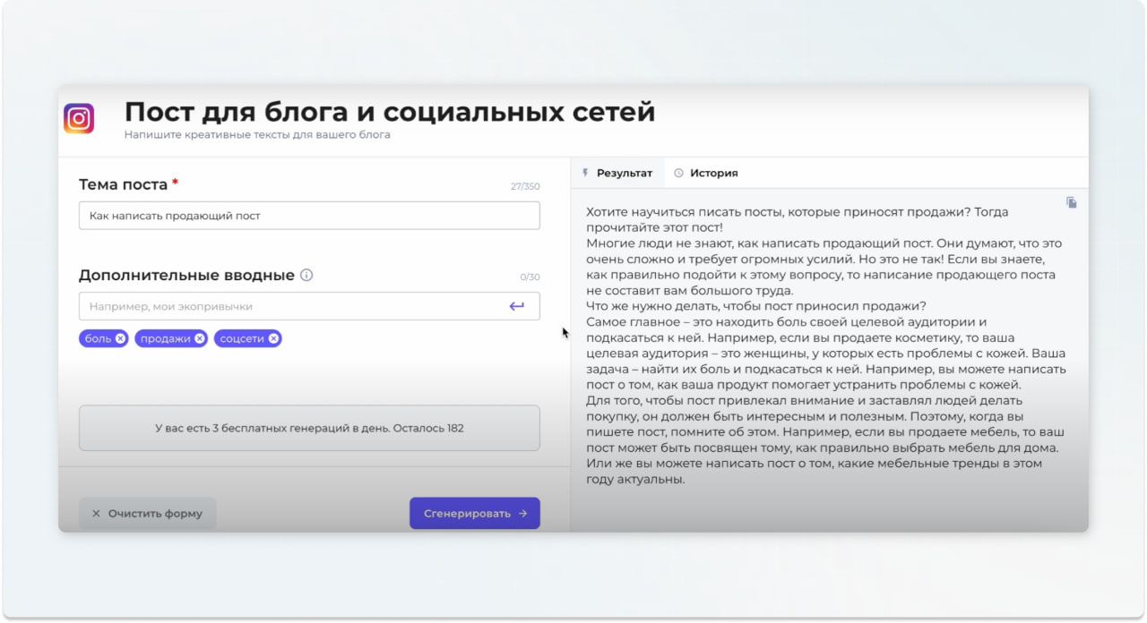 Самая популярная AI-платформа на данный момент. Быстро справляется с рутинными задачами: составлением планов, базовой редактурой, генерацией идей или перефразированием готовых материалов. Мы решили дать ChаtGPT задачу на написание анонса статьи и получили вполне готовый вариант — структурированный, логичный и без грубых ошибок. Плюсы: Минусы: Нужна ли доработка?Да, готовые тексты ChatGPT не идеальны и часто нуждаются в финальной правке. Однако несмотря на это, они служат отличной основой, которую можно довести до совершенства. Инструмент хорошо подойдёт, если нужен быстрый текст для постов, рекламы или баннеров. В Jasper.ai простой интерфейс, много шаблонов и настроек под стиль бренда. Плюсы: Минусы: Нужна ли доработка?Jasper.ai создаёт тексты очень быстро, но они подходят скорее для черновиков и быстрых идей. Поэтому при написании промпта важно уточнять тон, смысл и избегать клише. Универсальный сервис для создания контента: от статей и лендингов до описаний товаров, постов и email-рассылок. В арсенале у него множество шаблонов, поддержка русского языка, интеграции с SEO-сервисами и интуитивно понятный интерфейс. Плюсы: Минусы: Нужна ли доработка?Мы протестировали Writesonic на задаче по генерации короткого заголовка для рекламы магазина одежды. Результат оказался довольно лаконичным, написано по делу, заголовки не требуют серьёзной правки. Однако в отдельных случаях может понадобиться лёгкая редактура, особенно если важны индивидуальные нюансы. Когда речь заходит про бесплатные сервисы ИИ с простым интерфейсом и быстрой генерацией электронных писем, первым на ум приходит Editpad Email Writer. Его главные преимущества — высокая скорость работы и доступность для всех пользователей. Однако это решение больше подходит для типовых задач, где не требуется глубокой персонализации. Например, в запросе на созданиеприветственного письмадля новых подписчиков, инструмент выдал корректный по структуре текст, но без учёта индивидуальности, фирменного стиля и живой интонации. Плюсы: Минусы: Нужна ли доработка?Как правило — да. Editpad Email Writer предоставляет базу, с которой удобно начать, однако для достижения нужного тона, соответствия стилю бренда и целей коммуникации письмо практически всегда требует правок. Сервис экономит время при составлении персонализированных писем для холодной рассылки — в том числе для контактов через LinkedIn или при запросах на обратные ссылки. Он автоматически анализирует данные из профилей, веб-сайтов и других онлайн-источников, чтобы создавать индивидуальные обращения к каждому получателю. Плюсы: Минусы: Нужна ли доработка?Да, несмотря на высокий уровень персонализации, тексты часто требуют проверки и правок. Особенно это касается формулировок, звучащих неестественно, и случаев с неполными исходными данными. ИИ-инструмент, встроенный в платформу Landingi, предназначенный для быстрой генерации текста лендингов. Особенно полезен для маркетологов, которым необходимо быстро создавать посадочные страницы без глубоких знаний в копирайтинге. Плюсы: Минусы: Некоторые функции, такие как A/B-тестированиеи расширенная аналитика, доступны только в платных версиях.Нужна ли доработка?Да, рекомендуется вручную проверять и корректировать сгенерированные тексты. Изначально инструмент создавался для описаний товаров на Amazon, но подходит не только д