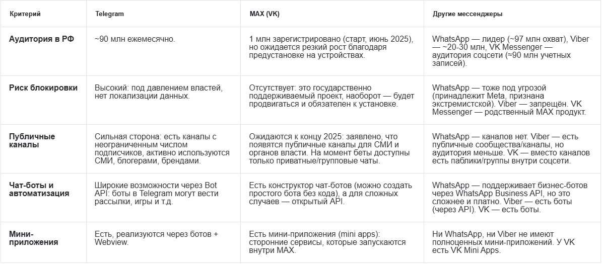 Да, MAX ещё сырой, у него много негативных отзывов, и пока непонятно, сможет ли он конкурировать с Telegram (и мы все надеемся, что его не заблокируют). Но в условиях регулярных блокировок Telegram в разных регионах стоит задуматься о будущем MAX и его возможностях для бизнеса.