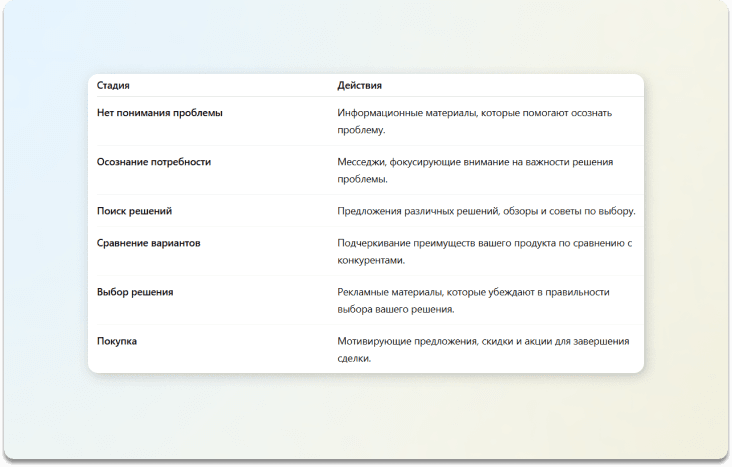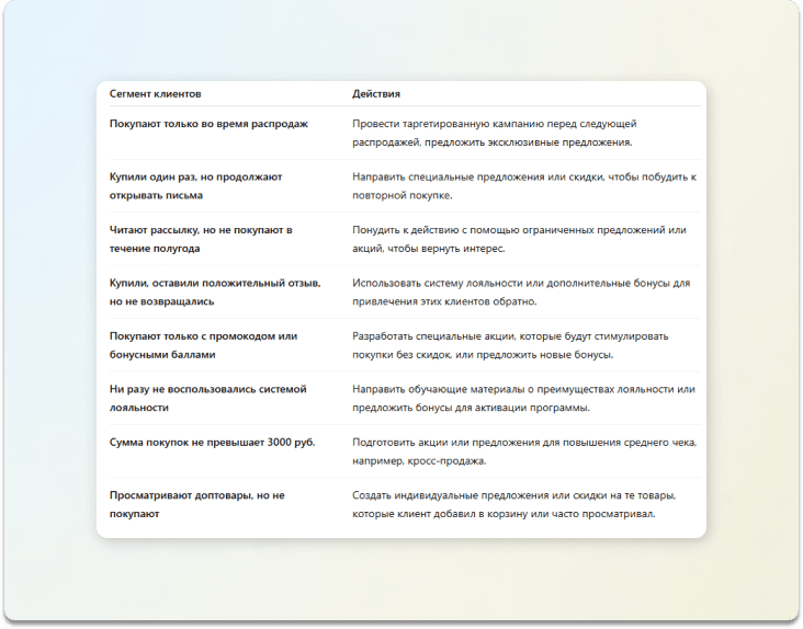 Например, выбираем пол, возраст, локацию, социальный статус. Смотрим только на новых клиентов, которые сделали покупку впервые в прошлом месяце. Возьмём только новых клиентов интернет-магазина одежды из Самары. Тогда сегментация аудитории может выглядеть так: Далее для каждого сегмента делается предположение по потребностям, чтобы создать предложение для рекламной кампании. Но тут появляются проблемы: По примеру выше легко сделать вывод, что деление клиентов на группы по-старому неэффективно. Классические сегменты клиентов ограничивают маркетинг, потому что: При этом не сегментировать аудиторию нельзя, потому что массовые рассылки и предложение «всё для всех» — это ещё больше неопределённости, чем широкие группы клиентов. Сегментация целевой аудитории нужна, но для результата стоит отойти от классического подхода и смотреть на этот процесс шире. Используйте весь объём данных о клиентах. Ниже рассмотрим актуальные виды сегментирования. Группы клиентов выделяется на основе их действий: количестве и частотности покупок, активностям на сайте, реакциям на рекламу бренда, контент, email-рассылки и другие виды коммуникации. Когда знаешь привычки клиентов, легче предложить им подходящие товары и повысить эффективность программ лояльности. Ещё к изучению поведения пользователей относится прогнозирование будущего на основе данных. Это делает управление маркетингом проще. К примеру, если клиент покупает только собачий корм, то возможно подключить предложить дополнительные товары: удобные миски, лакомства для питомца и так далее. RFM— это тип сегментации, который основывается на том, как себя ведут клиенты. Группы формируются по трём основным критериям: RFM выделяет клиентов, которые часто покупают и тратят много, что помогает адаптировать маркетинг под их интересы. С помощью этих трех критериев компания делит своих клиентов на сегменты. Например: К примеру, есть группа клиентов, которые активно и часто покупали, но вдруг прекратили делать заказы в течение трёх месяцев. Самое время узнать причины через опрос и сделать специальное предложение. Выделение групп по жизненному циклу клиента — вариант, который подходит бизнесу с длинным периодом сделки. LTV в таком случае отслеживает всю прибыль, которую пользователь принёс компании за весь период взаимодействия. Так выбираются самые перспективные и лояльные клиенты. Также выделяют другие категории: потенциальные, новые, и те, которые по какой-то причине прекратили коммуникацию с брендом. Каждый клиентский сегмент получает свою стратегию и количество затраченных ресурсов для его привлечения, вовлечения или реактивации. Для активных клиентов подойдут закрытые распродажи, а для потенциальных — подробное знакомство с продуктом. Подход идеален для платформ контента: музыкальных сервисов, онлайн-кинотеатров, видеоплощадок. Сегменты выделяются на основе данных о просмотрах/прослушиваниях. Для каждой группы создаются тематические подборки и другие активности, которые попадают в интересы. Тогда пользователи остаются на платформах дольше и продлевают подписки. К примеру, отдельным сегментом могут стать любители детективных сериалов. Их вовлечение повысится, если, к примеру, делать подборки похожего контента. То есть искать интересное за них. По теории Бена Ханта выделяется путь к