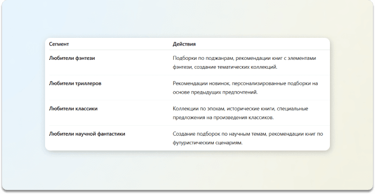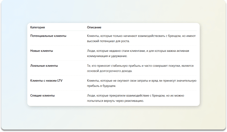 Клиентская база делится на группы, где каждый сегмент отвечает набору критериев, которые определяются заранее.