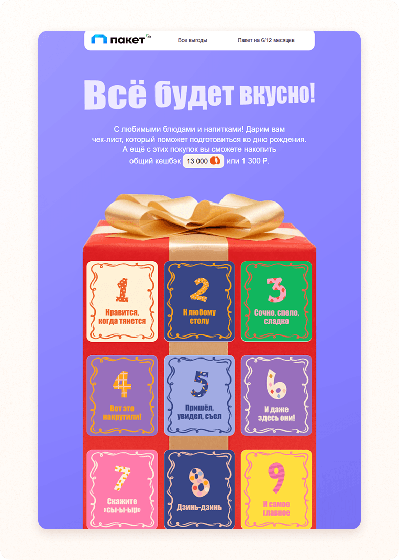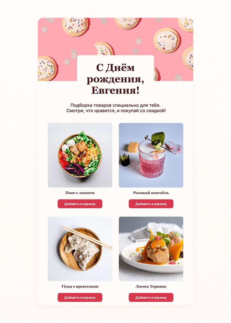 Например, в поздравлении можно не только обратиться к клиенту по имени, но и предложить подходящие ему товары: готовые блюда, напитки или ингредиенты для ужина.