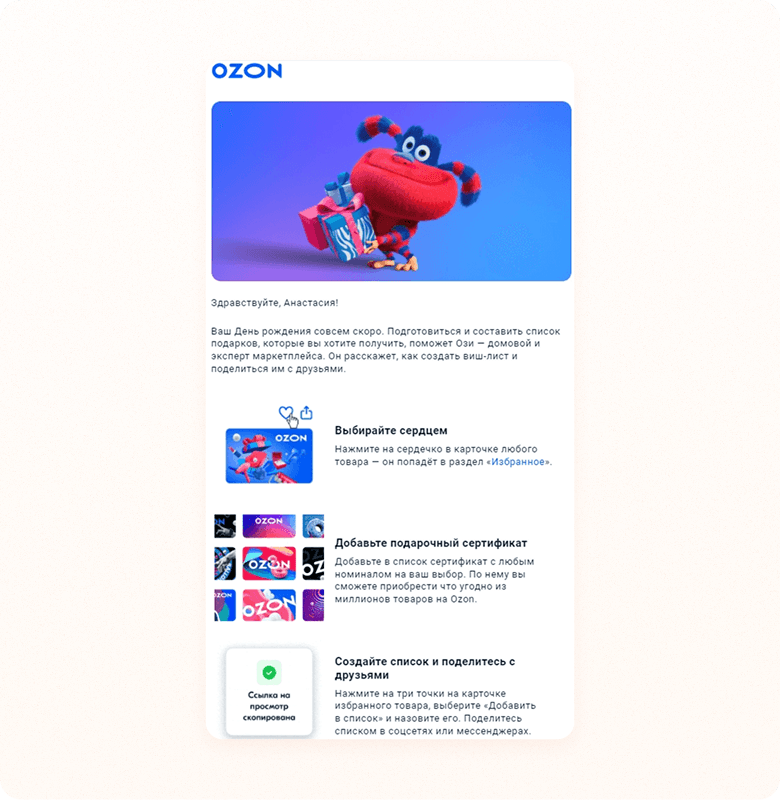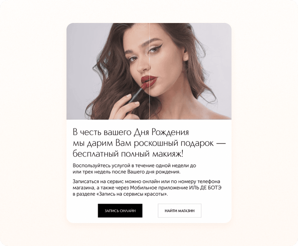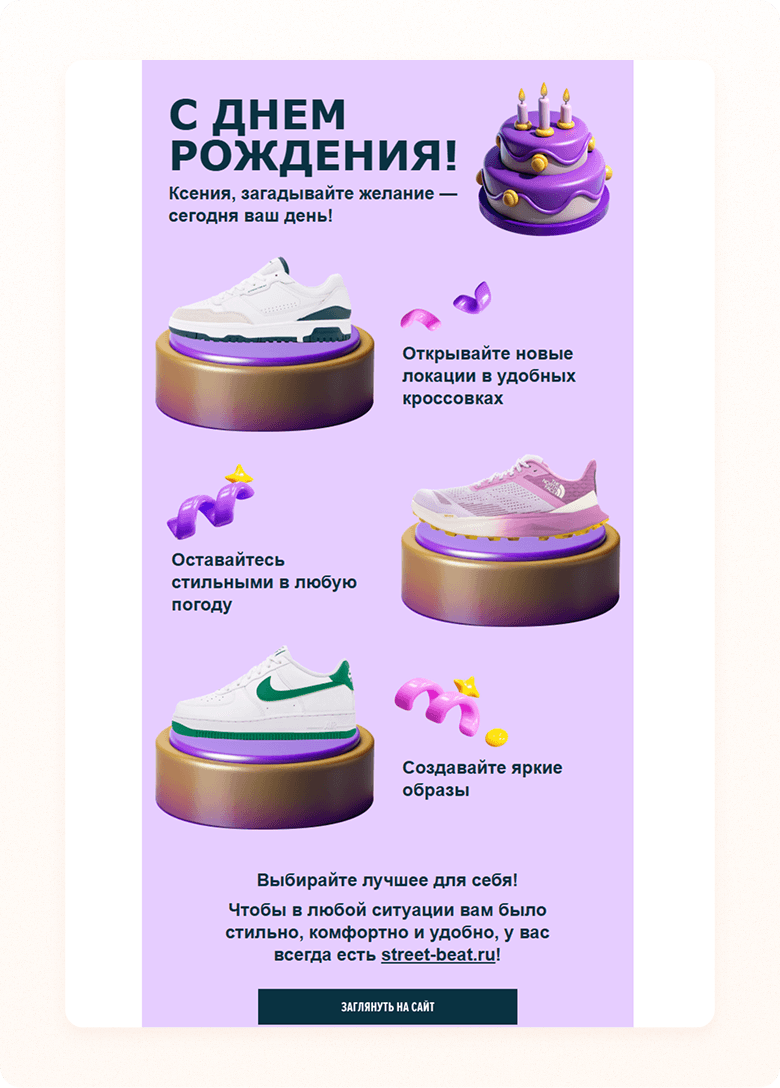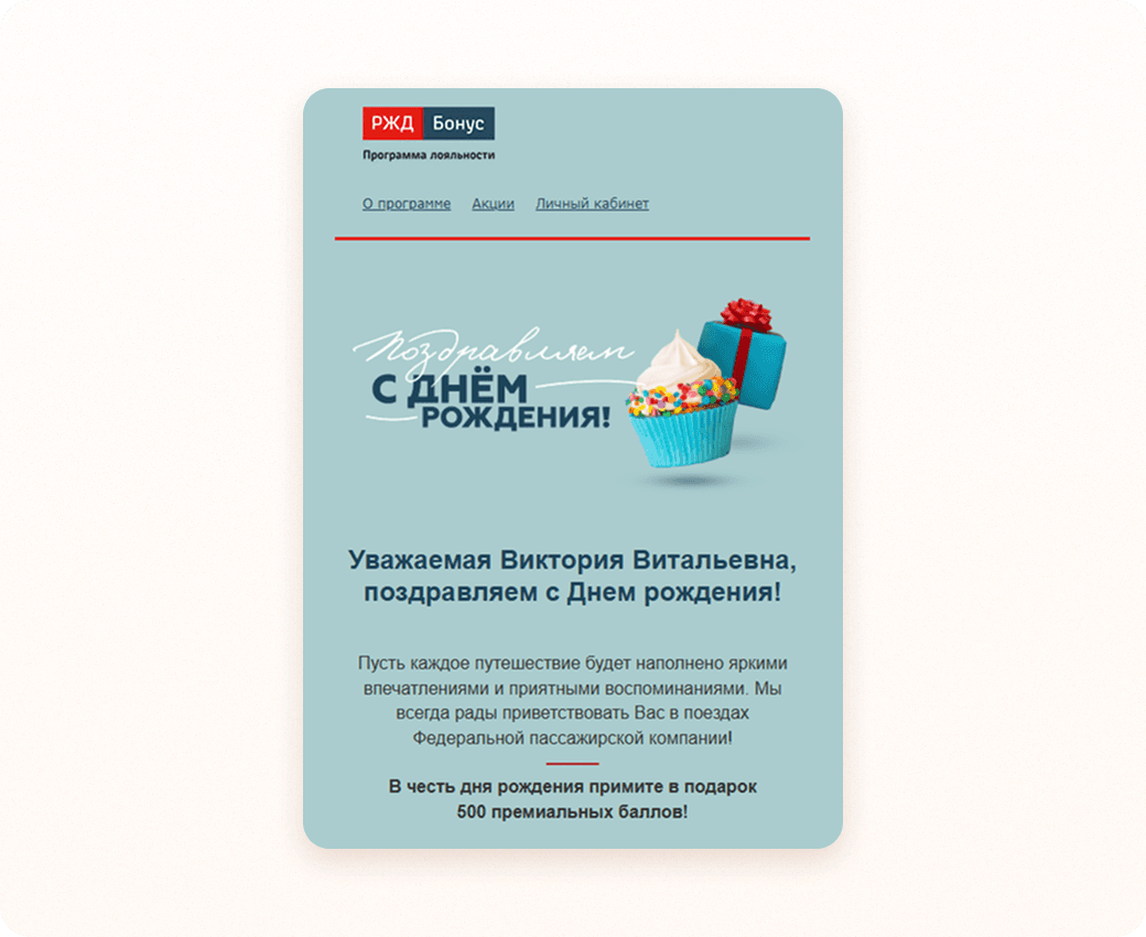 Добавляйте персонализацию. Если вы предложите что-то по-настоящему уникальное, созданное специально для одного человека, то шансы, что это будет встречено с теплом и радостью, многократно увеличиваются. Обязательно обращайтесь к клиенту по имени — это создаёт ощущение личного общения, даже если письмо шаблонное. Если вы подберёте товары или акции, подходящие именно этому человеку, эффект будет значительно лучше.
