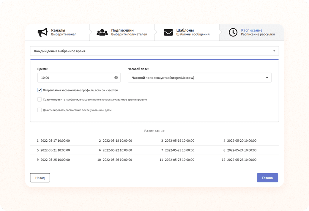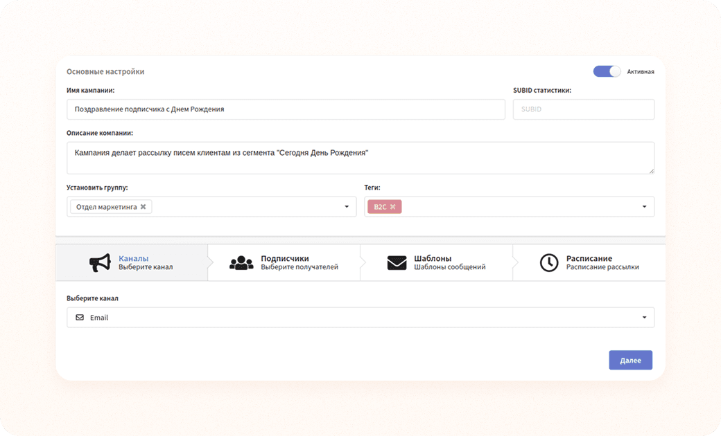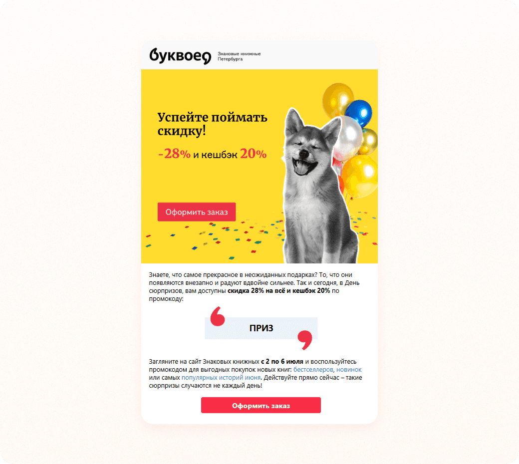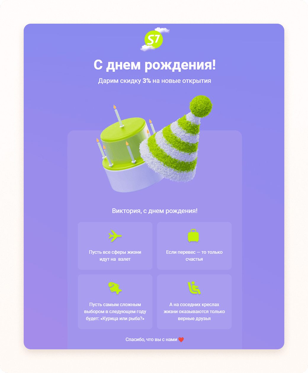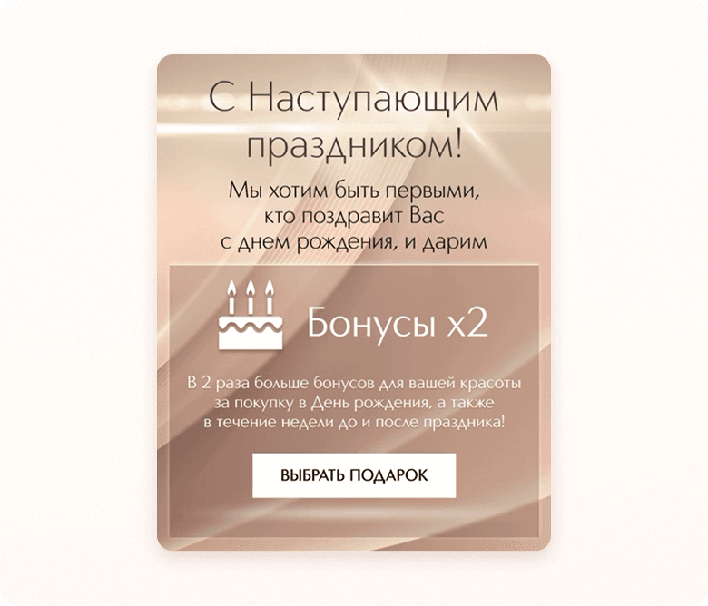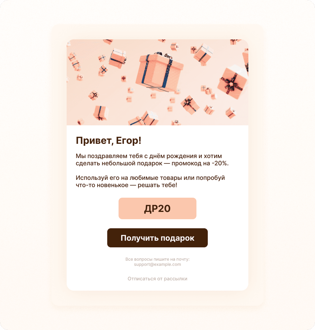 Подумайте о клиенте. Представьте свою почту, заваленную письмами: реклама, спам, работа, личные сообщения. Хочется ли вам ещё одного бессмысленного письма? Убедитесь, что ваше поздравление несёт ценность для человека. Продумайте подарок, акцию, скидку или всё что угодно, чем сможете порадовать. Избегайте банальностей. Забудьте про стандартные пожелания «счастья, здоровья». Далеко не всем подходят такие поздравления, они слишком обобщенные и от лица бренда не выглядят искренними. Изучите свою аудиторию и её ценности, чтобы сделать поздравление уникальным. Иногда достаточно подобрать подходящий подарок, чтобы слова стали лишними. Если вы хотите добиться ощущения личного обращения, а не массовой рассылки, тогда пишите от имени сотрудника или руководителя. Создавайте привлекательный дизайн. Красивые шаблоны на день рождения всегда вызывает больший интерес и положительные эмоции. Красивое поздравление с днем рождения с интерактивом запоминается больше остальных — особенно когда в нем есть промокод и бонусные баллы. Если вы радуете подписчиков такими щедрыми акциями, лучше указать, до какого момента они действуют. Хорошая идея — дополнить это таймером обратного отсчёта. Сегментируйте аудиторию. Если ваши клиенты разнообразны, создайте несколько вариантов писем для отдельных сегментов. Таким образом предложите релевантные бонусы или акции. Например, ювелирным брендам для клиентов 20–25 лет можно предложить акцию «2 по цене 1» на серебряные трендовые украшения, а для аудитории 40+ — скидку на ювелирные наборы с драгоценными камнями в классическом стиле. Такой подход требует больше усилий: нужно подготовить списки подписчиков и разные макеты писем. Но персонализированные предложения значительно повышают вероятность покупок. И это тот уровень, к которому стоит стремиться в e mail рассылках. Поздравляйте заранее. Иногда стоит отправить письмо поздравление с днем рождения до самого праздника. Многие клиенты ждут акций, чтобы купить что-то нужное. А в сам праздник сообщение может остаться незаметным или быть уже неактуальным. Не повторяйтесь. Одинаковое письмо поздравление с днем рождения каждый год — верный способ потерять лояльность. Меняйте хотя бы текст или оформление, а лучше и подарки. Делайте акцент на клиенте, а не собственном бренде. Не перегружайте письмо — добавьте максимум одну-две акции. Поздравление должно напоминать открытку, а не каталог. Настройте триггерные рассылки, чтобы поздравления приходили вовремя. В Altcraft Platform легко настраиваются автоматические письма с персонализацией. С маркетинговой платформой вы можете автоматизировать не только поздравления, но и весь цикл общения с клиентом, добавив email, push и SMS. Используйте разные каналы.Не ограничивайтесь только email. Чем разнообразнее касания, тем выше шансы, что поздравление заметят и запомнят.Для коротких сообщений подойдут: Пример, как можно охватить несколько каналов: Так вы не только поздравите клиента, но и грамотно увеличите охват. Покупатели всегда ценят скидки и спецпредложения — именно ради этого многие подписываются на рассылки и продолжают за ними следить. Такой формат не только приятен, но и мотивирует к быстрому действию. Большинство клиентов ожидают именно этого. Начислите бонусные баллы в честь дня рождения — без условий, просто так. Такой по