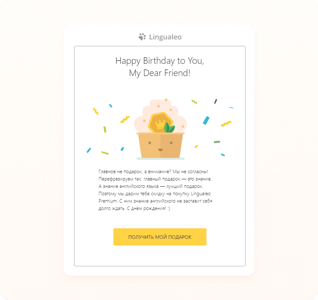 Подписчики знают, что ваши поздравления отправляются автоматически, и это их не смущает. Но скучные, шаблонные письма всё равно плохая идея. Если вы готовите е мейл рассылку заранее, сделайте её более интересной и креативной. Поздравляйте с умом и ценностью.