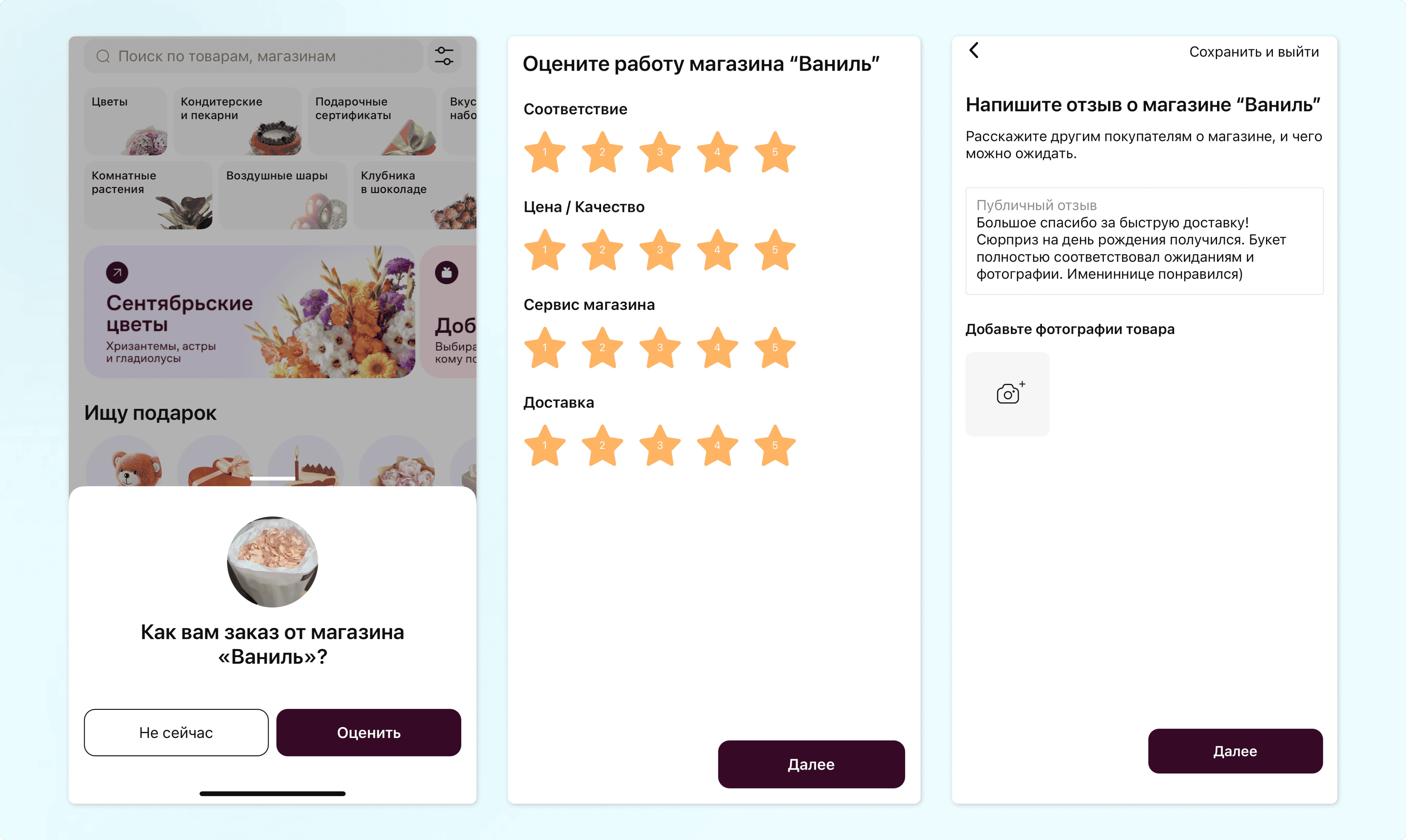 Запрос обратной связи зависит от продукта или услуги. Какие-то то возможно оценить сразу, другие — через некоторое время использования.