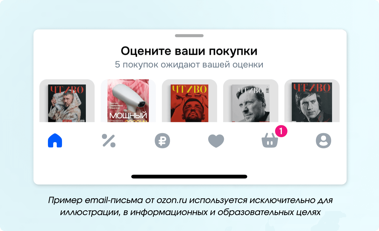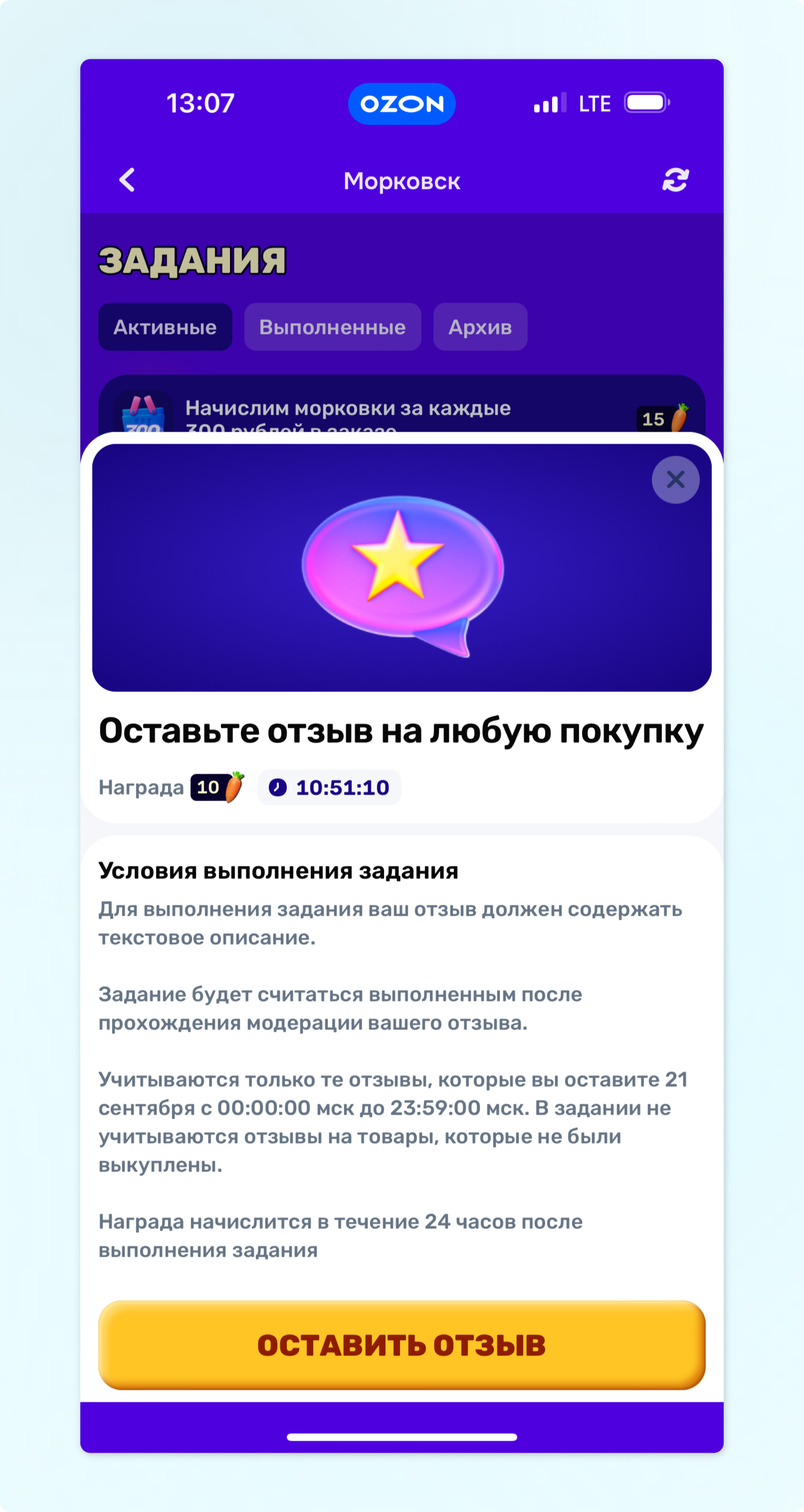 Сразу. Вариант, когда клиенту приходит сообщение с запросом на отзыв после покупки или через один-два дня. Ещё будет актуален «момент радости» от приобретения, и человек с большей вероятностью поделится впечатлением. Например, такой вариант возможен после доставки букета цветов. Через неделю или две. Актуально для товаров, которые надо попробовать. Например, чтобы оценить удобство новых кроссовок, в них нужно сходить на тренировку. После положительной оценки. Если у вас есть форма с баллами/звёздами и прочими шкалами для пользовательского фидбэка, то они могут стать промежуточным этапом в получении текстового отзыва. Если человек уже среагировал хорошо, то попросите его оставить более развёрнутый ответ. Когда клиент возвращается. Человек, который вернулся за покупкой, скорее всего, доволен вашим продуктом или услугой. Такой лояльный пользователь охотно оставит отзыв о том, что ему понравилось. Какие есть варианты: Email-рассылка. После покупки или в установленное время запускается отправка сообщений с запросом обратной связи. Рассылки коротких сообщений. Отзывы можно собирать через SMS, пуш-уведомления или прямо внутри мобильного приложения, общаясь с пользователем через встроенный интерфейс. QR-коды. Актуально для офлайн-бизнесов: магазинов, ресторанов, салонов красоты и других. QR перенаправляет на основной канал для размещения отзывов: сайт, карты, страницы в соцсетях и так далее. Также код размещается на упаковках и в чеках. Телефонный опрос. Есть и такой способ сбора отзывов: после покупки клиенту звонят и задают вопросы о товаре и сервисе. Более простой вариант — оценка по цифровой шкале. Этот процесс можно автоматизировать, когда звонит не оператор, а робот. Просто попросить. Клиенты редко думают о том, что компании нужны отзывы. Обычно они пишут только в случае недовольства. Поэтому важно напомнить им, что есть возможность оставить мнение, и сразу дать ссылку на нужный ресурс. Объяснить важность. Если объяснить, что обратная связь помогает развивать продукт и делать сервис удобнее, довольные клиенты охотнее её оставят. Предложить подарок. За отзывы можно давать бонусы: скидки, бесплатные материалы или товары, участие в розыгрышах и доступ к закрытым акциям. Форматы разные. Например, отзыв может быть шагом в прогресс-баре внутри программы лояльности или частью отдельной рекламной кампании. Ozon начисляет баллы за отзывы. Фидбэк с фото и видео ценится выше: Отзыв также бустит продвижение по шкале для розыгрыша: Делать чёткий CTA. Призыв к действию стоит написать максимально понятно и однозначно. Не усложнять. Никаких сложных регистраций, условий и вопросов, над которыми надо долго думать. Всё просто и ясно. Персонализировать. Учитывайте контекст и историю покупок клиента, чтобы правильно запросить отзыв. Личное обращение, благодарность за лояльность значительно увеличивают шансы на фидбэк. На сайте. Есть разные способы: дать пользователю оставить их прямо на странице, добавить скриншоты из других площадок или настроить автоматическую загрузку, например, с карт. В рассылках. Отзывы можно приложить к емейлам. Это нужно, чтобы сработал триггер социального доказательства: «если эти люди доверяют, то я тоже буду». В FAQ. Проанализируйте отзывы и соберите самые частые проблемы и вопросы клиентов. Подготовьте блок с ответами FAQ для 