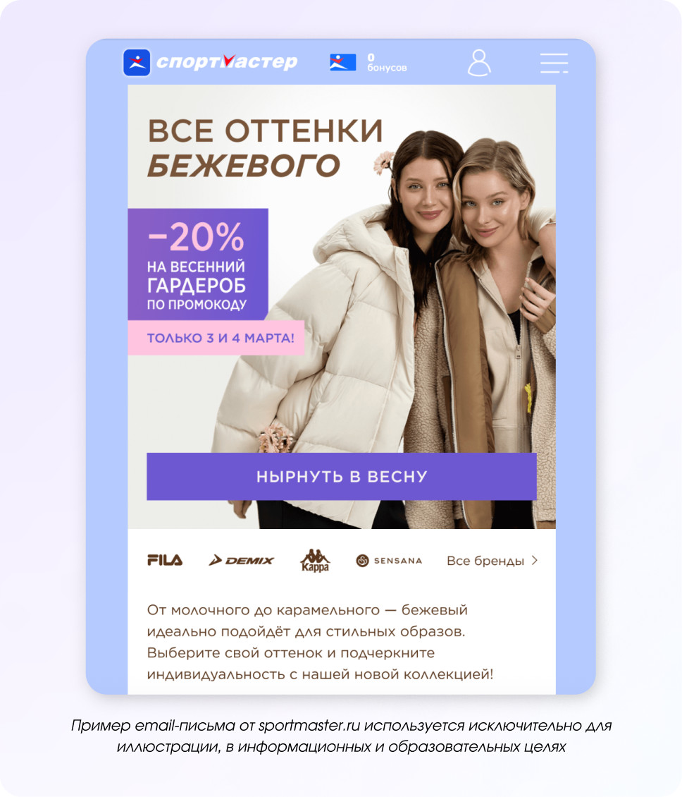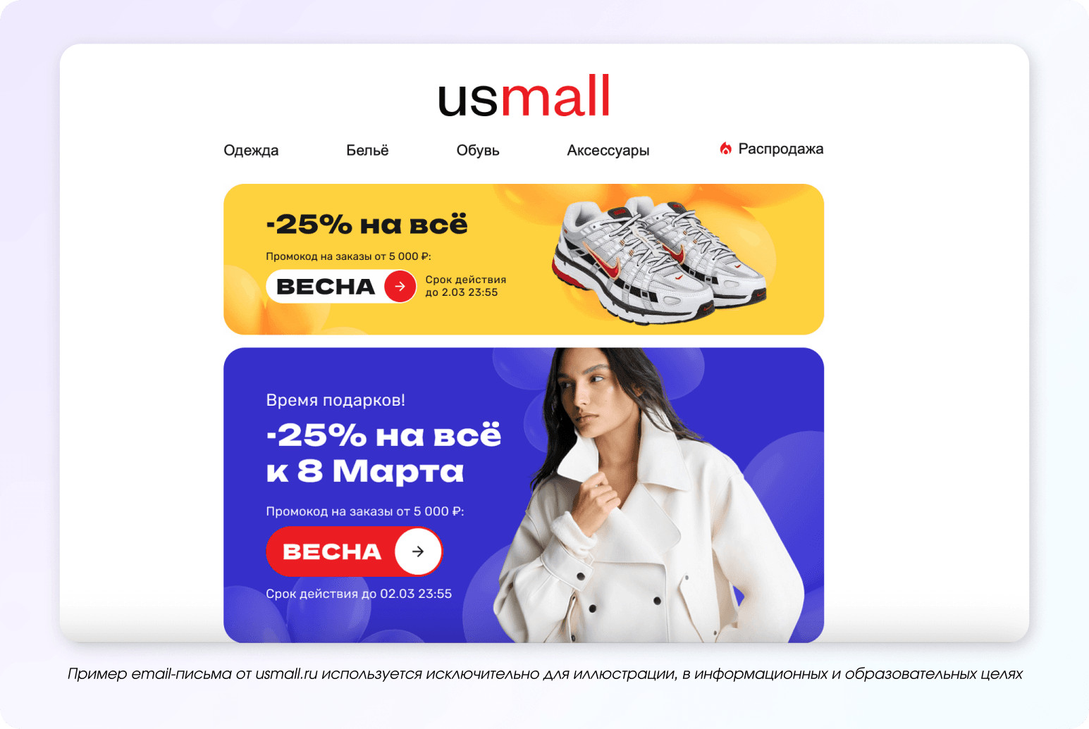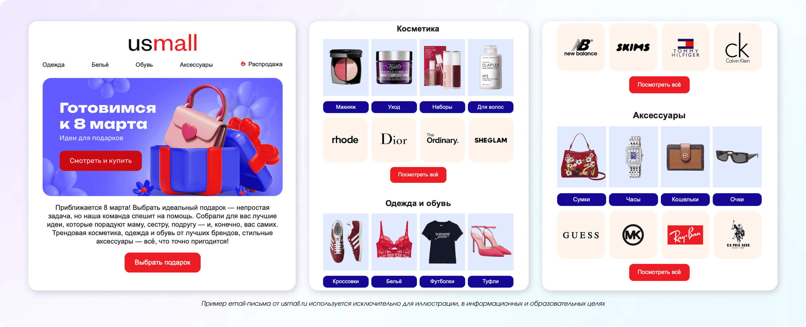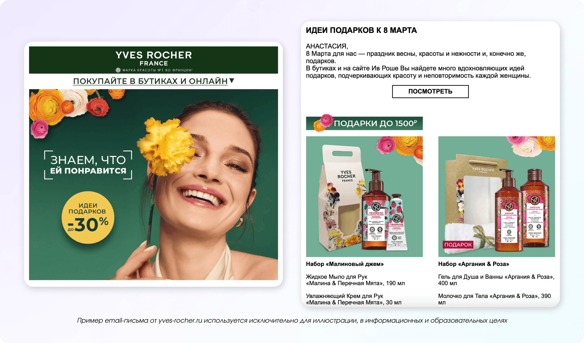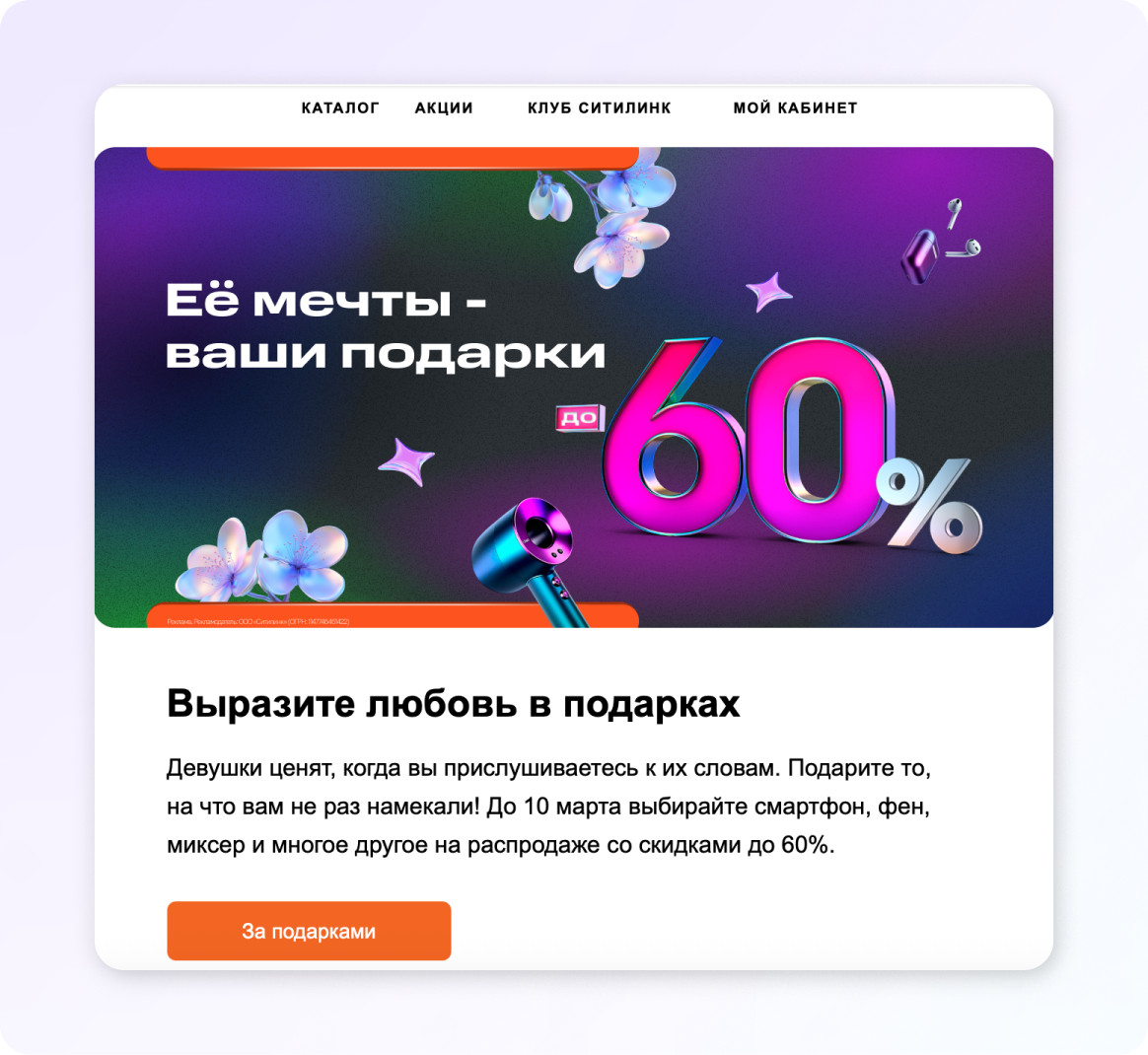 Всегда актуальная рассылка, которая используется каждый год. При этом возможны не прямые скидки, а интерактивный формат. Например, когда нужно собрать нужное количество наклеек. Маркетплейс товаров из-за границы предлагает значительные скидки от 25%. Причём рассылка начинается ещё в феврале. Учитываются сроки доставки, поэтому акция заканчивает действовать уже в начале марта. Акция со скидками всего на три дня — тоже повод для рассылки. Ограничение по времени замотивирует купить быстрее. Дизайн с цветами настраивает на нужное настроение. Возможно сделать подборку по потребностям и категориям: полезные, популярные, для путешественников. И подсказать, что эти подарки можно купить с кешбэком. Маркетплейсам выгодно делать подборки с женскими товарами: косметикой, одеждой, красивой обувью, аксессуарами. Главное, чтобы не уходить в гендерные стереотипы и делать предложение ненавязчиво. Вариант рассылки, которая объединяет сразу несколько приёмов: весенние скидки, ограничение по времени в два дня и идеи подарков. Вместо обычного списка товаров бренд оформил идеи подарков нестандартно — через личные впечатления команды. Причём подборкой делятся мужчины, которые выбирают украшения для женщин, и это добавляет формату живости и доверия. Дополняет всё аккуратная, эстетичная подача — в узнаваемом стиле бренда. В итоге получается не каталог, а история, за которой интересно следить. Косметический бренд предлагает готовые наборы для подарка. В письме используется персонализация: пользователя называют по имени, а также учитывают обычную сумму покупок. Идеи предлагаются именно под такой бюджет. К 8 марта хорошо работают рассылки с напоминаниями о подарках для любимых женщин. Такие сообщения вовремя подталкивают к покупке и упрощают выбор, особенно для тех, кто откладывает решение до последнего момента. Магазин техники даёт значимую скидку и предлагает варианты в разных ценовых категориях. Весна — естественный и близкий к празднику инфоповод, с которым легко поиграть креативно. Необязательно напрямую привязываться к дате: можно обыграть сезон, обновление гардероба или настроения. Например, бренд сумок сделал подборку моделей в «весенних» цветах и добавил на них скидки. Выглядит свежо, уместно и без шаблонных поздравлений. Сервис с обучающими курсами объединил начало весны и праздничный период в одно предложение — сделал специальные цены на обучение. Сезон здесь обыгрывается как время обновления и новых стартов, когда особенно хочется попробовать что-то новое или прокачать навыки. Такой контекст выглядит естественно и хорошо мотивирует записаться на курс. Праздничные рассылки подходят и для продвижения мероприятий. Например, театр запустил акцию со скидками на спектакли в дни перед 8 марта и рассказал об этом в письме. Чтобы подтолкнуть к быстрому решению, в рассылку добавили таймер с ограничением по времени. Такой приём создаёт ощущение срочности и стимулирует купить билет сразу. Праздник — это не только про подарки, но и про впечатления, совместный отдых и атмосферу. Поэтому в рассылках можно не продавать напрямую, а подсказывать идеи: куда сходить, где провести время или как устроить небольшой праздник для себя и близких. Например, авиакомпания предлагает не просто билеты, а готовые сценарии поездок — с маршрутами и подск
